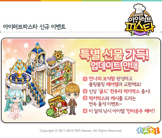 ÆÄƼ°ÔÀÓÁî´Â Àڻ簡 °³¹ß ¹× ¼ºñ½ºÇÏ´Â ·¹½ºÅä¶û °æ¿µ SNG ¡®¾ÆÀÌ·¯ºêÆÄ½ºÅ¸ for Kakao¡¯°¡ °¡À»À» ¸Â¾Æ °í±Þ½º·´°í È·ÁÇÑ ·¹¾î ¾ÆÀÌÅÛÀ» Áö±ÞÇÏ´Â º¸¼® ¼öÁý À̺¥Æ®¸¦ ÁøÇàÇÑ´Ù°í 1ÀÏ ¹àÇû´Ù. ¿À´Â 11ÀϱîÁö °ÔÀÓ ³» NPC ij¸¯ÅÍ Áß ÇϳªÀÎ ¡®¾È³ª¡¯ÀÇ º¸¼®ÇÔÀ» ¿Ï¼ºÇÏ¸é º¸»ó ¾ÆÀÌÅÛÀ» ȹµæ ÇÒ ¼ö ÀÖ´Ù. º¸»ó ¾ÆÀÌÅÛÀ¸·Î´Â È·ÁÇÑ µðÀÚÀÎÀÌ µ¸º¸ÀÌ´Â ¡®¾È³ªÀÇ ÃÊ»óÈ¡¯, ¡®ºí·çº§ºª Àå½Ä´Þ°¿¡¯ µîÀÇ ·¹¾î ¾ÆÀÌÅÛÀ» Æ÷ÇÔÇØ ¡®´ÞÄÞÇÑ Æ¼Å¸ÀÓ¡¯, ¡®Å䳢ĿÇÃÀÇ ´Þºû´Ù¶ô¡¯, ¡®°æÇèÄ¡ Ä«µå¡¯ µîÀÌ ·£´ý Áö±ÞµÈ´Ù. º¸¼®ÇÔ 60ȸ ¿Ï¼º À¯Àú¿¡°Ô´Â °í±Þ½º·¯¿î µðÀÚÀÎÀÇ ¡®ºí·çº§ºª º¹Ãþ°è´Ü¡¯À» 100% Á¦°øÇÑ´Ù. º¸¼®ÇÔÀº °ÔÀÓ Ç÷¹À̸¦ ÅëÇØ º¸¼®À» ¸ð¾Æ ¿Ï¼ºÇÏ¸é µÈ´Ù. ÄÁÃ߸® Å׸¶ÀÇ °ñµå ·°Å°¹Ú½ºµµ ½Å±Ô Ãâ½ÃÇÑ´Ù. ¡®ÄÁÃ߸® ·°Å°¹Ú½º¡¯ ±¸¸Å ½Ã ·¹¾î ¾ÆÀÌÅÛÀÎ ¡®ÄÁÃ߸® ÆÒÆ®¸®¡¯¿Í ¡®¿þ½ºÅÏ º¸ÀÌ Çì¾î¡¯, ¡®¿þ½ºÅÏ ÀçŶ¡¯, ¡®¿þ½ºÅÏ ½ºÅ°´ÏÁø¡¯, ¡®¿þ½ºÅÏ º¸ÀÌ ¾ó±¼¡¯ µîÀ» Æ÷ÇÔÇØ ÃÑ 12Á¾ÀÇ ¾ÆÀÌÅÛ Áß 1°³¸¦ ·£´ýÀ¸·Î ¹ÞÀ» ¼ö ÀÖ´Ù. ·°Å°¹Ú½º ¿Ü¿¡µµ 9¿ùÀÇ ³¬½Ã ¾ÆÀÌÅÛÀ¸·Î ½Å±Ô ¡®¸Ó¸ÞÀ̵å Çì¾î¡¯¸¦ ¼±º¸ÀδÙ. 9¿ù 4ÀϱîÁö ¡®¿ø´õ·£µå ÆÄ½ºÅ¸ º¸°üÇÔ¡¯, ¡®´Üü¼Õ´Ô ¸¸´ÉÁ¶¸®±â±¸¡¯ ±¸¸Å ½Ã °¢°¢ 2+1, 1+1 ÇýÅÃÀ» Á¦°øÇϸç, 11ÀϱîÁö ¡®7ij½Ã¡¯¿Í ¡®·ÎÄÚÄÚ ·°Å°¹Ú½º¡¯¸¦ Áö±ÞÇÏ´Â ¿¬¼Ó Ãâ¼® À̺¥Æ®¸¦ ÁøÇàÇÑ´Ù. ¶ÇÇÑ À̺¥Æ® ±â°£ ij½Ã ÃæÀü À¯Àú¿¡°Ô´Â ±¸¸Å »óǰ¿¡ µû¶ó ¡®¿£Æ½ ·°Å°º£º£¡¯, ¡®³ëºí¿£Æ½ ÆÄ½ºÅ¸¸Ó½Å¡¯ µîÀ» º¸»óÀ¸·Î Áö±ÞÇÑ´Ù. 13ÀϱîÁö °¡À»¿¡ ¾î¿ï¸®´Â Å׸¶ 2Á¾À» ¼±Á¤ÇØ 30% ÇÒÀÎ ÆÇ¸ÅÇÏ´Â °ÍÀº ¹°·Ð 9¿ù ÇÑ´Þ °£ ÁÖ¸»¸¶´Ù ³· ŸÀÓ°ú Àú³á ŸÀÓ ´Ù¾çÇÑ ¹öÇÁ À̺¥Æ®¸¦ ÁøÇàÇÑ´Ù. ¡®¾ÆÀÌ·¯ºêÆÄ½ºÅ¸ for Kakao'¿¡ ´ëÇÑ ÀÚ¼¼ÇÑ »çÇ×Àº °ÔÀÓ °ø½Ä Ä¿¹Â´ÏƼ(http://cafe.naver.com/ilovepastamo bile)¿¡¼ È®ÀÎ °¡´ÉÇÏ´Ù.