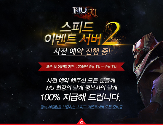 À¥Á¨ÀÇ ´ëÇ¥ PC MMORPG ¡¯¹Â ¿Â¶óÀΡ¯°ú ¡®¹Â ºí·ç¡¯°¡ ¡®½ºÇǵå À̺¥Æ® ¼¹ö2¡¯·Î °ÔÀÓ È¸¿ø È®´ë¿¡ ³ª¼¹´Ù. À¥Á¨Àº ¾îÁ¦(9¿ù1ÀÏ)ºÎÅÍ ¸¶ÀÌÅ©·Î»çÀÌÆ®(http://event.muonline.co.kr/SpeedOpen2/)¿¡¼ ¡®½ºÇǵå À̺¥Æ® ¼¹ö2¡¯ ÀÌ¿ë Èñ¸ÁÀÚµéÀ» À§ÇÑ »çÀü¿¹¾à ½Åû Á¢¼ö¿Í ÇÔ²² Âü°¡È¸¿øµéÀ» À§ÇÑ À̺¥Æ®¸¦ ÁøÇàÇϰí ÀÖ´Ù. ¡®¹Â ·¹µå¡¯¿Í ¡®¹Â ºí·ç¡¯ÀÇ ¡®½ºÇǵå À̺¥Æ® ¼¹ö2¡¯´Â 9¿ù 8ÀϺÎÅÍ 10¿ù 13ÀϱîÁö ¾à 5ÁÖ°£ ¿î¿µµÇ¸ç, Á¤½Ä ¼¹öº¸´Ù ³ôÀº °æÇèÄ¡¿Í ¾ÆÀÌÅÛ È¹µæÀ¸·Î ÃÖ´ë 600·¹º§±îÁö ºü¸¥ ·¹º§¾÷ÀÌ °¡´ÉÇÑ À̺¥Æ® ¼¹ö´Ù. ¶ÇÇÑ ¼±Çà ij¸¯ÅÍ ·¹º§¾÷ Á¶°ÇÀÌ ºÙÀº ¸¶°Ë»ç/´ÙÅ©·Îµå/·¹ÀÌÁöÆÄÀÌÅÍ/±×·Î¿ì·£¼ µî 2Â÷ ij¸¯Å͵鵵 Á¦ÇÑ ¾øÀÌ »ý¼ºÇÒ ¼ö ÀÖ¾î ´Ù¾çÇÑ Ä³¸¯ÅÍ À°¼ºÀ» Áñ±â´Â ȸ¿øµéÀ» À§ÇÑ ÃÖÀûÀÇ È¯°æÀ» Á¦°øÇϰí ÀÖ´Ù. À¥Á¨Àº ÇØ´ç ¼¹ö¿¡¼ ij¸¯ÅÍ ·¹º§ 500À» ´Þ¼ºÇÑ ½Å±Ô/º¹±Í ȸ¿øÀ» ´ë»óÀ¸·Î Á¤½Ä ¼¹ö ÀÌÀü ½Ã Á¦°øÇÏ´Â 1°³¿ù Ç® ij½Ã ¾ÆÀÌÅÛÀ» Áö¿øÇÏ°í ·¹º§ ´Þ¼º¿¡ µû¶ó Á÷¾÷º° ¼¼Æ® ¾ÆÀÌÅÛ°ú ³¯°³, ¹«±â µî ´Ù¾çÇÑ °ÔÀÓ ¾ÆÀÌÅÛÀ» Áö±ÞÇØ ȸ¿øµéÀÇ ¸¸Á·µµ¸¦ Å©°Ô ³ôÀÏ ¿¹Á¤ÀÌ´Ù. À̿ܿ¡µµ À¥Á¨Àº ¡®½ºÇǵå À̺¥Æ® ¼¹ö2¡¯ ³» ¾ÆÀÌÅÛ È¹µæ È®·üÀ» 10¹è·Î »óÇâ ½ÃÄ×À¸¸ç ¡®¹Â ·¹µå¡¯¿Í ¡®¹Â ºí·ç¡¯ÀÇ °æÇèÄ¡¸¦ °¢°¢ 3.5¹è, 3¹è¾¿ »ó½Â½ÃÄÑÁÖ´Â µî °ÔÀ̸ӵéÀÇ º¸´Ù ºü¸¥ ·¹º§¾÷ ȯ°æÀ» Á¦°øÇÑ´Ù. ÇÑÆí, À¥Á¨Àº ¿À´Â 9¿ù Áß ¡®¹Â ¿Â¶óÀΡ¯ÀÇ °æ»óµµ Áö¿ª ±æµåȸ¿øµéÀ» ÃÊ´ëÇØ ¿î¿µÀÚµé°ú ÇÔ²²ÇÏ´Â ½Ã°£À» °¡Áú ¿¹Á¤ÀÌ´Ù. À̹ø Çà»ç´Â ¿À·£ ±â°£ ¡®¹Â ¿Â¶óÀΡ¯À» Áñ±â°í Ȱ¹ßÇÑ ±æµåȰµ¿À» ÆîÃĿ °ÔÀÓ È¸¿øµé¿¡°Ô º¸´äÇÏ´Â Àǹ̷Π¸¶·ÃµÆ´Ù. À¥Á¨ÀÇ ´ëÇ¥ MMORPG ¡®¹Â ¿Â¶óÀΡ¯ÀÇ °ÔÀÓ Á¤º¸¿Í À̺¥Æ®¿¡ ´ëÇÑ º¸´Ù ÀÚ¼¼ÇÑ ¼Ò½ÄÀº °ø½Ä ȨÆäÀÌÁö(http://www.muonline.co.kr)¿¡¼ È®ÀÎÇÒ ¼ö ÀÖ´Ù.