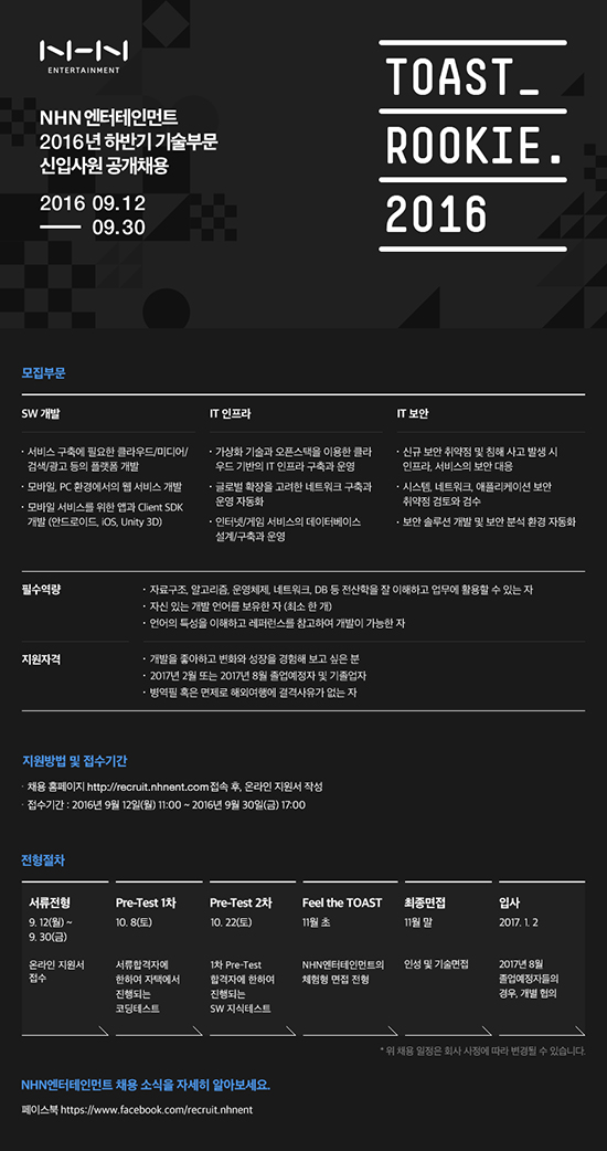 NHN¿£ÅÍÅ×ÀÎ¸ÕÆ®°¡ 2016³â ÇϹݱ⠱â¼úºÎ¹® ½ÅÀÔ»ç¿ø °ø°³Ã¤¿ëÀ» ½Ç½ÃÇÑ´Ù. ÆäÀÌÄÚ(PAYCO) °£Æí°áÁ¦¿Í ¹÷½º(À½¿ø), ƼÄϸµÅ©(¿¹¸Å), ÄÚ¹ÌÄÚ(À¥Å÷), Å佺Ʈ(±â¼ú) µî ½Å»ç¾÷¿¡ ÁøÃâ, Á¾ÇÕ IT ¼ºñ½º¾÷ü·Î º¯½Å ÁßÀÎ NHN¿£ÅÍÅ×ÀÎ¸ÕÆ®°¡ ¿À´Â 9¿ù 30ÀϱîÁö SW°³¹ß/ITÀÎÇÁ¶ó/ITº¸¾ÈÀÇ ¼¼ °¡Áö ±â¼úºÎ¹®¿¡ ´ëÇØ ½ÅÀÔ»ç¿øÀ» ¸ðÁýÇÑ´Ù°í 20ÀÏ ¹àÇû´Ù. NHN¿£ÅÍ´Â À̹ø ½ÅÀÔ»ç¿øÀ» ¡®4±â TOAST Rookie(Å佺Ʈ ·çŰ)¡¯·Î ¸í¸íÇϰí, ȸ»çÀÇ ¹Ì·¡¸¦ ÇÔ²² ¿¾î°¥ ½Ç·ÂÀÖ°í âÀÇÀûÀÎ ÀÎÀ縦 ¼±¹ß, IT ±â¼ú Àü¹®°¡·Î ¾ç¼ºÇØ ³ª°£´Ù´Â °èȹÀÌ´Ù. ÁÖµÈ ¾÷¹«´Â ¡ã¼ºñ½º ±¸Ãà¿¡ ÇÊ¿äÇÑ Å¬¶ó¿ìµå/¹Ìµð¾î/°Ë»ö/±¤°í Ç÷§Æû ¹× ¸ð¹ÙÀϰú PCȯ°æ¿¡¼ÀÇ ¾Û°ú À¥ ¼ºñ½º °³¹ß, ¡ã°¡»óÈ ±â¼ú°ú ¿ÀǽºÅÃÀ» ÀÌ¿ëÇÑ Å¬¶ó¿ìµå ±â¹ÝÀÇ IT ÀÎÇÁ¶ó ±¸Ãà°ú ¿î¿µ, ¡ãº¸¾È ¼Ö·ç¼Ç °³¹ß ¹× º¸¾È ºÐ¼® ȯ°æ ÀÚµ¿È µîÀÌ´Ù. ÁøÇàÀýÂ÷´Â ¼·ùÀüÇü¿¡ À̾î 10¿ù¿¡ µÎ ¹øÀÇ Pre-Test¸¦ °ÅÃÄ ¡®Feel the TOAST¡¯¸¦ ÁøÇàÇÑ µÚ, 11¿ù ¸» °æ ÃÖÁ¾ ¸éÁ¢À» ÅëÇØ ¼±¹ßÇϸç, ³»³â 1¿ùºÎÅÍ Á¤½Ä ±Ù¹«¸¦ ½ÃÀÛÇÑ´Ù. ¡®Feel the TAOST(ÇÊ ´õ Å佺Ʈ)¡¯´Â NHN¿£ÅÍÀÇ Æ¯ÈµÈ Ã¤¿ë ÇÁ·Î±×·¥À¸·Î, Áö¿øÀÚ°¡ ȸ»ç »ýȰÀ» ¸ÕÀú °æÇèÇØ º¸´Â ÀÏÁ¾ÀÇ ÀÏÀÏ ±Ù¹« üÇè ¸éÁ¢ÀÌ´Ù. Áö¿øÀÚ°¡ ÇöÀç ±Ù¹« ÁßÀÎ ¼±¹è Á÷¿øµé°ú °°Àº ½Ã°£¿¡ Ãâ±Ù, ÀÚ½ÅÀÇ ÀÚ¸®¸¦ ¹èÁ¤¹Þ°í ÇÏ·ç µ¿¾È ÁÖ¾îÁø ¾÷¹«¸¦ ¼öÇàÇÏ¸ç ¹®Á¦ ÇØ°á °úÁ¤À» Æò°¡ÇÏ´Â ½ÄÀÌ´Ù. ÀÌ¿Í ÇÔ²² NHN¿£ÅÍ´Â °ü½É ÀÖ´Â ´ëÇлýµéÀ» ´ë»óÀ¸·Î À̹ø ä¿ë¿¡ ´ëÇÑ ÀÚ¼¼ÇÑ ¼Ò°³´Â ¹°·Ð, ¸ÕÀú ÀÔ»çÇÑ ¼±¹è ½ÅÀÔ»ç¿øµé°ú ÇÔ²²ÇÏ´Â Ãë¾÷ ¼³¸íȸ ¡®Open Talk Day¡¯¸¦ 9¿ù 24ÀÏ(Åä), ¿ÀÈÄ 2½Ã ÆÇ±³ »ç¿Á ¡®Ç÷¹À̹ÂÁö¾ö¡¯¿¡¼ ÁøÇàÇÒ ¿¹Á¤ÀÌ´Ù. ÆäÀ̽ººÏ°ú ºí·Î±×¸¦ ÅëÇØ ¼±Âø¼ø Á¢¼ö ¸ðÁý ÁßÀ̸ç, Âü°¡¿¡ Á¦ÇÑÀº ¾ø´Ù. NHN¿£ÅÍÅ×ÀÎ¸ÕÆ® ÀÌÁßÇÏ ÀλçÁö¿ø½ÇÀåÀº ¡°°³¹ßÀ» ÁÁ¾ÆÇÏ°í º¯È¿Í ¼ºÀåÀ» °æÇèÇØº¸°í ½ÍÀº ¿Á¤ÀÌ °¡µæÇÑ Áö¿øÀÚ¶ó¸é ´©±¸¿¡°Ô³ª ¹®Àº ¿·ÁÀÖ´Ù¡±¸ç ¡°°³¹ßÀÚ°¡ ¸¸Á·Çϴ ȸ»ç, °³¹ßÀÚ¸¦ ¼ºÀå½Ãų ÁÙ ¾Æ´Â NHN¿£ÅÍÅ×ÀÎ¸ÕÆ®¿¡¼ ÇÔ²² ¼º°ø ½ºÅ丮¸¦ ½á³»·Á °¥ âÀÇÀûÀÌ°í ÆÐ±â ³ÑÄ¡´Â ¸¹Àº ºÐµéÀÇ µµÀüÀ» ±â´Ù¸°´Ù¡±°í ¹àÇû´Ù. Áö¿øÀÚ°ÝÀº 2017³â 2¿ù ¶Ç´Â 2017³â 8¿ù Á¹¾÷ ¿¹Á¤ÀÚ ¹× ±âÁ¹¾÷ÀÚÀ̸ç, Áö¿ø Èñ¸ÁÀÚ´Â NHN¿£ÅÍÅ×ÀÎ¸ÕÆ® ä¿ë ȨÆäÀÌÁö(http://recruit.nhnent.com)¿¡ Á¢¼ÓÇØ ¿Â¶óÀÎ Áö¿ø¼¸¦ ÀÛ¼ºÇÏ¸é µÈ´Ù. À̹ø Á¤±â ½ÅÀÔ»ç¿ø ä¿ë°ú °ü·ÃÇØ º¸´Ù ÀÚ¼¼ÇÑ Ã¤¿ë Á¤º¸´Â NHN¿£ÅÍÅ×ÀÎ¸ÕÆ® ä¿ë ºí·Î±×(http://ne_recruit.blog.me/)¿Í ÆäÀ̽ººÏ(https://www.facebook.com/recruit.nhnent)À» ÅëÇØ¼ È®ÀÎ °¡´ÉÇÏ´Ù. ÇÑÆí, NHN¿£ÅÍ´Â ÆÇ±³ Å×Å©³ë¹ë¸®¿¡ À§Ä¡ÇÑ ´ëÇ¥ÀûÀÎ IT±â¾÷À¸·Î µ¶Æ¯ÇÏ°í °³¼ºÀִ ä¿ë ¹®È°¡ Ư¡ÀÌ´Ù. ½ºÆåÆÄ±« ÀÔ»çÁö¿ø¼´Â ¹°·Ð 9ÁÖ°£ÀÇ ½ÉÈ ±³À°À» ÅëÇÑ ÇöÀå ¹èÄ¡ µî ½ÅÀÔ»ç¿øµéÀÇ ¸¸Á·µµµµ »ó´çÈ÷ ³ôÀº ÆíÀÌ´Ù. ½ÅÀÔ»ç¿ø ÀÌÁ÷·ü ¿ª½Ã Á¦·Î¿¡ °¡±î¿ï ¸¸Å IT¾÷°è ä¿ë¿¡ ÀÖ¾î ¼º°øÀûÀÎ ¸ðµ¨·Î Æò°¡¹Þ°í ÀÖ´Ù.