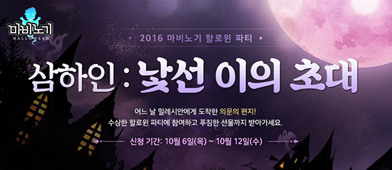 ³Ø½¼Àº 6ÀÏ ÀÚ»çÀÇ Àα⠿¶óÀΰÔÀÓ ¡®¸¶ºñ³ë±â¡¯¿¡¼ ÇÛ·¯À©(Halloween, ÀÌÇÏ ÇÒ·ÎÀ©) ±â³ä ¿ÀÇÁ¶óÀÎ ÆÄƼ ¡®»ïÇÏÀÎ: ³¸¼± ÀÌÀÇ Ãʴ롯 ÀÏÁ¤À» °ø°³Çϰí 12ÀϱîÁö Âü°¡ÀÚ¸¦ ¸ðÁýÇÑ´Ù°í ¹àÇû´Ù. ¿À´Â 30ÀÏ °³ÃֵǴ À̹ø Çà»ç´Â ÇÒ·ÎÀ©ÀÇ ±â¿øÀÌ µÈ °í´ë ÄÌÆ®ÀεéÀÇ ¡®»ïÇÏÀÎ ÃàÁ¦¡¯¸¦ ¸ðƼºê·Î ¸¶·ÃµÆÀ¸¸ç, ÇÒ·ÎÀ© ±â³ä ÆÄƼ¸¦ ÄܼÁÆ®·Î ¹Ì´Ï°ÔÀÓ°ú ÄûÁî, ¼±¹° ÁõÁ¤ À̺¥Æ® µî ´Ù¾çÇÑ ÇÁ·Î±×·¥À¸·Î ÁøÇàµÈ´Ù. Çà»ç Âü°¡ ½ÅûÀº 6ÀϺÎÅÍ 12ÀϱîÁö ¸¶ºñ³ë±â °ø½Ä ȨÆäÀÌÁö¸¦ ÅëÇØ °¡´ÉÇϸç, ½Åû À¯Àú Áß 75¸í(1ÀÎ µ¿¹Ý °¡´É)À» ÃÊûÇÑ´Ù. Çà»ç ´çÀÏ ÀÚÀ¯·Î¿î ÄÚ½ºÇÁ·¹ º¹ÀåÀ¸·Î Âü¼®ÀÌ °¡´ÉÇÑ °æ¿ì ÆÄƼ Âü°¡ÀÚ·Î ¼±Á¤µÉ °¡´É¼ºÀÌ ³ô¾ÆÁø´Ù. ¸¶ºñ³ë±â ÇÒ·ÎÀ© ÆÄƼ ¡®»ïÇÏÀÎ: ³¸¼± ÀÌÀÇ Ãʴ롯¿¡ °üÇÑ º¸´Ù ÀÚ¼¼ÇÑ ³»¿ëÀº ¸¶ºñ³ë±â °ø½Ä ȨÆäÀÌÁö(http://mabinogi.nexon.com/)¸¦ ÅëÇØ È®ÀÎÇÒ ¼ö ÀÖ´Ù.