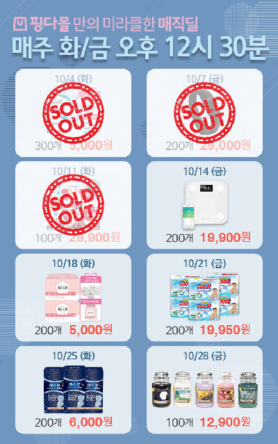 10¿ù ¡®¸ÅÁ÷µô¡¯Àº ÁÁÀº´À³¦, ÈÀÌÆ®, P&G, ¿¡¸®¿¡¸£ µîÀÇ »ý¸®´ë¿Í Çϱ⽺, ±º±âÀú±Í, ¹Ì¹êµå2, À©¸¶ÀÌ ¹Ì´ÏüÁß°è, ¾çŰĵµé µîÀÇ ÀϹݻóǰÀ¸·Î ±¸¼ºµÇ¾úÀ¸¸ç, »óǰ¿¡ µû¶ó ÃÖ´ë 75%±îÁö ÇÒÀÎµÈ °¡°Ý¿¡ ±¸¸ÅÇÒ ¼ö ÀÖ´Ù.