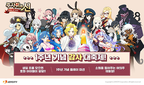 Á¶ÀÌ½ÃÆ¼´Â ÀÚ»ç ´ëÇ¥ ¸ð¹ÙÀÏ º¸µå°ÔÀÓ ¡®ÁÖ»çÀ§ÀÇ ½Å¡¯ÀÌ ±Û·Î¹ú Ãâ½Ã 1ÁÖ³âÀ» ±â³äÇØ ÆÄ°ÝÀûÀÎ ¼±¹°À» ÁõÁ¤ÇÏ´Â ´Ù¾çÇÑ À̺¥Æ®¸¦ ½Ç½ÃÇÑ´Ù°í 14ÀÏ ÀüÇß´Ù. 2015³â 10¿ù 15ÀÏ ±Û·Î¹ú Ãâ½ÃµÈ ¡®ÁÖ»çÀ§ÀÇ ½Å¡¯Àº Çѱ¹°ú ÀϺ», ½Ì°¡Æú µî ´Ù¼öÀÇ ±¹°¡¿¡¼ Àα⠰ÔÀÓ Ä«Å×°í¸® 3À§±ÇÀ» Â÷ÁöÇÑ ¸ð¹ÙÀÏ º¸µå°ÔÀÓÀÌ´Ù. ƯÈ÷ È«Äá¿¡¼´Â ¾à 2´Þ °£ ±¸±Û Ç÷¹ÀÌ ÃÖ°í ¸ÅÃâ °ÔÀÓ 1À§ÀÇ ÀÚ¸®¸¦ °í¼öÇß°í, ¾ÖÇà ¾Û½ºÅä¾î¿¡¼µµ ¾à 6°³¿ù °£ ÃÖ°í ¸ÅÃâ 3À§±ÇÀ» À¯ÁöÇÑ ¹Ù ÀÖ´Ù. Á¶ÀÌ½ÃÆ¼´Â ¡®ÁÖ»çÀ§ÀÇ ½Å¡¯ÀÇ Ãâ½Ã 1ÁÖ³âÀ» ±â³äÇØ ¡®1Áֳ⠱â³ä ¹ÐÃij»±â¡¯¸¦ ºñ·ÔÇØ ǪÁüÇÑ ¼±¹°À» ÁõÁ¤ÇÏ´Â À̺¥Æ®¸¦ ½Ç½ÃÇÑ´Ù. ¿ì¼± ¡®ÁÖ»çÀ§ÀÇ ½Å¡¯¿¡ Á¢¼ÓÇØ °ÔÀÓÀ» Ç÷¹ÀÌÇÏ´Â ¸ðµç À¯Àú¸¦ ´ë»óÀ¸·Î ÆÇ¼ö¿¡ µû¶ó ¡®µå¸²ÆÑ¡¯°ú ¡®5¼º ¾ÖÀåǰ¡¯, ¡®½ÅºñÇÑ °¡·ç¡¯ 300°³ µîÀ» Á¦°øÇÑ´Ù. ¶ÇÇÑ ÇÏ·ç 1¹ø °ÔÀÓÀ» 3ÆÇ Ç÷¹ÀÌÇÒ ¶§¸¶´Ù ´Ù¾çÇÑ ½ºÅ³Ä«µå¿Í ±³È¯ÇÒ ¼ö ÀÖ´Â ¡®¿©ÀÇÁÖ¡¯¸¦ ÁõÁ¤Çϰí, ¼ýÀÚ 1, 0, 1, 5·Î ±¸¼ºµÈ »ýÀÏ ÃÊ ¼öÁý ½Ã ¡®1,015 º¸¼®(°ÔÀÓij½¬)¡¯°ú ¡®300 ·°¼Å¸® Æ÷ÀÎÆ®¡¯, ¡®50¸¸ °ñµå¡¯, ¡®10ÅäÆÄÁ¸¦ ¾òÀ» ¼ö ÀÖ´Â »ýÀÏ ÃÊ ¼öÁý À̺¥Æ®¸¦ ÇÔ²² ½Ç½ÃÇÑ´Ù. ¸ð¹ÙÀÏ º¸µå°ÔÀÓ ¡®ÁÖ»çÀ§ÀÇ ½Å¡¯Àº ±¸±Û Ç÷¹ÀÌ ¹× ¿ø½ºÅä¾î, ¾ÖÇà ¾Û½ºÅä¾î¸¦ ÅëÇØ ´©±¸³ª ´Ù¿î·Îµå ¹ÞÀ» ¼ö ÀÖÀ¸¸ç, °ÔÀÓ¿¡ ´ëÇÑ º¸´Ù ÀÚ¼¼ÇÑ ³»¿ëÀº °ø½Ä ȨÆäÀÌÁö(http://god.joycity.com)¿¡¼ È®ÀÎÇÒ ¼ö ÀÖ´Ù.