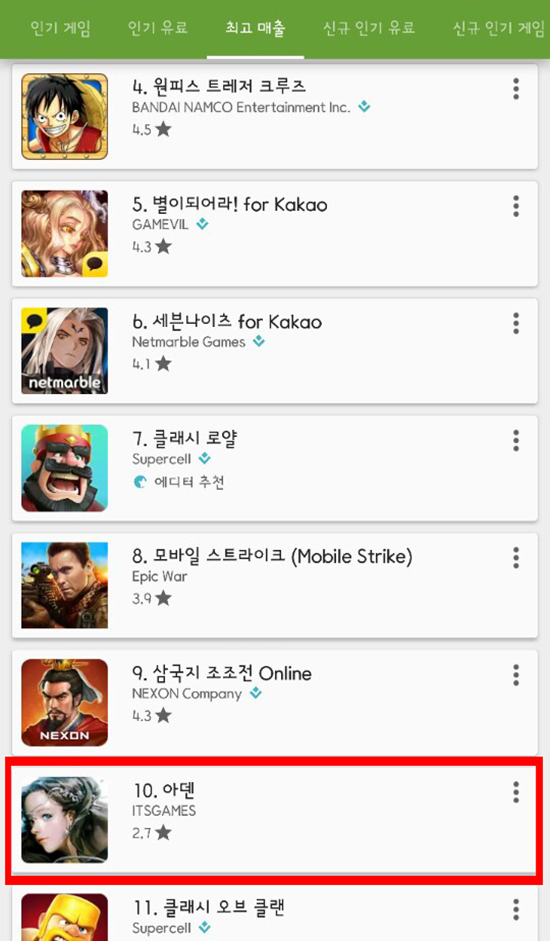 [ÀÌÃ÷°ÔÀÓÁî] ¸ð¹ÙÀÏ MMORPG ¡®¾Æµ§¡¯ ±¸±ÛÇ÷¹ÀÌ ¸ÅÃâ TOP10 ÁøÀÔ |