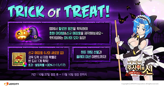 Á¶ÀÌ½ÃÆ¼´Â ÀÚ»ç ´ëÇ¥ ¸ð¹ÙÀÏ º¸µå°ÔÀÓ ¡®ÁÖ»çÀ§ÀÇ ½Å¡¯ÀÌ ¿À´Â 10¿ù 31ÀÏ ÇÒ·ÎÀ© µ¥À̸¦ ¸Â¾Æ ´Ùä·Î¿î À̺¥Æ®¸¦ ½Ç½ÃÇÑ´Ù°í 27ÀÏ ÀüÇß´Ù. ¸ÕÀú ³»´Þ 10ÀϱîÁö ¸Ê¿¡ Á¢¼ÓÇÒ ¶§¸¶´Ù ¹«ÀÛÀ§·Î Á¦°øµÇ´Â ¡®ÇÒ·ÎÀ© ÆßŲ¡¯°ú ¡®¸¶³àÀÇ ¸ðÀÚ¡¯¸¦ ¼öÁýÇØ ½Å±Ô ¾ÖÀåǰ ¡®³ªÀÇ »õ·Î¿îÁý¡¯ ¶Ç´Â ¡®Àè ¿À ·£ÅÏ ÁÖ»çÀ§ Á¶°¢¡¯ µîÀ» Á¦ÀÛÇÏ´Â À̺¥Æ®¸¦ ½Ç½ÃÇÑ´Ù. ¶ÇÇÑ µ¿ÀÏ ±â°£ µ¿¾È ÇÒ·ÎÀ© ±â³ä ÀÏÀÏ ¹Ì¼ÇÀ» ¿Ï¼öÇÒ ½Ã ¡®¼ºÀåÀÇ Ä¸½¶¡¯ 1°³¿Í ¡®5¸¸ °ñµå(°ÔÀÓ¸Ó´Ï)¡¯, ¡®EXPx5 °È¿ä¿ø¡¯ 1°³¸¦ ȹµæÇÒ ¼ö ÀÖÀ¸¸ç, ºñ¹Ð ¹®±¸¸¦ ã¾Æ äÆÃâ¿¡ ÀÔ·ÂÇϸé ǪÁüÇÑ ¼±¹°À» ¾òÀ» ¼ö ÀÖ´Ù. »Ó¸¸ ¾Æ´Ï¶ó, ÀڽŠ´ë½Å ¼±ÅÃÇÑ Ä³¸¯ÅͰ¡ ¸ÊÀ» À̵¿ÇÏ´Â ¡®ÀÎÇüÁ¶ÀÛ¡¯°ú ÁöÁ¤ÇÑ ³» ºÎµ¿»êÀ» Áö³ªÄ¡´Â ij¸¯Å͸¦ °Á¦ÀûÀ¸·Î Á¤Áö½ÃŰ´Â ¡®ÀϽÃÁ¤Áö!¡¯ ½ºÅ³Ä«µå¸¦ »õ·Ó°Ô Ãß°¡ÇßÀ¸¸ç, °¨¿Á µµÂø ½Ã ÀÏÁ¤ È®·ü·Î ºó µµ½Ã 1°³¸¦ ȹµæÇÒ ¼ö ÀÖ´Â ½Å±Ô ¾ÖÀåǰ ¡®³ªÀÇ »õ·Î¿îÁý¡¯µµ ÇÔ²² ¼±º¸¿´´Ù. ¡®ÁÖ»çÀ§ÀÇ ½Å¡¯Àº ±¸±Û Ç÷¹ÀÌ ¹× ¾ÖÇà ¾Û½ºÅä¾î, ¿ø½ºÅä¾î¸¦ ÅëÇØ ´©±¸³ª ´Ù¿î·Îµå ¹ÞÀ» ¼ö ÀÖÀ¸¸ç, ÇÒ·ÎÀ© ¸ÂÀÌ À̺¥Æ®¿¡ ´ëÇÑ ÀÚ¼¼ÇÑ ³»¿ëÀº °ø½Ä ȨÆäÀÌÁö(http://god.joycity.com)¿¡¼ È®ÀÎÇÒ ¼ö ÀÖ´Ù.