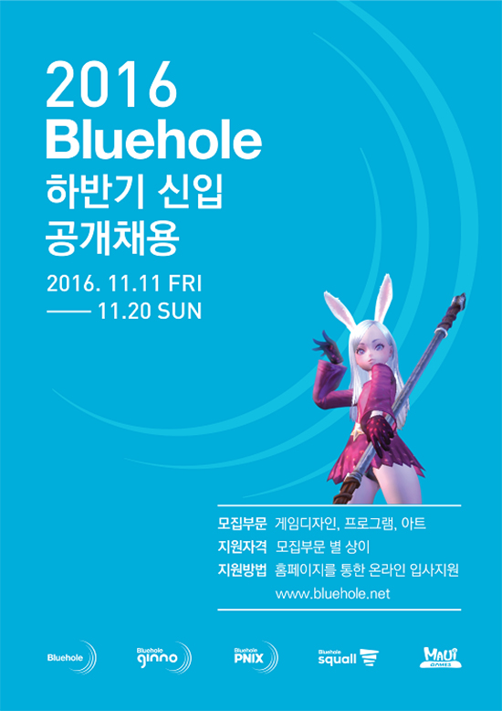 ¸ðÁý±â°£Àº 11¿ù 11ÀϺÎÅÍ 20ÀϱîÁöÀÌ¸ç ºí·çȦ °ø½Ä ȨÆäÀÌÁö(https://www.bluehole.net)¿¡¼ ¿Â¶óÀÎ Áö¿øÀÌ °¡´ÉÇÏ´Ù. ¸ðÁý ºÎ¹®Àº °ÔÀÓ ±âȹ, ÇÁ·Î±×·¥, ¾ÆÆ® ÃÑ 3°³ ºÎ¹®À¸·Î Áö¿øÀÚÀÇ ³ªÀÌ, ÇзÂ, Àü°ø¿¡ Á¦ÇÑÀ» µÎÁö ¾Ê´Â´Ù. ÀüÇü ÀýÂ÷´Â ¼·ù ½É»ç, ¿ª·® ¹× Àμº ÀÎÅÍºä ¼ø¼·Î ÁøÇàµÇ¸ç, ÃÖÁ¾ ÇÕ°ÝÀÚ´Â 12¿ù ¸»¿¡ °³º° Å뺸µÉ ¿¹Á¤ÀÌ´Ù.