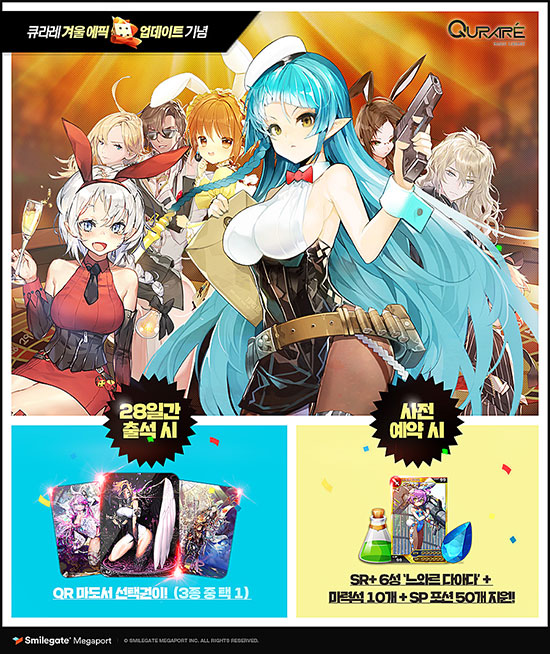 ½º¸¶ÀϰÔÀÌÆ®´Â Ä«µå ¹èƲ ¸ð¹ÙÀÏ RPG ¡®Å¥¶ó·¹: ¸¶¹ýµµ¼°ü(ÀÌÇÏ Å¥¶ó·¹)¡¯¿¡ °Ü¿ï ¸ÂÀÌ ¿¡ÇÈ ¿¡ÇǼҵå·Î ¡®Å¥¶ó·¹ ·Î¾â¡¯À» ¾÷µ¥ÀÌÆ®Çϱâ Àü ¿À´Â 24ÀÏ Á¤±âÁ¡°Ë Àü±îÁö »çÀü ¿¹¾àÀ» ½Ç½ÃÇÑ´Ù°í 21ÀÏ(¿ù) ¹àÇû´Ù. À̹ø Å¥¶ó·¹ ·Î¾â »çÀü ¿¹¾àÀº ¿À´Â 24ÀÏ Á¤±â Á¡°Ë Àü±îÁö »çÀü ¿¹¾àÀ» ÁøÇàÇÑ´Ù. »çÀü ¿¹¾à À̺¥Æ®¿¡ Âü¿©ÇÑ À¯Àú Àü¿ø¿¡°Ô´Â SR+ 6¼º ¸¶µµ¼ ¡®´À¿Í¸£ ´Ù¾Æ´Ù¡¯¿Í ÇÔ²² SPÆ÷¼Ç 50°³, ¸¶·Â¼® 10°³¸¦ Áö±ÞÇÑ´Ù. ¶ÇÇÑ »çÀü¿¹¾à º¸»ó ÄíÆùÀ» »ç¿ëÇÒ °æ¿ì »ç¿ë À¯Àú Áß Ãß÷À» ÅëÇØ 2017³âÆÇ Å¥¶ó·¹ ÇÑÁ¤ ´Þ·ÂÀ» ÁõÁ¤ÇÒ ¿¹Á¤ÀÌ´Ù. Å¥¶ó·¹ ´Þ·Â¿¡´Â 20¸¸¿ø »ó´çÀÇ ¸¶·Â¼® ÄíÆùµµ ´ã°Ü ÀÖ´Ù. À̹ø¿¡ ¿¹°íµÈ ¡®Å¥¶ó·¹ ·Î¾â¡¯ ¾÷µ¥ÀÌÆ®´Â Å¥¶ó·¹¿¡¼ ¸Å³â °Ü¿ïÀ» ¸Â¾Æ ÁøÇàµÅ ¿Ô´ø ¿¡ÇÈ ¾÷µ¥ÀÌÆ®ÀÇ ÀÏȯÀ¸·Î ¹Ù´Ï°É·Î ¹Ù²ï 3¸íÀÇ »ç¼µéÀÇ ÁÂÃæ¿ìµ¹ ¿¡ÇǼҵ带 ´ã°í ÀÖ´Ù. ƯÈ÷ ¹Ì¿ì, ¼¿¶ó, µ¨ÇÉ µî 3¸í »ç¼µéÀÇ º¹Àå°ú ¿ÜÇüÀÌ Á¶±Ý¾¿ ¹Ù²î¾î ¹Ù´Ï°ÉÀÇ ¸Å·ÂÀ» ÃæºÐÈ÷ »Ë³»°í ÀÖ´Ù. ±¹³» ´ëÇ¥ Ä«µå ¹èƲ RPG·Î¼ Å« »ç¶ûÀ» ¹Þ°í Àִ ť¶ó·¹¿¡ ´ëÇÑ ¼¼ºÎ ³»¿ëÀº ÀÌ °ÔÀÓÀÇ °ø½Ä Ä¿¹Â´ÏƼ(http://cafe.naver.com/qurare)¿¡¼ È®ÀÎÇÒ ¼ö ÀÖ´Ù. Å¥¶ó·¹´Â ±¹³» ±¸±Û Ç÷¹À̸¦ ºñ·ÔÇØ ¾ÖÇà ¾Û½ºÅä¾î, ¿ø½ºÅä¾î µî¿¡¼ ¹«·á·Î ´Ù¿î·Îµå ¹ÞÀ» ¼ö ÀÖ´Ù.