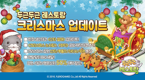 Ç÷¹·Î°ÔÀÓÁî´Â Àڻ簡 °³¹ß ¹× ¼ºñ½ºÇÏ´Â 'µÎ±ÙµÎ±Ù ·¹½ºÅä¶û for Kakao'¿¡¼ Å©¸®½º¸¶½º ½ÃÁðÀ» ¾ÕµÎ°í ¾÷µ¥ÀÌÆ®¸¦ ½Ç½ÃÇÑ´Ù°í 29ÀÏ(È) ¹àÇû´Ù. ¸ÕÀú, ¼ºÅºÀý ½ÃÁðÀ» ¸ÂÀÌÇØ »êŸ ¸ðÀÚ¿Í °Ü¿ï ¾ÆÀÌÅÛÀ» Âø¿ëÇÑ ¼Õ´Ô°ú Á¡¿øÀ» Ãß°¡Çϰí, »ý»êµ¥ÄÚ ¡®»êŸ ½ä¸Å¡¯¸¦ ¼±º¸ÀδÙ. ¡®»êŸ ½ä¸Å¡¯´Â °ÔÀÓÀ» ÅëÇØ¼ ¾òÀ» ¼ö ÀÖ´Â ¾ç¸»·Î ±³È¯ÇÒ ¼ö ÀÖ´Ù. Á¦ÀÛÀÌ °¡´ÉÇÑ ½Å±Ô »ý»êµ¥ÄÚ 2Á¾ ¡®Å©¸®½º¸¶½º ´«»ç¶÷¡¯°ú ¡®È´ö¡¯µµ ¾÷µ¥ÀÌÆ® ÇÑ´Ù. Ç÷¹·Î°ÔÀÓÁî´Â Å©¸®½º¸¶½º ½ÃÁðÀ» ±â³äÇØ ´Ù¾çÇÑ À̺¥Æ®µµ ¿¬´Ù. 12¿ù 31ÀϱîÁö »õ·Ó°Ô °ÔÀÓÀ» Áñ±â´Â ÀÌ¿ëÀÚ¸¦ ´ë»óÀ¸·Î ƯÁ¤ ·¹º§À» ´Þ¼ºÇϸé, Å©¸®½º¸¶½º Ä¿ÇǸӽÅ, Áø¿´ë µî Ưº° ÇÑÁ¤ÆÇ ¡®Å©¸®½º¸¶½º ¼¼Æ®¡¯¸¦ ÁõÁ¤Çϰí, 30·¹º§ ÀÌ»ó ´Þ¼ºÇϸé Ãß÷À» ÅëÇØ ¹éÈÁ¡ »óǰ±Ç°ú ·çºñ¸¦ ¼±¹°ÇÑ´Ù. ¿¬¸» °¨»ç Ưº° ¼¼Àϵµ 2017³â 1¿ù 8ÀϱîÁö ÁøÇàÇÑ´Ù. 2016³â ¼±º¸¿´´ø ¸ðµç Çà¿î»óÀÚ¸¦ ´Ù½Ã Çѹø ¸¸³ªº¼ ¼ö ÀÖÀ¸¸ç, Á¡¿ø°ú °¡±¸, ·¹½ºÅä¶û È®Àå µî ¸ðµç ¾ÆÀÌÅÛÀ» 50% ÇÒÀÎÇÑ´Ù. ÀÌ¿Í ÇÔ²² 12¿ù ÇÑ ´Þ µ¿¾È ±Ý¾×¿¡ °ü°è ¾øÀÌ »óÁ¡ ÀÌ¿ëÀÚ¿¡°Ô ¡®ÈÀÌÆ® ±×·£µå ÇǾƳ롯¸¦ ÁõÁ¤Çϰí, ´ÙÀ½ ´Þ 13ÀϱîÁö Çà¿î»óÀÚ¸¦ ÀÌ¿ëÇϸé Ãß÷À» ÅëÇØ ¡®ÁêÅ© ¹Ú½º¡¯ µî Èñ±Í »ý»êµ¥ÄÚ¸¦ Á¦°øÇÑ´Ù. Ç÷¹·Î°ÔÀÓÁî »ç¾÷½Ç ÀÌÅÂÇö PMÀº ¡°´Ù¾çÇÑ ¼ºÅºÀý ¾ÆÀÌÅÛÀ» ÅëÇØ ÀÌ¿ëÀÚµéÀº °ÔÀÓ¿¡¼ Å©¸®½º¸¶½º¸¦ ¹Ì¸® Áñ±æ ¼ö ÀÖ´Ù¡±¸ç ¡°2016³â µÎ±ÙµÎ±Ù ·¹½ºÅä¶û¿¡ º¸³»ÁֽЏ¶À½¿¡ º¸´äÇϰíÀÚ ¿¬¸» ¼¼ÀÏ ¹× °¨»ç À̺¥Æ®¸¦ ¸¶·ÃÇß´Ù¡±°í ÀüÇß´Ù. 'µÎ±ÙµÎ±Ù ·¹½ºÅä¶û'Àº µ¿ÈdzÀÇ Ä³¸¯ÅÍ¿Í ¾Æ±âÀÚ±âÇÑ ±×·¡ÇÈÀÌ Æ¯Â¡ÀÎ ·¹½ºÅä¶û °æ¿µ SNG·Î Áö³ 2014³â 8¿ù 26ÀÏ Á¤½Ä Ãâ½Ã ÀÌÈÄ ÀÌ¿ëÀڵ鿡°Ô ²ÙÁØÈ÷ »ç¶û¹Þ°í ÀÖ´Ù. 'µÎ±ÙµÎ±Ù ·¹½ºÅä¶û'¿¡ ´ëÇÑ º¸´Ù ÀÚ¼¼ÇÑ ¼Ò½ÄÀº °ø½Ä Ä«Æä¸¦ ÅëÇØ È®ÀÎÇÒ ¼ö ÀÖ´Ù.