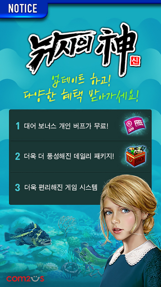 ÄÄÅõ½º´Â Àڻ簡 °³¹ßÇÏ°í ¼ºñ½ºÇÏ´Â 3D ¸®¾ó ³¬½Ã °ÔÀÓ '³¬½ÃÀÇ ½Å'ÀÇ ½Å±Ô ¾÷µ¥ÀÌÆ®¸¦ ÁøÇàÇß´Ù°í ¹àÇû´Ù. À̹ø ¡®³¬½ÃÀÇ ½Å¡¯ ¾÷µ¥ÀÌÆ®´Â ÀÌ¿ëÀÚµéÀÇ ÀǰßÀ» Àû±Ø ¼ö·ÅÇÑ ´Ù¾çÇÑ °ÔÀÓ ³» ÇýÅà Á¦°ø ¹× ÆíÀǼº °È¸¦ À§ÇØ ¸¶·ÃµÆ´Ù. ¸ÕÀú, Áö³ 10¿ù ù ¼±À» º¸ÀÎ ¡®°³ÀÎÀü¡¯ ½Ã½ºÅÛÀÇ Àç¹Ì¸¦ ´õÇϱâ À§ÇØ °³ÀÎ ¹öÇÁ¸¦ ¹«·á·Î Á¦°ø, ¸ðµç ÀÌ¿ëÀÚµéÀº ´ë¾î º¸³Ê½ºÀÇ ¹öÇÁ ÇýÅÃÀ» ¹ÞÀ» ¼ö ÀÖ´Ù. ¶Ç, °ÔÀÓ ³» ·Îºñ ȸ鿡 ¡®³¬½ÃÀÇ ½Å¡¯ Ä¿¹Â´ÏƼ ¹Ù·Î°¡±â ¾ÆÀÌÄÜÀ» »õ·Ó°Ô Ãß°¡ÇØ ´Ù¾çÇÑ °ÔÀÓ ³» Á¤º¸¸¦ º¸´Ù ½±°Ô È®ÀÎÇÒ ¼ö ÀÖµµ·Ï ÇßÀ¸¸ç, °ÔÀÓ¿¡ ´ëÇÑ ´Ù¾çÇÑ ³ëÇÏ¿ì µî ÀÌ¿ëÀÚµé °£ÀÇ ´Ù¾çÇÑ ¼ÒÅëÀ» Áö¿øÇÑ´Ù. ¸¶Áö¸·À¸·Î, Àº »óÀÚ¿Í Çà¿î »óÀÚ 10ȸ ¿¬¼Ó »Ì±â ±â´É Ãß°¡, ¿¡³ÊÁö º¸³»±â ½Ã°£ÀÇ Àϰý ÃʱâÈ, µ¥Àϸ® ÆÐŰÁö ¸®´º¾ó µî ÀÌ¿ëÀÚµéÀÇ ÀǰßÀ» Àû±Ø ¹Ý¿µÇÑ ¾÷µ¥ÀÌÆ®µµ ÇÔ²² ÁøÇàµÆ´Ù. ÇÑÆí, ¡®³¬½ÃÀÇ ½Å¡¯Àº 1ÀϺÎÅÍ 7ÀϱîÁö ÀÌ¿ëÀÚµé°ú ÇÔ²² ÇÏ´Â À̺¥Æ®¸¦ ÁøÇàÇÑ´Ù. À̺¥Æ® ±â°£ µ¿¾È Ãâ¼®Àϼö¿¡ µû¶ó ´Ù¾çÇÑ ¾ÆÀÌÅÛÀ» ¼±¹°·Î ¹ÞÀ» ¼ö ÀÖÀ¸¸ç, À̺¥Æ® ¹Ì¼Ç 3°¡Áö ÀÌ»ó ¿Ï·áÇÏ¸é °³ÀÎ ¹öÇÁ ¹«·á ÀÌ¿ë±ÇÀ» Ãß°¡·Î ¹ÞÀ» ¼ö ÀÖ´Ù. ¡®³¬½ÃÀÇ ½Å¡¯Àº 2014³â Àü¼¼°è µ¿½Ã Ãâ½ÃµÈ 3D ¸®¾ó ³¬½Ã °ÔÀÓÀ¸·Î, Áö³ 9¿ù Àü¼¼°è ´©Àû 5,000¸¸ ´Ù¿î·Îµå¸¦ µ¹ÆÄÇϸç ÃÖ°íÀÇ ±Û·Î¹ú ³¬½Ã°ÔÀÓÀ¸·Î ÀÚ¸®¸Å±èÇß´Ù. Â¥¸´ÇÑ ¼Õ¸ÀÀ» °Á¶ÇÑ »ýµ¿°¨ ³ÑÄ¡´Â Ç÷¹ÀÌ·Î ¾Æ½Ã¾Æ, ¹Ì±¹, À¯·´ µî ´Ù¾çÇÑ ±¹°¡¿¡¼ Àα⸦ ¾ò°í ÀÖÀ¸¸ç, 86°³±¹ ¾ÖÇà ¾Û½ºÅä¾î, 32°³±¹ ±¸±ÛÇ÷¹ÀÌ ½ºÅä¾î¿¡¼ ½ºÆ÷Ã÷°ÔÀÓ ´©Àû ¸ÅÃâ 1À§¸¦ ±â·ÏÇÑ ¹Ù ÀÖ´Ù. À̹ø ¾÷µ¥ÀÌÆ® ¹× À̺¥Æ®¿¡ ´ëÇÑ ´õ¿í ÀÚ¼¼ÇÑ ³»¿ëÀº ¡®³¬½ÃÀÇ ½Å¡¯ °ø½ÄÄ«Æä(http://cafe.naver.com/fishingcom2us)¸¦ ÅëÇØ È®ÀÎÇÒ ¼ö ÀÖ´Ù.