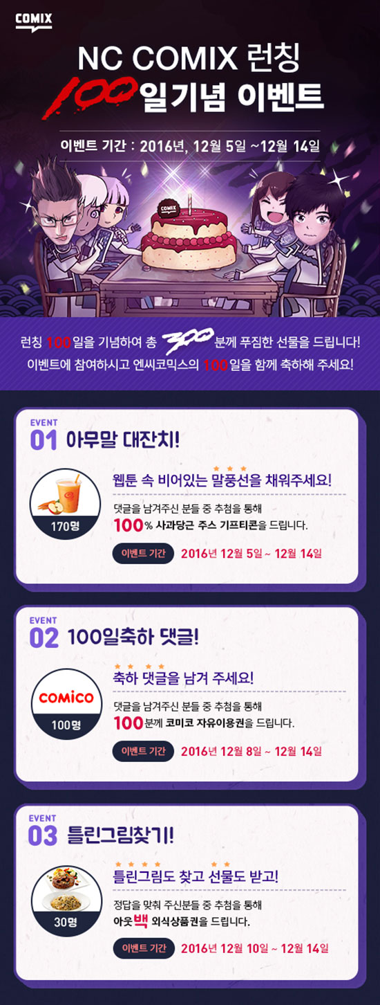 ¿£¾¾¼ÒÇÁÆ®°¡ ¡®NC COMIX(ÀÌÇÏ ¿£¾¾Äڹͽº)¡¯ Ãâ½Ã 100ÀÏ ±â³ä ÇÁ·Î¸ð¼ÇÀ» ÁøÇàÇÑ´Ù. ¿£¾¾Äڹͽº´Â ¿£¾¾¼ÒÇÁÆ®ÀÇ °ÔÀÓ IP(Intellectual Property, ÁöÀûÀç»ê±Ç)¸¦ Ȱ¿ëÇÑ À¥Å÷À» ÇÑ °÷¿¡¼ º¼ ¼ö ÀÖ´Â ÄÜÅÙÃ÷ ¼ºñ½ºÀÌ´Ù. ¿ÃÇØ 9¿ù 1ÀÏ iOS¿ë ¸ð¹ÙÀÏ ¾Û, PC/¸ð¹ÙÀÏ À¥»çÀÌÆ® ¼ºñ½º¸¦ ½ÃÀÛÇß´Ù. ÀÌ¿ëÀÚ´Â ¿£¾¾Äڹͽº °ø½Ä ÆäÀ̽ººÏ ÆäÀÌÁö¿¡¼ ÁøÇàÇÏ´Â ·±Äª 100ÀÏ ±â³ä À̺¥Æ®¿¡ Âü¿©ÇÒ ¼ö ÀÖ´Ù. À̺¥Æ®´Â 12¿ù 5ÀϺÎÅÍ 14ÀϱîÁö ÁøÇàÇÑ´Ù. ¡ã¡®¾Æ¹«¸» ´ëÀÜÄ¡(¸»Ç³¼± ä¿ì±â)¡¯ ¡ã ¡®100ÀÏ ÃàÇÏ ´ñ±Û¡¯ ¡ã¡®Æ²¸°±×¸²Ã£±â¡¯ À̺¥Æ®¿¡ Âü¿©ÇÒ ¼ö ÀÖ´Ù. Ãß÷À» ÅëÇØ ´Ù¾çÇÑ °æÇ°À» ¹ÞÀ» ¼ö ÀÖ´Â ±âȸ°¡ ÁÖ¾îÁø´Ù. ÀÚ¼¼ÇÑ ³»¿ëÀº ¿£¾¾Äڹͽº ÆäÀ̽ººÏ ÆäÀÌÁö(https://www.facebook.com/nccomix.kr/)¿¡¼ È®ÀÎÇÒ ¼ö ÀÖ´Ù. ¿£¾¾Äڹͽº´Â Ãâ½Ã 100ÀÏÀ» ¸ÂÀÌÇØ ¡®Ä«Ä«¿À Ç÷¯½º Ä£±¸¡¯¸¦ ¿ÀÇÂÇß´Ù. ÀÌ¿ëÀڴ īī¿ÀÅå¿¡¼ ¿£¾¾Äڹͽº¸¦ Ä£±¸ Ãß°¡Çϸé, ¿£¾¾¼ÒÇÁÆ®°¡ °³¹ß ÁßÀÎ PC¿Â¶óÀÎ °ÔÀÓ MXM(Master X Master: ¸¶½ºÅÍ¿¢½º¸¶½ºÅÍ, ¿¥¿¢½º¿¥)ÀÇ ¡®¾Æ¶ó¹Ì¡¯ ij¸¯ÅÍ·Î ¸¸µé¾îÁø ½ºÆ¼Ä¿ À̸ðƼÄÜ(¾È³ç ¾Æ¶ó¹Ì¾ß)À» ¹ÞÀ» ¼ö ÀÖ´Ù. À̸ðƼÄÜÀº ÀαâÀ¥Å÷ ÀÛ°¡ ¡®¸¸¹°»ó¡¯ÀÌ ±×·È´Ù. ¾Èµå·ÎÀ̵å¿ë ¸ð¹ÙÀÏ ¾ÛÀ» Ãâ½ÃÇß´Ù. ¾Èµå·ÎÀ̵å ÀÌ¿ëÀÚ´Â ±¸±Û Ç÷¹ÀÌ ½ºÅä¾î(https://play.google.com/store/apps/details?id=com.ncsoft.nccomix)¿¡¼ ¿£¾¾Äڹͽº¸¦ ´Ù¿î·Îµå ¹ÞÀ» ¼ö ÀÖ´Ù.