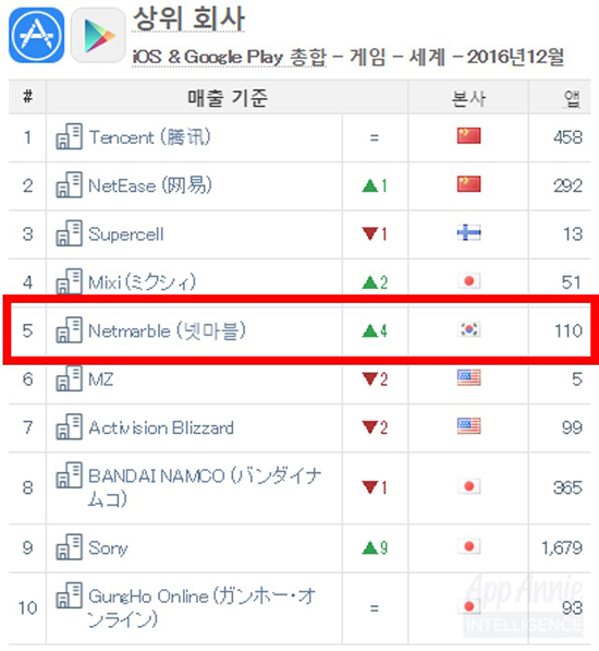 ³Ý¸¶ºí°ÔÀÓÁî(ÀÌÇÏ ³Ý¸¶ºí)´Â ±Û·Î¹ú ¸ð¹ÙÀÏ ¾Û Åë°è ºÐ¼® »çÀÌÆ® ¾Û¾Ö´Ï°¡ ¹ßÇ¥ÇÑ '¾Û½ºÅä¾î¡¤±¸±ÛÇ÷¹ÀÌ ÃÑÇÕ ±Û·Î¹ú °ÔÀÓ È¸»ç¡¤¾Û ¸ÅÃâ À妽º(2016³â 12¿ù)'¿¡¼ Àڻ簡 ±Û·Î¹ú ÆÛºí¸®¼Å 5À§¿¡ ¿Ã¶ú´Ù°í ¿À´Ã ¹àÇû´Ù. ÀÌ´Â Áö³ 11¿ù ´ëºñ 4°è´Ü ¿À¸¥ °ÍÀ¸·Î ³Ý¸¶ºíÀº ±¹³» °ÔÀÓ»ç Áß ÃÖ°í ¼øÀ§¸¦ ±â·ÏÇÑ µ¿½Ã¿¡, ÅÙ¼¾Æ®(1À§), ³ÝÀÌÁî(2À§), ¼öÆÛ¼¿(3À§)°ú °°Àº ±Û·Î¹ú ´ëÇü °ÔÀÓ»çµé°ú ¾î±ú¸¦ ³ª¶õÈ÷ Çß´Ù. ÇÑ´Þ ¸¸¿¡ ÀÌ¿Í °°ÀÌ °¡ÆÄ¸¥ ¼øÀ§ »ó½ÂÀ» ÀÌ·é µ¥¿¡´Â, Áö³ ´Þ ±¹³»¿¡ Ãâ½ÃµÈ ¸ð¹ÙÀÏ MMORPG ¡®¸®´ÏÁö2 ·¹º¼·ç¼Ç¡¯ÀÇ ¿µÇâÀÌ ÄÇ´Ù. ¡®¸®´ÏÁö2 ·¹º¼·ç¼Ç¡¯Àº 12¿ù 14ÀÏ¿¡ Ãâ½ÃµÆÀ½¿¡µµ ºÒ±¸Çϰí, ¸ó½ºÅÍ ½ºÆ®¶óÀÌÅ©, Ŭ·¡½Ã ·Î¾â¿¡ ÀÌ¾î µ¿ À妽º ³» ¡®±Û·Î¹ú ¸ÅÃâ »óÀ§ °ÔÀÓ¡¯ 3À§¿¡ ¿À¸£´Â ±â¿°À» ÅäÇß´Ù. ¡®¸®´ÏÁö2 ·¹º¼·ç¼Ç¡¯Àº Ãâ½Ã 8½Ã°£ ¸¸¿¡ ¾ÖÇà ¾Û½ºÅä¾î ÃÖ°í ¸ÅÃâ 1À§¸¦ ´Þ¼ºÇÏ´Â µî ±¹³» ¸ð¹ÙÀÏ °ÔÀÓ ½ÃÀå ±â·ÏµéÀ» °æ½ÅÇØ¿Â µ¥ À̾î, ÇÑ ´Þ° ¾ç´ë ¸¶ÄÏ 1À§¸¦ ¼ö¼ºÇϸç Àå±â ÈïÇà äºñ¸¦ ¸¶Ä£ »óȲÀÌ´Ù. ÇÑÆí 12ÀÏ ÇöÀç ±¹³» ±¸±ÛÇ÷¹ÀÌ ÃÖ°í ¸ÅÃâ °ÔÀÓ ÃÖ»óÀ§±Ç¿¡´Â ¡®¸®´ÏÁö2 ·¹º¼·ç¼Ç¡¯(1À§), ¡®¸ðµÎÀǸ¶ºí¡¯(2À§), ¡®¼¼ºì³ªÀÌÃ÷¡¯(3À§), ¡®¾Æµ§¡¯(7À§) µî ³Ý¸¶ºíÀÌ ÆÛºí¸®½Ì ÇÏ´Â °ÔÀÓ ´Ù¼ö°¡ Æ÷ÁøÇØÀÖ´Ù.