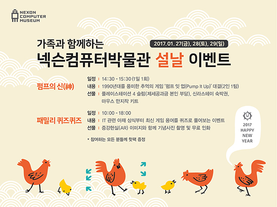 ³Ø½¼ÄÄÇ»Å͹ڹ°°üÀº ¹ÎÁ· ´ë¸íÀý ¼³³¯À» ¸Â¾Æ 1¿ù 27ÀÏ(±Ý)ºÎÅÍ 1¿ù 29ÀÏ(ÀÏ)±îÁö ¿Â °¡Á·ÀÌ ÇÔ²² Âü¿©ÇÏ¿© Áñ±â¸ç ¼¼´ë°£ °£±ØÀ» Á¼Èú ¼ö ÀÖ´Â ¼³³¯ À̺¥Æ®¸¦ ÁغñÇß´Ù°í ¹àÇû´Ù. ¡®ÆßÇÁÀÇ ½Å(ãê)¡¯Àº 1990³â´ë Ãß¾ïÀÇ °ÔÀÓÀÎ ¡®ÆßÇÁ ÀÕ ¾÷(Pump It Up)¡¯À» °¡Á·(2ÀÎ 1ÆÀ) °£¿¡ °íµæÁ¡À» °Ü·ç´Â À̺¥Æ®ÀÌ´Ù. 27ÀÏ(±Ý) ~ 29ÀÏ(ÀÏ) ¿ÀÈÄ 2½Ã 30ºÐºÎÅÍ ¸ÅÀÏ 1½Ã°£ µ¿¾È ÁøÇàµÇ¸ç, À̺¥Æ® ±â°£¿¡ ÃÖ°í ±â·ÏÀ» ¼¼¿î ¡®ÆßÇÁÀÇ ½Å(ãê)¡¯ 1ÆÀ¿¡°Ô´Â ¡®Ç÷¹À̽ºÅ×ÀÌ¼Ç 4 ½½¸²¡¯À», 2µî¿¡°Ô´Â ¡®½Å¶ó½ºÅ×ÀÌ ¼÷¹Ú±Ç¡¯À» ¼±¹°Çϰí, ºÎ¸ð¿Í Àڳడ ÇÔ²² Âü¿©ÇÏ¿© µÑ Áß 1¸íÀÌ Bµî±Þ ÀÌ»óÀ» ¹ÞÀ¸¸é ³ª¸¸ÀÇ ¸¶¿ì½º¸¦ ¸¸µé¾î º¼ ¼ö ÀÖ´Â ¡®¸¶¿ì½º ¸¸ÁöÀÛ¡¯ ŰƮ¸¦ ¼±¹°ÇÑ´Ù. ±×¸®°í QR Äڵ带 ÀÌ¿ëÇØ °ú°Å¿Í ÇöÀ縦 ¾Æ¿ì¸£´Â IT °ü·Ã ÄûÁ Ç®¸ç ¹Ú¹°°üÀ» °ü¶÷ÇÏ¸é¼ ¼¼´ë°£ ¼ÒÅëÀÇ ±âȸ¸¦ Á¦°øÇÏ´Â ¡®ÆÐ¹Ð¸® ÄûÁîÄûÁ À̺¥Æ®¸¦ ¿î¿µÇÑ´Ù. ÄûÁ ¸ðµÎ ¸ÂÈù °ü¶÷°´¿¡°Ô´Â Áõ°Çö½Ç(AR) ¾ÛÀ» Ȱ¿ëÇØ ±â³ä »çÁøÀ» ÃÔ¿µÇϰí ÇöÀå¿¡¼ ¹«·á·Î »çÁøÀ» ÀÎÈÇÒ ¼ö ÀÖ´Â ÇýÅÃÀ» Á¦°øÇÑ´Ù. ÀÌ ¹Û¿¡µµ ¼³³¯ À̺¥Æ® Âü°¡ÀÚ Àü¿ø¿¡°Ô´Â ³Ø½¼ÄÄÇ»Å͹ڹ°°ü¿¡¼ Ưº° Á¦ÀÛÇÑ ÇÖÆÑÀ» ÁõÁ¤ÇÑ´Ù. ³Ø½¼ÄÄÇ»Å͹ڹ°°ü ÃÖÀ±¾Æ °üÀåÀº ¡°¸íÀýÀ» ¸Â¾Æ ºÎ¸ð¿Í Àڳడ °ÔÀÓ, ÄÄÇ»ÅͶó´Â °øÅë °ü½É»ç¸¦ ÅëÇØ ¼¼´ë°£ ¼ÒÅëÀÇ °è±â¸¦ ¸¶·ÃÇϰí ȸñÀ» µµ¸ðÇÒ ¼ö ÀÖ´Â °è±â°¡ µÇ¾úÀ¸¸é ÁÁ°Ú´Ù¡±¸ç ¡°³Ø½¼ÄÄÇ»Å͹ڹ°°ü °ü¶÷°´ ¸ðµÎ °¡Á·, ¿¬Àΰú ÇÔ²² ¼³³¯ À̺¥Æ®¸¦ Áñ±â°í, Èñ¸ÁÀÌ °¡µæÇÑ »õÇØ¸¦ ¸ÂÀÌÇÏ½Ã±æ ¹Ù¶õ´Ù¡±°í ¹àÇû´Ù. ¡°³Ø½¼ÄÄÇ»Å͹ڹ°°ü ¼³³¯ À̺¥Æ®¡±¿¡ ´ëÇÑ º¸´Ù ÀÚ¼¼ÇÑ ³»¿ëÀº ³Ø½¼ÄÄÇ»Å͹ڹ°°ü ȨÆäÀÌÁö(http://www.nexoncomputermuseum.org)¿¡¼ È®ÀÎÇÒ ¼ö ÀÖ´Ù.