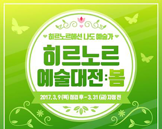 ¡®È÷¸£³ë¸£ ¿¹¼ú´ëÀü:º½¡¯Àº À¯Àú°¡ Á¦ÀÛÇÑ UCC (User Created Content) ¸¦ Ȱ¿ëÇÒ ¼ö ÀÖ´Â ¡®¾ÆÅ°¿¡ÀÌÁö¡¯ÀÇ ÄÁÅÙÃ÷¸¦ »ì·Á ¡®¾ÆÅ°¿¡ÀÌÁö¡¯ À¯ÀúµéÀÇ ÆÒ¾ÆÆ®, ½ºÅ©¸°¼¦ µîÀ» ¼±Á¤ÇØ °³ÀÓ ³»¿¡¼ Àü½Ã, ÆÇ¸ÅÇÏ´Â À̺¥Æ®´Ù. Âü¿©¸¦ ¿øÇÏ´Â ¡®¾ÆÅ°¿¡ÀÌÁö¡¯ À¯Àú´Â ¿À´Â31ÀÏ(±Ý)±îÁö ÆÒ¾ÆÆ®, ½ºÅ©¸°¼¦, UCC Áß ¿øÇÏ´Â ºÎ¹®¿¡ Á¤ÇØÁø ±Ô°Ý¿¡ ¸ÂÃá ÀÛǰÀ» ¡®¾ÆÅ°¿¡ÀÌÁö¡¯ °ø½Ä ȨÆäÀÌÁöÀÇ À̹ÌÁö °Ô½ÃÆÇ¿¡ ¿Ã¸®¸é µÈ´Ù. ÁÖÁ¦ÀÇ ÀûÇÕ¼º, âÀÛ¼º, »óǰ¼º¿¡ µû¶ó ¼±Á¤µÈ ÀÛǰÀº 4¿ù 27ÀÏ (¸ñ)ºÎÅÍ 2ÁÖÀÏ µ¿¾È °ÔÀÓ ³» °¢ ´ë·ú ´ëµµ½Ã ¡®¸¶¸®¾Æ³ëÇᯰú ¡®¿À½ºÅ×¶ó¡¯ ¿¡ Àü½ÃµÈ´Ù. Àü½ÃµÈ ÀÛǰÀº Àü½ÃÀå NPC¸¦ ÅëÇØ ±¸ÀÔÇÒ ¼ö ÀÖÀ¸¸ç ÃâǰÀÚ´Â ¼ö¼ö·á¸¦ Á¦¿ÜÇÑ ÆÇ¸Å ´ë±ÝÀÇ 90%¸¦ ¹Þ°Ô µÈ´Ù.