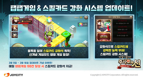 Á¶ÀÌ½ÃÆ¼´Â ÀÚü °³¹ßÇÑ ¸ð¹ÙÀÏ º¸µå°ÔÀÓ ¡®ÁÖ»çÀ§ÀÇ ½Å¡¯ÀÌ ´Ù°¡¿À´Â 3¿ù 14ÀÏ ÈÀÌÆ®µ¥À̸¦ ¸ÂÀÌÇØ ½Å±Ô ÄÜÅÙÃ÷¸¦ Ãß°¡ÇÏ´Â ¾÷µ¥ÀÌÆ®¸¦ ½Ç½ÃÇß´Ù°í 9ÀÏ ÀüÇß´Ù. 5¼º ÀÌ»óÀÇ ½ºÅ³Ä«µå¿¡ Ȧ·Î±×·¥ È¿°ú ¹× Ãß°¡ ´É·ÂÄ¡¸¦ ºÎ¿©ÇÒ ¼ö ÀÖ´Â ¡®½ºÅ³Ä«µå °È ½Ã½ºÅÛ¡¯À» »õ·Ó°Ô ¼±º¸À̰í, °È Àç·áÀÎ ¡®½ºÅ³Ä«µå °È¼®¡¯À» ȹµæÇÒ ¼ö ÀÖ´Â ½Å±Ô °ÔÀÓ ¸ðµå ¡®ÅÇÅǰÔÀÓ¡¯À» ¿ÀÇÂÇß´Ù. ¡®ÅÇÅǰÔÀÓ¡¯Àº Á¦ÇÑ ½Ã°£ µ¿¾È ºü¸£°í Á¤È®ÇÏ°Ô ¸ÊÀ» À̵¿ÇØ ºí·Ï À§¿¡ ³õÀÎ ¡®½ºÅ³Ä«µå °È¼®¡¯À» ȹµæÇÏ´Â ¹æ½ÄÀ¸·Î ÁøÇàµÈ´Ù. ÃÑ 3¸íÀÇ Ä³¸¯Å͸¦ ¼±ÅÃÇØ ÀÔÀåÇÏ°Ô µÇ¸ç, °¢ ij¸¯Å͸¶´Ù Á¤ÇØÁø Ç÷¹ÀÌ Å¸ÀÓ ÀÖ¾î ij¸¯ÅÍ ¼ö¸íÀÌ ´ÙÇÏ¸é ´ÙÀ½ ij¸¯ÅÍ·Î ÀÌ¾î¼ À̵¿ÀÌ °¡´ÉÇÏ´Ù. ÀÌ ¹Û¿¡µµ 7°³ ÀÌ»óÀÇ µµ½Ã¸¦ ȹµæÇÒ °æ¿ì, È®·ü¿¡ µû¶ó ³» ¸ðµç µµ½ÃÀÇ ÅëÇà·á°¡ Áõ°¡ÇÏ´Â ¡®ÆÄ¿öºÎ½ºÅÍ¡¯¿Í ³» ¼ÒÀ¯ÀÇ ÈÞ¾çÁö¿¡ µµÂøÇÑ »ó´ë¹æÀ» ³» µµ½Ã Áß Çϳª·Î °Á¦ À̵¿½Ãų ¼ö ÀÖ´Â ¡®¿ªÀüÀÇ ºÎÀû¡¯ ¾ÖÀåǰÀ» Ãß°¡Çß´Ù. ¶Ç, ¿À´Â 23ÀϱîÁö ¸ÊÀ» ÅëÇØ Á¦°øµÇ´Â ¡®¹«Áö°³ »çÅÁ¡¯À» ¸ð¾Æ ǪÁüÇÑ ¾ÆÀÌÅÛÀ¸·Î ±³È¯ÇÏ´Â ÈÀÌÆ®µ¥ÀÌ ±â³ä À̺¥Æ®µµ ÇÔ²² ½Ç½ÃÇÑ´Ù. ¡®ÁÖ»çÀ§ÀÇ ½Å¡¯Àº ±¸±Û Ç÷¹ÀÌ ¹× ¾ÖÇà ¾Û½ºÅä¾î, ¿ø½ºÅä¾î¸¦ ÅëÇØ ´©±¸³ª ´Ù¿î·Îµå ¹ÞÀ» ¼ö ÀÖÀ¸¸ç, °ÔÀÓ¿¡ ´ëÇÑ º¸´Ù ÀÚ¼¼ÇÑ ³»¿ëÀº °ø½Ä ȨÆäÀÌÁö(http://god.joycity.com)¿¡¼ È®ÀÎ °¡´ÉÇÏ´Ù.