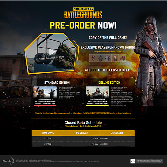 ºí·çȦÀº ¹èƲ ·Î¾â °ÔÀÓ ¡®Ç÷¹À̾î¾ð³ë¿î½º ¹èƲ±×¶ó¿îµå(PLAYERUNKNOWN¡¯S BATTLEGROUNDS, ÀÌÇÏ ¹èƲ±×¶ó¿îµå)¡¯°¡ ¾Æ½Ã¾Æ ¼¹ö¸¦ Æ÷ÇÔÇØ ½ºÆÀ(STEAM) ¾ó¸® ¾ï¼¼½º(Early Access)·Î ±Û·Î¹ú ¼ºñ½º¸¦ ½ÃÀÛÇÒ ¿¹Á¤À̶ó°í ±ÝÀÏ(10ÀÏ) ¹àÇû´Ù. ¡®¹èƲ±×¶ó¿îµå¡¯´Â 96ÀÎÀÇ À¯Àú°¡ °í¸³µÈ ¼¶¿¡¼ ¹«±â¿Í Å» °ÍÀ» Ȱ¿ëÇØ ÃÖÈÄÀÇ 1ÀÎÀ¸·Î »ì¾Æ³²±â À§ÇØ °æÀïÀ» ¹úÀÌ´Â °ÔÀÓÀÌ´Ù. ¡®Ç÷¹À̾î¾ð³ë¿î(PLAYERUNKNOWN)¡¯À¸·Î ¾Ë·ÁÁø ¹èƲ ·Î¾â ¸ðµå â½ÃÀÚ ºê·»µç ±×¸°(Brendan Greene)ÀÌ Å©¸®¿¡ÀÌÆ¼ºê µð·ºÅÍ·Î Á¦ÀÛ¿¡ Âü¿©ÇØ ÈÁ¦¸¦ ¸ð¾Ò´Ù. ¹æ¼Û Ç÷§Æû Æ®À§Ä¡¿¡¼´Â µ¿½Ã ½ÃûÀÚ ¼ö 85,000¸íÀ» µ¹ÆÄÇϸç Å×½ºÆ® ±â°£ µ¿¾È 2ÁÖ ¿¬¼Ó ±Û·Î¹ú Àüü °ÔÀÓ 2À§¸¦ Â÷ÁöÇß´Ù. Å×½ºÆ®°¡ ÁøÇàµÇ´Â ÁÖ¸»¸¶´Ù Àü¼¼°è 1,300¸í ÀÌ»óÀÇ ½ºÆ®¸®¸ÓµéÀÌ ¹æ¼ÛÀ» Çϰí ÀÖÀ¸¸ç ƯÈ÷ 100¸¸¸í ÀÌ»ó ÆÈ·Î¿ö¸¦ º¸À¯ÇÑ À¯¸í ½ºÆ®¸®¸ÓµéÀÇ ¹æ¼ÛÀÌ ÁÖ¸ñ ¹Þ°í ÀÖ´Ù. ÀÌ °°Àº À¯Àú È£ÀÀ¿¡ ÈûÀÔ¾î ºÏ¹Ì, À¯·´, ¾Æ½Ã¾Æ ¼¹ö¿¡¼ ¼¼°è °¢±¹ÀÇ À¯Àúµé°ú ÇÔ²² Ç÷¹À̰¡ °¡´ÉÇÏ´Ù. À¯ÀúµéÀº 3¿ù 4ÀÏ(Åä)ºÎÅÍ ÁøÇà ÁßÀÎ ¾ó¸® ¾ï¼¼½º(Early Access) ¿¹¾à ±¸¸Å¸¦ ÅëÇØ ½ºÅÄ´Ùµå¿Í µð·°½º ¿¡µð¼ÇÀ» ±¸ÀÔÇÒ ¼ö ÀÖÀ¸¸ç, 3¿ù 24ÀÏ(±Ý)ºÎÅÍ ¼ºñ½º°¡ ½ÃÀ۵ȴÙ. ½ºÅÄ´Ùµå ¿¡µð¼ÇÀº ¡®¹èƲ±×¶ó¿îµå¡¯ Á¤Ç°Å° 1°³¿Í Å×½ºÆ®Å° 1°³·Î ±¸¼ºµÇ¾úÀ¸¸ç, µð·°½º ¿¡µð¼ÇÀº Á¤Ç° Ű 1°³¿Í Å×½ºÆ® Ű 2°³¿¡ ÇÑÁ¤ÆÇ Ç÷¹À̾î¾ð³ë¿î ½ºÅ²ÀÌ Ãß°¡µÈ´Ù. ÀÚ¼¼ÇÑ ³»¿ëÀº ¿¹¾à ±¸¸Å ÆäÀÌÁö(Http://Preorder.Battlegroundsgame.Com/)¿¡¼ È®ÀÎ °¡´ÉÇÏ´Ù. °ÔÀÓ¿¡ ´ëÇÑ ÀÚ¼¼ÇÑ ³»¿ëÀº °ø½Ä Ä«Æä(http://cafe.naver.com/playbattlegrounds)¿¡¼ È®ÀÎÇÒ ¼ö ÀÖ´Ù.
