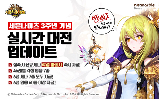 ³Ý¸¶ºí°ÔÀÓÁî(ÀÌÇÏ ³Ý¸¶ºí)´Â ¸ð¹ÙÀÏ RPG(¿ªÇÒ¼öÇà°ÔÀÓ) '¼¼ºì³ªÀÌÃ÷(°³¹ß»ç ³Ý¸¶ºí³Ø¼½º)'¿¡¼ 3ÁÖ³âÀ» ¸Â¾Æ °ÔÀÓ¼ºÀ» ´ëÆø È®ÀåÇÏ´Â ¾÷µ¥ÀÌÆ®¿Í À̺¥Æ®¸¦ ½Ç½ÃÇß´Ù°í 13ÀÏ ¹àÇû´Ù. 3Áֳ⠴ë±Ô¸ð ¾÷µ¥ÀÌÆ®´Â ¡â¼¼ºì³ªÀÌÃ÷ ¹Ù³×»ç Ãâ½Ã¡â¼¼ºì³ªÀÌÃ÷ ¸®¸ÞÀÌÅ©¡â½Ç½Ã°£ °áÅõÀå¡â¿µ¿õ·¹º§È®Àå¡âÀáÀç´É·Â¡â»ç¿ëÀÚȯ°æ(User Interface)&»ç¿îµå °³ÆíÀ» ÁßÁ¡À¸·Î ÇÑ´Ù. ´ÙÅ©³ªÀÌÃ÷°¡ µÈ µ¨·ÐÁîÀÇ ÀÌÅ»·Î 6ÀΠüÁ¦°¡ µÆ´ø ¼¼ºì³ªÀÌÃ÷´Â ¹Ù³×»ç¸¦ Ãß°¡ÇÏ¸é¼ ´Ù½Ã 7ÀÎÀÌ µÆ´Ù. ½Ã°£À» ´Ù·ç´Â ´ë¸¶¹ý»ç ¹Ù³×»ç´Â ¸ð·¡½Ã°è¸¦ ÀÌ¿ëÇØ ½Ã°ø°£À» ¸ØÃß´Â µî ¸·°ÇÑ ½ºÅ³À» °®°í ÀÖÀ¸¸ç, ½ºÅ丮³ª ÀüÅõ¿¡¼ »õ·Î¿î º¯È¸¦ ÀÏÀ¸Å³ ¿¹Á¤ÀÌ´Ù. ½Å±Ô ¿µ¿õ µîÀå¿¡ ¾Õ¼ ±âÁ¸ 6ÀÎÀº ¸®¸ÞÀÌÅ©µÅ Ȱ¿ëµµ¿Í º¸À¯°¡Ä¡°¡ ÇÑÃþ ³ô¾ÆÁ³´Ù. Àü·«¿ä¼Ò¸¦ °ÈÇÑ PvP(Player vs Player) ÄÜÅÙÃ÷ '½Ç½Ã°£ °áÅõÀå'Àº ÀÌ¿ëÀÚµéÀÌ Á÷Á¢ ÃâÀü ¿µ¿õ°ú ±ÝÁö ¿µ¿õÀ» ¼±ÅÃÇϸç, Áö¿ø ¿µ¿õ°ú ½ºÅ³À» ÅëÇØ ÀüÅõ¿¡ °³ÀÔÇÒ ¼ö ÀÖ´Ù. ¿µ¿õ·¹º§Àº 46¿¡¼ 50À¸·Î È®ÀåÇß´Ù. 1³â¸¸¿¡ ÀÌ·ïÁø ·¹º§ È®ÀåÀ¸·Î ¿µ¿õÀº ´õ¿í °ÇØÁö¸ç, »õ·Î¿î ·¹º§ À̹ÌÁö°¡ Àû¿ëµÈ´Ù. ¾Æ¿ï·¯, ¸ðµç ¿µ¿õÀÇ ·¹º§È®ÀåÀº À̹ø 50·¹º§À» ¸¶Áö¸·À¸·Î ´õ ÀÌ»ó ¾øÀ» ¿¹Á¤ÀÌ´Ù. ºü¸¥ ¼ºÀåÀ» À§ÇØ ÀÏ¹Ý ¿µ¿õÀ» ÃÊ¿ùÇϸé È®·üÀûÀ¸·Î ÇÑ ¹ø¿¡ µÎ ´Ü°è°¡ »ó½ÂÇØ ÃÖ´ë 4·¹º§±îÁö ¿Ã¸± ¼ö ÀÖ´Â 'ÃÊ¿ù ´ë¼º°ø' ±â´Éµµ »õ·Ó°Ô ¼±º¸ÀδÙ. ÃÖ°í·¹º§(50)·Î ¼ºÀåÇÑ ¿µ¿õÀº ¾ÕÀ¸·Î ÀáÀç´É·ÂÀ» °¡Áú ¼ö ÀÖ´Ù. ÀáÀç´É·ÂÀº ÃëÇâ¿¡ ¸ÂÃç ¿µ¿õ Ä¿½ºÅÒÀ» ÇÏ´Â ½Ã½ºÅÛÀ¸·Î, °ø°Ý·Â, ¹æ¾î·Â, ü·Â µî ±âº»ÀûÀÎ ´É·Â »ó½Â ¿Ü¿¡µµ ´Ù¾çÇÑ ºÎ°¡ ´É·ÂÀ» Ãß°¡ÇÒ ¼ö ÀÖ´Ù. ´«°ú ±Í¸¦ »ç·ÎÀâ´Â °ÔÀÓÀ¸·Î º¯¸ðÇÑ Á¡µµ Ư¡ÀÌ´Ù. Àü¸é °³ÆíÇÑ »ç¿ëÀÚ È¯°æÀº ¼¼ºì³ªÀÌÃ÷ ¾ÆÆ®¸¦ °Á¶ÇÔ°ú µ¿½Ã¿¡ ¹æ´ëÇÑ ÄÜÅÙÃ÷¸¦ Æí¸®ÇÏ°Ô ÀÌ¿ëÇÒ ¼ö ÀÖµµ·Ï Çß´Ù. »ç¿îµå Ä÷¸®Æ¼ ¿ª½Ã ³ô¿©, Ç÷¹ÀÌÀÇ Àç¹Ì¸¦ ´õÇß´Ù. ³Ý¸¶ºíÀº 3ÁÖ³âÀ» ¸Â¾Æ ÃÖ°íÀÇ ÇýÅÃÀ» Á¦°øÇÏ´Â Á¡ÇÎ À̺¥Æ®¸¦ ½Ç½ÃÇÑ´Ù. ¸ðµç ÀÌ¿ëÀÚ´Â ¡®°¢¼º 46·¹º§ ¿µ¿õ ¼±ÅñÇ(7°³)¡¯, ¹Ù³×»ç¸¦ Æ÷ÇÔÇÑ ¡®6¼º ¼¼ºì³ªÀÌÃ÷¡¯ 7Á¾, ¡®ÃÊ¿ù Àü¿ë ¿µ¿õ(7°³)¡¯, ¡®±Ã±Ø°È Àü¿ë ¿µ¿õ(7°³)¡¯À» Á¢¼ÓÀÏ¿¡ µû¶ó ¹Þ´Â´Ù. °¢¼º ¹Ù³×»ç¸¦ ¹«·á·Î 100% ÁõÁ¤ÇÏ´Â ÆÄ°ÝÀûÀÎ À̺¥Æ®µµ ¸¶·ÃµÆ´Ù. 3¿ù ¸¶Áö¸· ÁÖ Á¡°Ë±îÁö °ÔÀÓ¿¡ Á¢¼Ó¸¸ ÇÏ¸é °¢¼º ¹Ù³×»ç°¡ Æ÷ÇÔµÈ »óÀÚ¸¦ ¹Þ´Â´Ù. ³Ý¸¶ºíÀº ¸ÅÀÏ Àú³á Ǫ½Ã À̺¥Æ®¸¦ ÅëÇØ¼ '6¼º ¿µ¿õ ¼Òȯ±Ç'À» Á¦°øÇϸç, 4¿ù µÑ° ÁÖ ¾÷µ¥ÀÌÆ®±îÁö´Â ¸ÅÀÏ Á¢¼Ó ½Ã°£¿¡ µû¶ó '6¼º ¿µ¿õ ¼Òȯ±Ç', '¼¼³ª Àåºñ ¼Òȯ±Ç', '5~6¼º Àå½Å±¸ ¼Òȯ±Ç' µîÀ» ÁõÁ¤ÇÏ´Â À̺¥Æ®¸¦ ÁøÇàÇÑ´Ù. À̹ø ¾÷µ¥ÀÌÆ®¿Í À̺¥Æ®¿¡ °üÇÑ ÀÚ¼¼ÇÑ ³»¿ëÀº °ø½ÄÄ«Æä(http://cafe.naver.com/sevenknights)¿¡¼ È®ÀÎÇÒ ¼ö ÀÖ´Ù.
