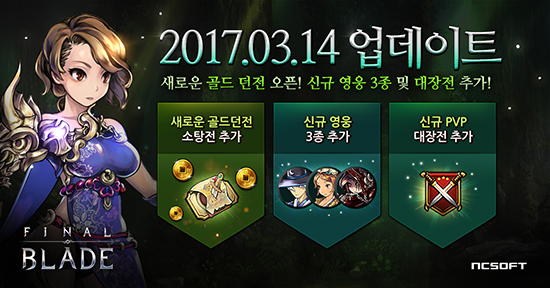 ¿£¾¾¼ÒÇÁÆ®ÀÇ ¸ð¹ÙÀÏ RPG(Role Playing Game, ¿ªÇÒ¼öÇà°ÔÀÓ) ¡®ÆÄÀ̳Πºí·¹À̵å(Final Blade)¡¯°¡ 14ÀÏ ½Å±Ô ÄÜÅÙÃ÷¸¦ Ãß°¡Çß´Ù. ÆÄÀ̳Πºí·¹À̵å ÀÌ¿ëÀÚµéÀº ¾÷µ¥ÀÌÆ®¸¦ ÅëÇØ ¢º»õ·Î¿î ÀüÅõ ¸ðµåÀÎ ´ëÀåÀü°ú ¼ÒÅÁÀü ¢º½Å±Ô ij¸¯ÅÍ 3Á¾À» ¸¸³¯ ¼ö ÀÖ´Ù. ´ëÀåÀüÀº ÀÌ¿ëÀÚ °£ ´ëÀü ÄÜÅÙÃ÷ÀÎ ºñ¹«´ëȸÀÇ »õ·Î¿î ¸ðµåÀÌ´Ù. ÀÌ¿ëÀÚµéÀº 3¸íÀÇ ¿µ¿õÀ» ÃâÀü½ÃÄÑ ´Ù¸¥ ÀÌ¿ëÀÚ¿Í 1´ë1 ´ëÀüÀ» Áñ±æ ¼ö ÀÖ´Ù. ¼ÒÅÁÀüÀº ÀûÀÇ °ø°ÝÀ» ¹æ¾îÇÏ´Â ÄÜÅÙÃ÷ÀÌ´Ù. ÀÌ¿ëÀÚ´Â 5¸íÀÇ ¿µ¿õÀ» ¼±ÅÃÇØ ÀûÀÇ °ø°ÝÀ» ¸·¾Æ¾ß ÇÑ´Ù. ±× °úÁ¤¿¡¼ ÀûÀÇ ±âÁö(¼Òȯ¹®)¸¦ ºÎ¼ö¸é ½Â¸®ÇÒ ¼ö ÀÖ´Ù. ¼ÒÅÁÀü¿¡ Âü¿©ÇÏ´Â ÀÌ¿ëÀÚ´Â 20´Ü°è·Î ³ª´²Áø ³À̵µ¸¦ ¼±ÅÃÇÒ ¼ö ÀÖ´Ù. ÀÌ¿ëÀÚ´Â ½Å±Ô ij¸¯ÅÍ 3Á¾À» ¸¸³¯ ¼ö ÀÖ´Ù. 6¼º ij¸¯ÅÍ 2Á¾(±¹È, Àû¿À)°ú 5¼º ij¸¯ÅÍ 1Á¾(°»ó¿ù)ÀÌ´Ù. ÆÄÀ̳Πºí·¹À̵å´Â ÈÀÌÆ®µ¥ÀÌ ±â³ä À̺¥Æ®¸¦ ÁøÇàÇÑ´Ù. ¸ðµç ÀÌ¿ëÀÚ´Â ¸ðÇè ¸ðµåÀÇ °¢ ´øÀü(Dungeon)¿¡¼ °ÔÀÓ ¾ÆÀÌÅÛ(¾Ë»çÅÁ, ¸·´ë»çÅÁ, ¿ÁÃá)À» ¾òÀ» ¼ö ÀÖ´Ù. ¾ÆÀÌÅÛÀº °ÔÀÓ ³» ±³È¯¼Ò¿¡¼ °ÔÀÓ ÀçÈ(±ÝÈ, ÁøÁÖ)·Î ±³È¯ÇÒ ¼ö ÀÖ´Ù. ÀÌ¿ëÀÚ´Â ±¸±Û Ç÷¹ÀÌ¿Í ¾ÖÇà ¾Û½ºÅä¾î¿¡¼ ¡®ÆÄÀ̳Πºí·¹À̵塯¸¦ ´Ù¿î·Îµå ¹ÞÀ» ¼ö ÀÖ´Ù.