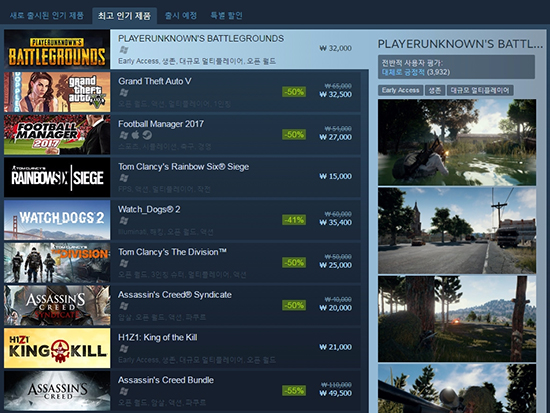 Áö³­ 24ÀÏ(±Ý) ½ºÆÀ(Steam) ¾ó¸®¾ï¼¼½º(Early Access)·Î ±Û·Î¹ú ¼­ºñ½º¸¦ ½ÃÀÛÇÑ ¡®¹èƲ±×¶ó¿îµå¡¯°¡ ÁÖ¸» µ¿¾È ÆÇ¸Å·® 40¸¸ÀåÀ» µ¹ÆÄÇÏ¸ç °¡ÆÄ¸¥ ¼ºÀå¼¼¸¦ º¸À̰í ÀÖ´Ù. Àα⠰ÔÀÓ ¡®GTA5¡¯¿Í ¡®Ç²º¼¸Å´ÏÀú2017¡¯À» Á¦Ä¡°í ½ºÆÀ ÃÖ°í Àαâ Á¦Ç° 1À§¿¡ ¿Ã¶úÀ¸¸ç, ÃÖ´ë µ¿½Ã Á¢¼ÓÀÚ¼ö´Â ¡®CS:GO(Counter-Strike: Global Offensive)¡¯¿Í ¡®µµÅ¸2(Dota2)¡¯¿¡ À̾î 3À§¸¦ ±â·ÏÇß´Ù.