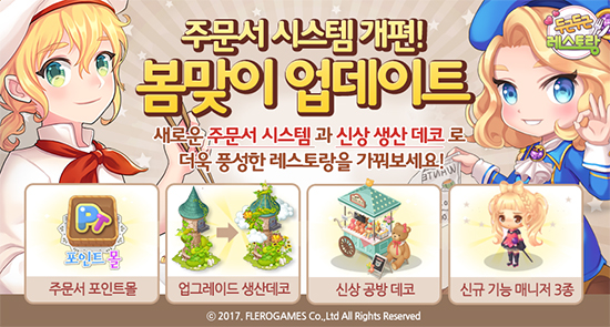 Ç÷¹·Î°ÔÀÓÁî´Â Àڻ簡 °³¹ß ¹× ¼ºñ½ºÇÏ´Â ·¹½ºÅä¶û °æ¿µ SNG 'µÎ±ÙµÎ±Ù ·¹½ºÅä¶û for Kakao'ÀÇ Æ÷ÀÎÆ®¸ô ¾÷µ¥ÀÌÆ®¸¦ ½Ç½ÃÇÑ´Ù°í 30ÀÏ(¸ñ) ¹àÇû´Ù. À̹ø ¾÷µ¥ÀÌÆ®¸¦ ÅëÇØ Ãß°¡µÇ´Â Æ÷ÀÎÆ®¸ôÀº °ÔÀÓ ³»¿¡¼ »ç¿ëÇÒ ¼ö ÀÖ´Â °¢Á¾ Àç·á¸¦ ºñ·ÔÇØ ÃÖ»ó±Þ º¸¼®,¾÷±×·¹À̵å Àç·á µîÀ» ȹµæÇÒ ¼ö ÀÖ´Â »óÁ¡ÀÌ´Ù. ÀÌ¿ëÀÚ´Â ±âÁ¸ÀÇ ÁÖ¹®¼ ½Ã½ºÅÛÀ» ÅëÇØ ÇÏÆ®, ÁÖ¹®¿Õ RP(·©Å· Æ÷ÀÎÆ®)¿Í ÇÔ²² Æ÷ÀÎÆ®¸ô¿¡¼ »ç¿ëÇÒ ¼ö ÀÖ´Â Æ÷ÀÎÆ®¸¦ ȹµæÇÒ ¼ö ÀÖ°í, À̸¦ ÅëÇØ Æ÷ÀÎÆ®¸ô¿¡¼ ¿øÇÏ´Â ¹°Ç°À» ±¸¸ÅÇÒ ¼ö ÀÖ°Ô µÈ´Ù. Æ÷ÀÎÆ®¸ôÀÇ ¾ÆÀÌÅÛÀº 24½Ã°£ °£°ÝÀ¸·Î ±³Ã¼µÅ ÀÌ¿ëÀÚµéÀº ¸ÅÀÏ »õ·Î¿î ǰ¸ñÀÇ ¾ÆÀÌÅÛÀ» ¸¸³¯ ¼ö ÀÖÀ¸¸ç, ¿øÇÏ´Â ¾ÆÀÌÅÛÀÌ Ç°¸ñ¿¡ ¾øÀ» °æ¿ì¿¡´Â °ÔÀÓ ³» Àçȸ¦ »ç¿ëÇØ ¸ñ·ÏÀÇ °»½ÅÀ» ¹Ù·Î ÁøÇàÇÒ ¼öµµ ÀÖ´Ù. ¾Æ¿ï·¯ ÀÌ¿ëÀÚµé °£ÀÇ ¹°Ç° °Å·¡¸¦ ÇÒ ¼ö ÀÖ´Â ´º½º¸¶ÄÏ¿¡ µî·ÏÇÒ ¼ö ÀÖ´Â ÆÇ¸Å ±Ý¾×µµ ´ëÆøÀ¸·Î »óÇâ Á¶Á¤µÈ´Ù. ¶ÇÇÑ Æ¯º°»óÁ¡¿¡¼ ´Ù¼öÀÇ ¹°Ç°À» ÆíÇÏ°Ô ±¸ÀÔÇÒ ¼ö ÀÖ´Â ¼ö·® ¼±Åà ÆíÀDZâ´Éµµ ¾÷µ¥ÀÌÆ®µÈ´Ù. Ç÷¹·Î°ÔÀÓÁî´Â ±Ý¹ø ¾÷µ¥ÀÌÆ®¸¦ ±â³äÇØ ´Ù¾çÇÑ À̺¥Æ®¸¦ ÁøÇàÇÑ´Ù. ¾÷µ¥ÀÌÆ® ´çÀÏÀÎ 3¿ù 30ÀÏ °ÔÀÓ¿¡ Á¢¼ÓÇÏ´Â ÀÌ¿ëÀÚµé Àü¿ø¿¡°Ô °ÔÀÓ ¾ÆÀÌÅÛÀ» ¼±¹°·Î Áö±ÞÇϸç, ¿À´Â ÀÏ¿äÀϱîÁö´Â ŽÇè º¸»ó 2¹è À̺¥Æ®µµ ÁøÇàµÈ´Ù. 'µÎ±ÙµÎ±Ù ·¹½ºÅä¶û for Kakao'´Â µ¿È ¼Ó ij¸¯Å͵é°ú ¾Æ±âÀÚ±âÇÑ ±×·¡ÇÈÀÌ Æ¯Â¡ÀÎ ·¹½ºÅä¶û °æ¿µ ¼Ò¼È °ÔÀÓÀ¸·Î, Áö³ 2014³â 8¿ù 26ÀÏ Ãâ½ÃÇÑ ÀÌ·¡ Áö±Ý±îÁö ÀÌ¿ëÀÚµéÀÇ ²ÙÁØÇÑ »ç¶ûÀ» ¹Þ°í ÀÖ´Ù. º» °ÔÀÓ¿¡ ´ëÇÑ º¸´Ù ÀÚ¼¼ÇÑ ¼Ò½ÄÀº °ø½Ä Ä«Æä(http://cafe.naver.com/fleroddr )¿¡¼ È®ÀÎÇÒ ¼ö ÀÖ´Ù.