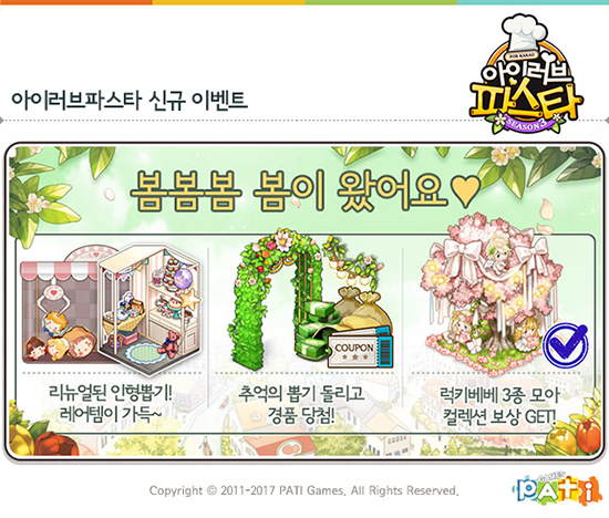 ÆÄƼ°ÔÀÓÁî°¡ °³¹ß ¹× ¼ºñ½ºÇÏ´Â ·¹½ºÅä¶û °æ¿µ ¼Ò¼È³×Æ®¿öÅ©°ÔÀÓ(SNG) '¾ÆÀÌ·¯ºêÆÄ½ºÅ¸ for Kakao'(ÀÌÇÏ ¾ÆÀÌ·¯ºêÆÄ½ºÅ¸)°¡ ¡®ÀÎÇü »Ì±â¡¯ Äڳʸ¦ ¸®´º¾ó ÇÏ´Â µî ¾÷µ¥ÀÌÆ®¸¦ ½Ç½ÃÇß´Ù. '¾ÆÀÌ·¯ºêÆÄ½ºÅ¸'´Â Áö³ 3¿ù ù¼±À» º¸ÀÎ ¡®ÀÎÇü »Ì±â¡¯ Äڳʰ¡ Àαâ¸ôÀ̸¦ ÇÔ¿¡ µû¶ó, ¡®¸®ÇÊ¡¯ ±â´ÉÀ» Ãß°¡ÇØ À¯ÀúµéÀÌ º¸´Ù ¿©·¯ ¹ø Áñ±æ ¼ö ÀÖµµ·Ï ¸®´º¾ó Çß´Ù. ÇØ´ç Äڳʴ ũ·¹ÀÎ Áý°Ô·Î ÀÎÇüÀ» Á¶ÁØÇØ È¹µæÇÏ´Â ÇüÅ·Î, ¿ÀÇÁ¶óÀÎ ÀÎÇü »Ì±â ±â±â¿Íµµ À¯»çÇÏ´Ù. ÁÖ¾îÁø ÀÎÇüÀ» ¸ðµÎ »Ì¾ÒÀ» °æ¿ì ¡®¸®ÇÊ¡¯ ±â´ÉÀ» ÀÌ¿ëÇØ Ãß°¡ µµÀü ÇÏ¸é µÈ´Ù. ÀÎÇü ȹµæ ½Ã Æ÷ÀÎÆ®°¡ ½×À̴µ¥, À̸¦ ¸ð¾Æ 26ÀϱîÁö Æ÷ÀÎÆ® »óÁ¡¿¡¼ ¡®ÇÇÅ©´Ð ÇÞ/¿øÇǽº¡¯, ¡®¿ÀÈÄÀÇ Ã¥ Àд â°¡¡¯ µî ´Ù¾çÇÑ ·¹¾î ¾ÆÀÌÅÛ°ú ±³È¯ ÇÒ ¼ö ÀÖ´Ù. ¡®¸®ÇÊ¡¯ ±â´ÉÀ¸·Î µµÀü Ƚ¼ö°¡ ´Ã¾î³ ¸¸Å º¸´Ù ¸¹Àº Æ÷ÀÎÆ®¸¦ ȹµæÇØ ·¹¾î ¾ÆÀÌÅÛ ±³È¯¿¡ ÀÌ¿ë ÇÒ ¼ö ÀÖÀ» °ÍÀ¸·Î Àü¸ÁµÈ´Ù. ¹«·á º¸»óÀ» Á¦°øÇÏ´Â ¡®Ãß¾ïÀÇ »Ì±â À̺¥Æ®¡¯µµ 27ÀÏ Á¤±â ¾÷µ¥ÀÌÆ® ÀÌÀü±îÁö ÁøÇàÇÑ´Ù. ¹«·á »Ì±â¸¦ ÅëÇØ ¡®´ç÷ ±¸½½¡¯, ¡®±Ý ±¸½½¡¯, ¡®Àº ±¸½½¡¯ Áß ÇÑ °¡Áö¸¦ ·£´ý ȹµæÇϰí, °¢ ±¸½½ Á¾·ù¿¡ µû¶ó ¡®°ñµå¡¯, ¡®ÆÛÁñ¡¯, ¡®Ä³½Ã µîÀÇ º¸»óÀ» ¾òÀ» ¼ö ÀÖ´Ù. ƯÈ÷ ¡®´ç÷ ±¸½½¡¯ ȹµæ ½Ã ¡®½ºÇÁ¸µ°¡µç Á¶¸í °¥·±µå¡¯, ¡®·ÎÄÚÄÚ 3´ÜÃÐºÒ º®³·Î¡¯ µî ij½Ã·Î ÆÇ¸ÅµÇ´Â ¾ÆÀÌÅÛÀ» ¹ÞÀ» ¼ö ÀÖ´Ù. ¡®Ãß¾ïÀÇ »Ì±â¡¯´Â 4½Ã°£¿¡ ÇÑ ¹ø ÁøÇà °¡´ÉÇÏ´Ù. ¶ÇÇÑ À̹ø ¾÷µ¥ÀÌÆ® ÀÌÈÄ ¡®·°Å°º£º£¡¯ 3Á¾(¿þµùȵ¿/¿£Æ½/Å¥Çǵå)À» ¸ðÀº À¯Àú¿¡°Ô ¡®¸®º»Àå½Ä º¢³ª¹«¡¯¸¦ Ä÷º¼Ç º¸»óÀ¸·Î Áö±ÞÇÑ´Ù. À̿ܿ¡µµ ½ºÅäºê/¿Àºì/±×¸±/ÇÇÀÚ¸Þ´º ÃÖ°í ·¹º§À» ±âÁ¸ 5¿¡¼ 10À¸·Î È®ÀåÇØ Ãß°¡ ij½Ã¸¦ ȹµæ ÇÒ ¼ö ÀÖÀ¸¸ç, ÃæÀü ±Ý¾×¿¡ µû¶ó ¡®ÀΰøÆøÆ÷ Á¤¿ø¡¯ ¾ÆÀÌÅÛÀ» Áö±ÞÇÏ´Â ¡®Ä³½Ã ÃæÀü À̺¥Æ®¡¯¸¦ 26ÀϱîÁö ÁøÇàÇÑ´Ù. °°Àº ±â°£ ¡®½ºÅ×Àεå±Û¶ó½º ÁöºØ/¼±ÂøÀå/°è´Ü¡¯ ¾ÆÀÌÅÛµµ ÇÑÁ¤ ÆÇ¸ÅÇÑ´Ù. '¾ÆÀÌ·¯ºêÆÄ½ºÅ¸'¿¡ ´ëÇÑ º¸´Ù ÀÚ¼¼ÇÑ »çÇ×Àº °ø½Ä Ä¿¹Â´ÏƼ(http://cafe.naver.com/ilovepastamo bile)¿¡¼ È®ÀÎ °¡´ÉÇÏ´Ù.