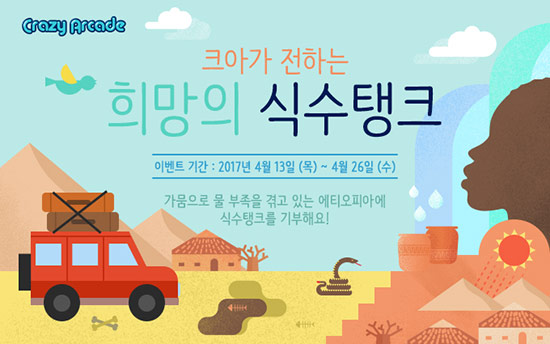 ³Ø½¼Àº 13ÀÏ Àڻ簡 ¼ºñ½ºÇÏ´Â ¿Â¶óÀΰÔÀÓ ¡®Å©·¹ÀÌÁö ¾ÆÄÉÀ̵塯¿¡¼ °ÔÀÓ ³» ¡®½ÅºñÇÑ ¹°¹æ¿ï¡¯À» ¸ð¾Æ ¿¡Æ¼¿ÀÇǾƿ¡ ½Ä¼ö¸¦ Áö¿øÇÏ´Â À̺¥Æ®¸¦ ½Ç½ÃÇÑ´Ù°í ¹àÇû´Ù. ¡®Å©¾Æ°¡ ÀüÇÏ´Â Èñ¸ÁÀÇ ½Ä¼öÅÊÅ©¡¯·Î ÁøÇàµÇ´Â À̹ø À̺¥Æ®´Â °¡¹³À¸·Î 560¸¸ ¸íÀÌ À§±â¿¡ ÀÖ´Â ¿¡Æ¼¿ÀÇǾƿ¡ ½Ä¼ö¸¦ Áö¿øÇϰíÀÚ ¸¶·ÃµÆÀ¸¸ç, À¯ÀúµéÀº °ÔÀÓ Ç÷¹À̸¦ ÅëÇØ ¼Õ½±°Ô Âü¿©ÇÒ ¼ö ÀÖ´Ù. ¿À´Â 4¿ù 26ÀϱîÁö °ÔÀÓ Ç÷¹À̸¦ ÅëÇØ ȹµæÇÑ ¡®½ÅºñÇÑ ¹°¹æ¿ï¡¯À» ¸ð¾Æ ¡®Å©´Ù¼ö¡¯·Î Á¦ÀÛÇϰí, ȨÆäÀÌÁö¸¦ ÅëÇØ ¡®Èñ¸ÁÀÇ ½Ä¼öÅÊÅ©¡¯¿¡ ¡®Å©´Ù¼ö¡¯¸¦ ±âºÎÇÏ¸é µÈ´Ù. ¡®Èñ¸ÁÀÇ ½Ä¼öÅÊÅ©¡¯°¡ ¸ñÇ¥ÇÑ ¼öÄ¡¸¦ ´Þ¼ºÇÏ¸é ¡®Å©´Ù¼ö¡¯ ±âºÎ¿¡ Âü¿©ÇÑ À¯Àú Àü¿ø¿¡°Ô ¡®À§¼¼ÀÌºê ¹°Ç³¼±¡¯ ¾ÆÀÌÅÛÀ» Áö±ÞÇϰí, Ãß÷À» ÅëÇØ 100¸í¿¡°Ô ¡®³Ø½¼ ij½Ã¡¯¸¦ ¼±¹°ÇÑ´Ù. ¶Ç, ¡®Å©´Ù¼ö ±âºÎ¿ÕS¡¯ TOP10¿¡ ¿À¸£¸é Ưº°ÄªÈ£¸¦ Á¦°øÇÑ´Ù. ³Ø½¼Àº ¡®Å©¾Æ°¡ ÀüÇÏ´Â Èñ¸ÁÀÇ ½Ä¼öÅÊÅ©¡¯·Î ¸¶·ÃµÈ ±âºÎ±ÝÀ» ±¹Á¦ ±¸È£°³¹ß NGO ¼¼À̺ê´õÄ¥µå·±¿¡ Àü´Þ, ¿¡Æ¼¿ÀÇǾƿ¡ 18¸¸ ¸®ÅÍÀÇ ½Ä¼ö¿Í ½Ä¼öÅÊÅ©¸¦ °ø±ÞÇϴµ¥ »ç¿ëµÉ ¿¹Á¤ÀÌ´Ù. ÇÑÆí, ¡®Å©·¹ÀÌÁö ¾ÆÄÉÀ̵塯´Â ¹° dz¼±À» »ç¿ëÇØ »ó´ë¸¦ °ø°ÝÇϴ ijÁÖ¾ó ´ëÀü ¿Â¶óÀÎ °ÔÀÓÀ¸·Î ±ôÂïÇÑ Ä³¸¯ÅÍ¿Í ¾Æ±âÀÚ±âÇÑ ±×·¡ÇÈ, Æø³ÐÀº ¿¬·É´ë¸¦ ¾Æ¿ì¸£´Â ½¬¿î °ÔÀÓ¼ºÀ» °®Ãè´Ù. ¡®Å©·¹ÀÌÁö¾ÆÄÉÀ̵塯 °ÔÀÓ¿¡ °üÇÑ º¸´Ù ÀÚ¼¼ÇÑ ³»¿ëÀº °ø½Ä »çÀÌÆ®¿Í °ø½Ä Ä«Æä¿¡¼ È®ÀÎÇÒ ¼ö ÀÖ´Ù.