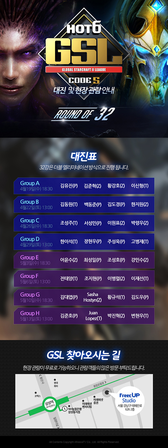 '2017 ÇֽĽº GSL ½ÃÁð2' ÄÚµåS °æ±â´Â ¸ÅÁÖ ¼ö¿äÀÏ ¿ÀÈÄ 6½Ã 30ºÐ°ú Åä¿äÀÏ ¿ÀÈÄ 1½ÃºÎÅÍ ¼­¿ï ´ëÄ¡µ¿ ¾ÆÇÁ¸®Ä«TV ÇÁ¸¯¾÷ ½ºÆ©µð¿À¿¡¼­ »ýÁß°èµÈ´Ù. 32°­°ú 16°­Àº 3Àü 2¼±½ÂÁ¦ ´õºí ¿¤¸®¹Ì³×ÀÌ¼Ç Åä³Ê¸ÕÆ® ¹æ½Ä(4ÀÎ 1Á¶)À¸·Î ÁøÇàµÇ¸ç, 8°­Àº 5Àü 3¼±½ÂÁ¦, 4°­ ¹× °á½ÂÀº 7Àü 4¼±½ÂÁ¦ ½Ì±Û Åä³Ê¸ÕÆ®·Î ¿­¸°´Ù. À̹ø ½ÃÁð ÃÑ »ó±ÝÀº 1¾ï 7õ¸¸¿øÀÇ ±Ô¸ðÀ̸ç, ¿ì½ÂÀÚ¿¡°Ô´Â »ó±Ý 4õ¸¸¿ø°ú ÇÔ²² WCS ±Û·Î¹ú ÆÄÀ̳ΠÁ÷Çà ½Ãµå°¡ ÁÖ¾îÁø´Ù.
