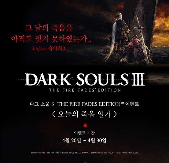 ÇÑÆí PS4 ¹× PC¿ë ¾×¼Ç RPG ¡®´ÙÅ©¼Ò¿ï 3: THE FIRE FADES EDITION¢â¡¯ÀÇ ¹ß¸Å¸¦ ±â³äÇÏ¿©, ¹Ý´ÙÀ̳²ÄÚ ¿£ÅÍÅ×ÀÎ¸ÕÆ® ÄÚ¸®¾Æ °ø½Ä ºí·Î±×¿¡¼´Â ¿À´Â 2017³â 4¿ù 30ÀϱîÁö ¹ß¸Å ±â³ä À̺¥Æ®¸¦ ÁøÇàÇÑ´Ù. ¡®´ÙÅ©¼Ò¿ï 3: THE FIRE FADES EDITION¢â¡¯ÀÇ À̺¥Æ® Ư¼³ ÆäÀÌÁö (URL: http://bneblog.co.kr/220987906093 )¿¡¼ Âü°¡ÇÒ ¼ö ÀÖ´Ù.