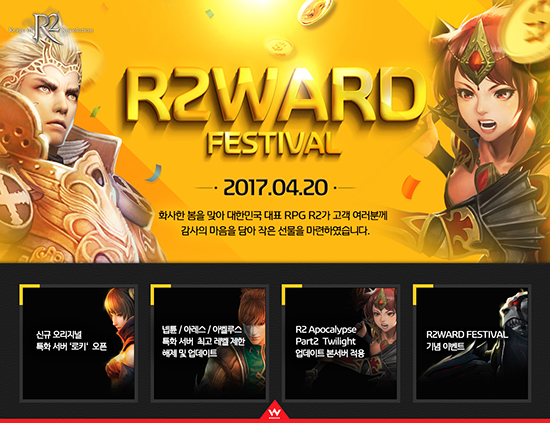 À¥Á¨ÀÇ Àå¼ö PC¿Â¶óÀΰÔÀÓ ¡®R2¡¯´Â ¾îÁ¦(4¿ù20ÀÏ) ¡®¾Æ¸Ó Å©·¯½¬¡¯, ¡®½ºÅ³ Å©·¯½¬¡¯ µîÀÇ ½Å±Ô ½ºÅ³°ú ¡®¹«ÇÑÀÇ ¾Ç¼¼¼­¸®¡¯¸¦ Ãß°¡ÇÏ´Â ¡®Apocalypse Part2-Twilight¡¯ ¾÷µ¥ÀÌÆ®¸¦ Àû¿ëÇÏ°í ±â³ä À̺¥Æ®¸¦ °ø°³Çß´Ù.
