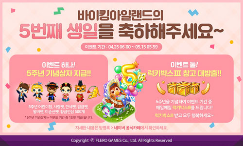 Ç÷¹·Î°ÔÀÓÁî´Â <¹ÙÀÌÅ· ¾ÆÀÏ·£µå>ÀÇ ¼ºñ½º 5ÁÖ³âÀ» ¸Â¾Æ ´Ù¾çÇÑ À̺¥Æ®¸¦ ÇÔ²² ÁøÇàÇÑ´Ù. īī¿ÀÅå °ÔÀÓ ÅÇ ¸®½ºÆ®¿¡¼ ÁøÁÖ 300°³ÀÇ ¼±¹°À» ¼ö·ÉÇÒ ¼ö ÀÖ´Â º¸»óÇü À̺¥Æ®, ±×¸®°í 5¿ù 11ÀϱîÁö °ÔÀÓ¿¡ Á¢¼ÓÇϸé 5Áֳ⠱â³ä °ÔÀÓ ¾ÆÀÌÅÛ°ú ·°Å°¹Ú½ºIII ¾ÆÀÌÅÛÀ» ¹ÞÀ» ¼ö ÀÖ´Â Á¢¼Ó À̺¥Æ®°¡ ÁøÇàµÈ´Ù. ¶ÇÇÑ ¹ÌÁ¢¼Ó º¹±ÍÀÚÀÇ º¸»óÀ» ´ëÆø »óÇâÇÔ°ú ÇÔ²², ¸ÅÁÖ ÁÖ¸»¸¶´Ù °æÇèÄ¡ ¹× °ñµåÀÇ ¹è¼ö°¡ »óÇâµÇ´Â ¹öÇÁ À̺¥Æ®ÀÇ ÇýÅÃÀÌ ÇÔ²² ÁÖ¾îÁø´Ù.