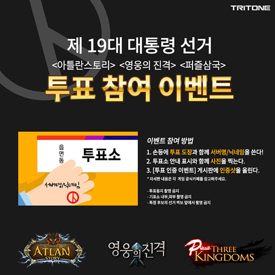 Æ®¶óÀÌÅæÀº Àڻ翡¼ ¼ºñ½ºÇÏ´Â ´ëÇ¥ ¸ð¹ÙÀÏ RPG °ÔÀÓÀÎ ¾ÆÆ²¶õ½ºÅ丮, ¿µ¿õÀÇ Áø°Ý ¹× ÆÛÁñ»ï±¹ À¯Àú¸¦ ´ë»óÀ¸·Î ´ë±Ô¸ð ¡®´ë¼± ÅõÇ¥ Âü¿© Ä·ÆäÀΡ¯À» ÁøÇàÇÑ´Ù°í ¹àÇû´Ù. Æ®¶óÀÌÅæÀÇ À̹ø ÅõÇ¥Âü¿© Ä·ÆäÀÎÀº ±ÝÀÏ(4ÀÏ)ºÎÅÍ ÁøÇàµÇ´Â Á¦19´ë ´ëÅë·É ¼±°Å »çÀü ÅõÇ¥¿¡ ¸ÂÃç ½ÃÀÛµÇ¾î ´ë¼± ´ÙÀ½ ³¯ÀÎ 10ÀÏ(¼ö)±îÁö ÁøÇàµÇ¸ç, À¯ÀúµéÀº °¢ °ÔÀÓ °ø½Ä Ä¿¹Â´ÏƼ¸¦ ÅëÇØ ¡®´ë¼± ÅõÇ¥ Âü¿© À̺¥Æ®¡¯¿¡ Âü¿©ÇÒ ¼ö ÀÖ´Ù. Æ®¶óÀÌÅæÀº À̹ø À̺¥Æ®¿¡ Âü¿©ÇÑ À¯Àúµé¿¡°Ô ÃÖ´ë 9¸¸¿ø »ó´çÀÇ °ÔÀÓÀçȸ¦ Á¦°øÇÒ ¿¹Á¤ÀÌ´Ù. Æ®¶óÀÌÅæÀº À̹ø ´ë¼± À̺¥Æ®»Ó ¾Æ´Ï¶ó 1³â ÀüÀÎ Áö³ 16³â ÃѼ± ¶§¿¡µµ ÅõÇ¥ Âü¿© À̺¥Æ®¸¦ ÁøÇàÇÏ¸ç ¸¹Àº À¯ÀúµéÀÇ Âü¿©¸¦ À̲ø¾î³½ ¹Ù ÀÖÀ¸¸ç, Àڻ翡¼ ¼ºñ½ºÇÏ´Â ¿µ¿õÀÇ Áø°Ý(±Û·Î¹ú ¼ºñ½º¸í : Heroes Will)ÀÇ ±¹³» ¹× ÇØ¿Ü ÆäÀ̽ººÏ ÆäÀÌÁö µîÀ» ÅëÇØ ÁÖ¿ä »çȸ À̽´°¡ ÀÖÀ» ¶§ À¯Àú¿Í °ø°¨ÇÏ´Â Ä·ÆäÀÎÀ» ÁøÇàÇØ¿Â ¹Ù ÀÖ´Ù. ÇÑÆí, Æ®¶óÀÌÅæÀº ÃÖ±Ù Àü ¼¼°è 400¸¸ À¯ÀúÀÇ ¸íÀÛ ¸ð¹ÙÀÏ RPG ¡®¾ÆÆ²¶õ½ºÅ丮¡¯(±Û·Î¹ú ¼ºñ½º¸í : Heroes of Atlan)ÀÇ ±Û·Î¹ú ÆÛºí¸®½Ì °è¾àÀ» ü°áÇÏ°í ¼ºñ½º¸¦ ÁøÇà ÁßÀ̸ç, ¹Ì±¹, ij³ª´Ù, ¿µ±¹, ÇÁ¶û½º µî À¯·´ ÁÖ¿ä±¹°¡¿Í ·¯½Ã¾Æ µîÀ» Áß½ÉÀ¸·Î ¼ºñ½º ÁßÀÎ ¿µ¿õÀÇ Áø°Ý(±Û·Î¹ú ¼ºñ½º¸í : Heroes will)°ú ÇÔ²² Àü ¼¼°è ½ÃÀå¿¡ ´ëÇÑ »ç¾÷¿ª·®À» º»°ÝÀûÀ¸·Î È®´ëÇØ³ª°¡°í ÀÖ´Ù.