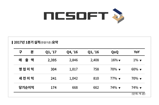 ¿£¾¾¼ÒÇÁÆ®°¡ 2017³â 1ºÐ±â ½ÇÀû °á»ê(¿¬°á±âÁØ) °á°ú ¸ÅÃâ 2,395¾ï ¿ø, ¿µ¾÷ÀÌÀÍ 304¾ï ¿ø, ´ç±â¼øÀÌÀÍ 174¾ï ¿øÀ» ±â·ÏÇß´Ù. Àü³â µ¿±â ´ëºñ ¸ÅÃâ°ú ¿µ¾÷ÀÌÀÍÀº °¢°¢ 1%, 60% °¨¼ÒÇß°í, ´ç±â¼øÀÌÀÍÀº 74% °¨¼ÒÇß´Ù. ÀüºÐ±â ´ëºñ ¸ÅÃâ, ¿µ¾÷ÀÌÀÍ, ´ç±â¼øÀÌÀÍÀº °¢°¢ 16%, 70%, 74% °¨¼ÒÇß´Ù. ºÐ±â ¸ÅÃâÀ» Áö¿ªº°·Î »ìÆìº¸¸é, Çѱ¹ 1,276¾ï ¿ø, ºÏ¹Ì/À¯·´ 283¾ï ¿ø, ÀϺ» 106¾ï ¿ø, ´ë¸¸ 95¾ï ¿øÀÌ´Ù. ·Î¿Æ¼ ¸ÅÃâÀº 635¾ï ¿øÀÌ´Ù. Á¦Ç° º°·Î´Â ¸®´ÏÁö 515¾ï ¿ø, ¸®´ÏÁö2 184¾ï ¿ø, ¾ÆÀ̿ 133¾ï ¿ø, ºí·¹À̵å & ¼Ò¿ï(ÀÌÇÏ ºí¼Ò) 446¾ï ¿ø, ±æµå¿ö2 142¾ï ¿ø, ±âŸ ¸ð¹ÙÀÏ ¹× ijÁÖ¾ó °ÔÀÓ µî 340¾ï ¿øÀ» ±â·ÏÇß´Ù. ¸®´ÏÁö¿Í ¾ÆÀÌ¿ÂÀÇ 1ºÐ±â ½ÇÀûÀº Àü³âµ¿±â ¹× ÀüºÐ±â ´ëºñ °¨¼ÒÇß´Ù. ÇÁ·Î¸ð¼ÇÀÌ Áö³ 4ºÐ±â¿¡ ÁýÁߵǾú°í °èÀýÀû ¿äÀεµ ¹Ý¿µµÇ¾ú´Ù. ºí¼ÒÀÇ ¸ÅÃâÀº ±¹³»ÀÇ ºÎºÐÀ¯·áÈ Àüȯ°ú ºÏ¹Ì/À¯·´ÀÇ ¾÷µ¥ÀÌÆ® È¿°ú·Î ÀüºÐ±â ´ëºñ 13% »ó½ÂÇß´Ù. ¿£¾¾¼ÒÇÁÆ®´Â »ó¹Ý±â Áß ¸ð¹ÙÀÏ °ÔÀÓ ¸®´ÏÁöMÀ» ±¹³»¿¡ Ãâ½ÃÇÑ´Ù. ÁÖ¿ä IP(Intellectual Property, Áö½ÄÀç»ê±Ç)¸¦ Ȱ¿ëÇÑ ´Ù¾çÇÑ À帣ÀÇ ½Å±Ô °ÔÀÓµµ ¼øÂ÷ÀûÀ¸·Î ¼±º¸ÀÏ °èȹÀÌ´Ù.