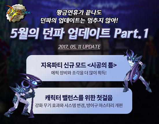 ³Ø½¼Àº 11ÀÏ Àα⠿¶óÀÎ ¾×¼Ç°ÔÀÓ ¡®´øÀü¾ØÆÄÀÌÅÍ(ÀÌÇÏ ´øÆÄ)¡¯¿¡ ½Å±Ô ´øÀü ¡®½Ã°øÀÇ Æ´¡¯À» Ãß°¡Çß´Ù. ¡®½Ã°øÀÇ Æ´¡¯Àº ¡®Áö¿Á ÆÄƼ¡¯, ¡®¸¶°èÀÇ Æ´¡¯¿¡ ÀÌ¾î ¼¼ ¹øÂ°·Î ¼±º¸ÀÌ´Â ¡®Áö¿Á ÆÄƼ ¸ðµå¡¯ÀÇ ½Å±Ô ´øÀüÀ¸·Î, ±âÁ¸ ´øÀü º¸´Ù ¡®¿¡ÇÈ¡¯ µî±ÞÀÇ Àåºñ¿Í Àç·á¸¦ ´õ¿í ¸¹ÀÌ È¹µæÇÒ ¼ö ÀÖ´Â °ÍÀÌ Æ¯Â¡ÀÌ´Ù. ¡®Áö¿ÁÆÄƼ ÃÊ´ëÀ塯À» »ç¿ëÇØ Ƚ¼ö Á¦ÇÑ ¾øÀÌ ÀÔÀåÇÒ ¼ö ÀÖÀ¸¸ç, ´øÀü¿¡ µîÀåÇÏ´Â ¡®¹Ù¸®¿¤¡¯ ¶Ç´Â ¡®Æ©¸®¿¤¡¯À» óġÇÒ °æ¿ì º¸»óÀ» ȹµæÇÒ ¼ö ÀÖ´Ù. ƯÈ÷, ¡®½Ã°øÀÇ Æ´¡¯ ÀÔÀå ½Ã ¹«ÀÛÀ§·Î ¿ÀǵǴ Ư¼ö ´øÀüÀ» ¿Ï·áÇÒ °æ¿ì ¡®¿¡ÇÈ Àåºñ¡¯¿Í ¡®¿¡ÇÈ Á¶°¢¡¯À» Ãß°¡·Î ȹµæÇÒ ¼ö ÀÖ´Ù. ÀÌ ¹Û¿¡µµ ij¸¯ÅÍ ¹ë·±½º °³ÆíÀÇ ÀÏȯÀ¸·Î °È ¹«±â È¿°ú¿Í ½Ã½ºÅÛ º¯°æ, ¹æ¾î±¸ ¸¶½ºÅ͸®(Ãß°¡ ´É·ÂÄ¡)¿¡ ´ëÇÑ °³¼±ÀÌ ÀÌ·ïÁ³´Ù. ³Ø½¼Àº À̹ø ¾÷µ¥ÀÌÆ®¸¦ ±â³äÇØ ¿À´Â 25ÀϱîÁö ¸ÅÀÏ ¡®·¹¾î ¾Æ¹ÙŸ¡¯¸¦ 24½Ã°£ ¹«·á·Î »ç¿ëÇÒ ¼ö ÀÖ´Â À̺¥Æ®¸¦ ÁøÇàÇÑ´Ù. À̹ø ¡®½Ã°øÀÇ Æ´¡¯ ¾÷µ¥ÀÌÆ® ¹× À̺¥Æ®¿¡ °üÇÑ º¸´Ù ÀÚ¼¼ÇÑ »çÇ×Àº °ø½Ä ȨÆäÀÌÁö¸¦ ÅëÇØ È®ÀÎÇÒ ¼ö ÀÖ´Ù.