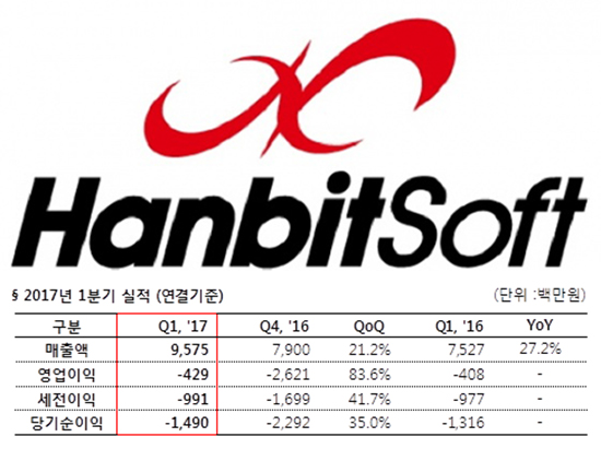 [ÇѺû¼ÒÇÁÆ®] 2017³â 1ºÐ±â ¸ÅÃâ ÀüºÐ±â ´ëºñ 21% »ó½Â ¹× ¿µ¾÷¼ÕÀÍ 84% °³¼± |