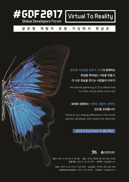 °æ±âµµ¿Í °æ±âÄÜÅÙÃ÷ÁøÈï¿øÀº ¿À´Â 25Àϰú 26ÀÏ ¾çÀϰ£ ŲŨ½º Á¦2Àü½ÃÀå¿¡¼ °³ÃÖÇÏ´Â °¡»ó/Áõ°Çö½Ç ±Û·Î¹ú°³¹ßÀÚÆ÷·³ ¡®Global Developers Forum 2017¡¯(ÀÌÇÏ #GDF2017)ÀÇ ÁÖ¿ä ¿¬»ç ¹× °¿¬ ³»¿ëÀ» 17ÀÏ °ø°³Çß´Ù. '°¡»ó¿¡¼ Çö½Ç·Î(Virtual To Reality)'¸¦ ÁÖÁ¦·Î ¿¸®´Â '#GDF2017'Àº VR/ARÀ» öÇÐ, Àι®ÇÐ µî ´Ù¾çÇÑ °üÁ¡¿¡¼ ¹Ù¶óº¸´Â °ÍÀ» ½ÃÀÛÀ¸·Î VR/AR»ê¾÷ÀÇ ½Å±â¼ú°ú °³¹ß ³ëÇÏ¿ì Á¤º¸ ±³·ù¸¦ À§ÇØ ¸¶·ÃµÆ´Ù. À̹ø Çà»ç´Â ¼¼°è °¢±¹ VR/AR ºÐ¾ß ÇÙ½ÉÀλç 32ÀÎÀÌ Âü¿©ÇÏ¿© 31°³ÀÇ ÁÖÁ¦·Î ´Ù¾çÇÑ °¿¬µéÀÌ ÁøÇàµÈ´Ù. ¸ÕÀú 25ÀÏ¿¡´Â ÀÌÀçÀ² °æ±âµµ ÇàÁ¤1ºÎÁö»ç°¡ ¡®4Â÷ »ê¾÷Çõ¸í½Ã´ë VR/ARÀÇ ¹ßÀü°¡´É¼º°ú ¹Ì·¡°¡Ä¡, °æ±âµµ VR/AR Á¤Ã¥¡¯À» ÁÖÁ¦·Î ±¹³» ±âÁ¶¿¬¼³À», ¿µ±¹ ¸Çü½ºÅÍ ¸ÞÆ®·ÎÆú¸®Åº ´ëÇÐ ±³¼öÀ̸ç, International AR and VR ÄÁÆÛ·±½º ÀÇÀåÀ» ¿ªÀÓÇϰí ÀÖ´Â Á¤Çü¼ö(Timothy Jung) ±³¼ö°¡ ¡®4Â÷ »ê¾÷Çõ¸í½Ã´ëÀÇ ºñÁî´Ï½º ±âȸ¡¯¸¦ ÁÖÁ¦·Î ±Û·Î¹ú ±âÁ¶¿¬¼³À» ¸Ã´Â´Ù. ÀÌ¾î ¡ã¼±´í½º ¿µÈÁ¦¿¡¼ VR´ÙÅ¥ Á¦·Î Æ÷ÀÎÆ®(Zero Point)¸¦ ¼±º¸ÀÎ À̸ÖÀüÆ® VR(Emergent VR)ÀÇ ÇÇÅÍ ÀªÅ²½º(Peter wilkins) ´ëÇ¥ ¡ãÀü ¼¼°èÀûÀ¸·Î ¼ö¸¹Àº ¿µÈ»óÀ» ÈÛ¾µ¾ú´ø VR ¾Ö´Ï¸ÞÀÌ¼Ç ¡®Àκ£ÀÌÀü!(Invasion!)¡¯°ú ¡®¾Æ½ºÅ×·ÎÀ̵å!(Asteriods!)¡¯ Á¦ÀÛ»ç ¹Ù¿À¹ä ½ºÆ©µð¿À(Baobab Studio)ÀÇ Á¶³ª´Ü Ç÷¹¼Å(Jonathan Flesher) ºÎ»çÀå ¡ã¹Ì±¹ ÃÖ´ë VRÆÝµåÀÎ ¡®´õ VR ÆÝµå(The VR Fund)¡¯ÀÇ °øµ¿Ã¢¾÷ÀÚ °â ÃѰýÆÄÆ®³Ê ÆÂÆÌÅ¿ ü³ª¹Ù½Å(Tipatat Chennavasin) ´ëÇ¥ µîÀÌ ´Ù¾çÇÑ ºÐ¾ßÀÇ ½Ã°¢¿¡¼ ¹Ù¶óº¸´Â VR/AR »ê¾÷À» À̾߱âÇÒ ¿¹Á¤ÀÌ´Ù. 26ÀÏÀº ¿ÀÀü 10½ÃºÎÅÍ µÎ °³ÀÇ °¿¬Àå¿¡¼ ÁÖÁ¦¸¦ ³ª´©¾î °¿¬À» ÁøÇàÇÑ´Ù. 1°¿¬Àå¿¡¼´Â 'VR ÀÀ¿ë±â¼ú°ú Á¦ÀÛ±â¹ý'À» ÁÖÁ¦·Î Ä«À̽ºÆ® ¹®È±â¼ú´ëÇпøÀå ¿ø±¤¿¬ ±³¼öÀÇ ¡®4Â÷ »ê¾÷Çõ¸í°ú °¡»óÇö½Ç¡¯, öÇÐÀÚ °½ÅÁÖ ¹Ú»çÀÇ ¡®Ã¶Çаú °¡»óÇö½Ç-°¨°¢ÀÇ ³í¸®¸¦ Áß½ÉÀ¸·Î¡¯ µî 10°³ ÁÖÁ¦ÀÇ °¿¬ÀÌ ÆîÃÄÁø´Ù. 2°¿¬Àå¿¡¼´Â ¡®VR/AR ÄÜÅÙÃ÷ ¼ºñ½º¡¯¸¦ ÁÖÁ¦·Î ÀϺ» ÄÚ·ÎÇà ³Ø½ºÆ®(colopl Next)»çÀÇ ¾ß¸¶°¡¹Ì ½ÅŸ·Î(Shintaro Yamagami) ´ëÇ¥ÀÇ ¡®ÀϺ» VRÄÜÅÙÃ÷ ½ÃÀå°ú ÅõÀÚ½ÃÀ塯, Ŭ¸¯Æ®(Clicked) Á¤´ö¿µ ´ëÇ¥ÀÇ È¿°úÀûÀÎ VRÄÜÅÙÃ÷ ½Ã¿¬ ±â¼ú µî 10°³ ÁÖÁ¦ÀÇ °¿¬ÀÌ ÁøÇàµÈ´Ù. ´õºÒ¾î 26ÀÏ ¿ÀÀü 10½ÃºÎÅÍ 12½Ã±îÁö ¹Ù¸¥¼Õ °½Å¹ü ´ëÇ¥ÀÇ ¡®Çѱ¹Çü VRÅ׸¶ÆÄÅ© ±¸¼º°ú ÄÜÅÙÃ÷ ±âȹ¡¯, ºí·çÇÁ¸°Æ® ¸®¾ó¸®Æ¼(Blueprint Reality) Å׸® Àª¸®¾Ï½º(Tarrnie Williams) ´ëÇ¥ÀÇ ¡®¿Ö º¥Äí¹ö°¡ VR°³¹ßÀÇ ¸ÞÄ«Àΰ¡¡¯ µîÀÇ °Àǰ¡ ŲŨ½º Á¦2Àü½Ã°ü B2B°ü 6Ȧ¿¡¼ ¿¸°´Ù. Ãְ赿 ¹®ÈüÀ°°ü±¤±¹ÀåÀº ¡°À̹ø Çà»ç´Â ±¹³» 4Â÷ »ê¾÷Çõ¸íÀÇ Áß½ÉÁö·Î ²ÅÈ÷°í ÀÖ´Â °æ±âµµ°¡ VR/AR»ê¾÷ À°¼ºÀ» À§ÇØ ¸¶·ÃÇÑ ÀÚ¸®¡±À̸ç, ¡°±¹³»¿Ü VR/AR »ê¾÷¿¡¼ Å« ȹÀ» ±ß°í ÀÖ´Â 32¸íÀÇ Àü¹®°¡µé°ú ÇÔ²² VR/ARÆ®·»µå¸¦ »ìÆìº¸°í °³¹ß ³ëÇϿ츦 °øÀ¯ÇÒ ¼ö ÀÖ´Â ÀÚ¸®°¡ µÉ °Í¡±À̶ó°í ¸»Çß´Ù. '#GDF2017'Àº VR/AR °³¹ß ¹× °ü·Ã »ê¾÷¿¡ °ü½É ÀÖ´Â ´©±¸³ª Âü¿© °¡´ÉÇϸç, Âü°¡ºñ´Â ¡ã»çÀüµî·Ï ½Ã 3¸¸¿ø ¡ãÇöÀåµî·Ï ½Ã 5¸¸¿ø ¡ãÇлý(´ëÇпø»ý Æ÷ÇÔ)Àº »çÀüµî·Ï ¹× ÇöÀåµî·Ï ¸ðµÎ 1¸¸¿øÀÌ´Ù. »ó¼¼ÇÑ Á¤º¸´Â °ø½Ä ȨÆäÀÌÁö(www.gdf.or.kr)¿¡¼ È®ÀÎÀÌ °¡´ÉÇÏ´Ù.