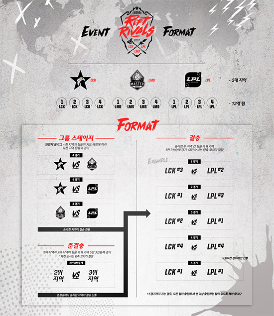 ¡®¸®±× ¿Àºê ·¹Àüµå(ÀÌÇÏ LoL)¡¯ÀÇ °³¹ß ¹× À¯Åë»ç ¶óÀ̾ù °ÔÀÓÁî´Â Áö¿ª´ëÇ×Àü ÇüÅÂÀÇ »õ·Î¿î ±Û·Î¹ú e½ºÆ÷Ã÷ ´ëȸÀÎ ¡®¸®ÇÁÆ® ¶óÀ̹ú½º(Rift Rivals)¡¯¸¦ 7¿ù ÃÊ °³ÃÖÇÑ´Ù°í ¹àÇû´Ù. ¸®ÇÁÆ® ¶óÀ̹ú½º´Â ÇöÀç Àü¼¼°è 13°³ Áö¿ª¿¡¼ ¿¸®°í ÀÖ´Â LoL e½ºÆ÷Ã÷ ¸®±×¸¦ 5°³ ±Ç¿ªÀ¸·Î ±¸ºÐÇØ °¢°¢ °³º°ÀûÀ¸·Î ÁøÇàµÈ´Ù. 5°³ ±Ç¿ªÀº Áö¸®Àû Á¢±Ù¼º°ú ¸®±×ÀÇ »ó´ëÀûÀÎ ½Ç·Â µîÀ» º¹ÇÕÀûÀ¸·Î °í·ÁÇØ Á¤ÇØÁ³À¸¸ç Çѱ¹(LCK)Àº Áß±¹(LPL) ¹× ´ë¸¸/È«Äá/¸¶Ä«¿À(LMS)¿Í ÇÔ²² 7¿ù 6ÀϺÎÅÍ 9ÀϱîÁö ´ë¸¸ Ä«¿À½¹¿¡ À§Ä¡ÇÑ ¡®Ä«¿À½¹ Àü¶÷°ü(Kaohsiung Exhibition Center)¡¯¿¡¼ Áö¿ª ÃÖ° ¸®±× ŸÀÌÆ²À» µÎ°í ´ÙÅ÷´Ù. Çѱ¹, Áß±¹, ´ë¸¸/È«Äá/¸¶Ä«¿À Áö¿ªÀÌ ´ë°áÇÏ´Â ¸®ÇÁÆ® ¶óÀ̹ú½º¿¡´Â °¢ ¸®±× º°·Î Áö³ ½ºÇÁ¸µ ½ºÇø´ ±âÁØ »óÀ§ 4°³ÆÀ¾¿ ÃÑ 12°³ÆÀÀÌ Âü°¡ÇÑ´Ù. ÀÌ¿¡ µû¶ó Çѱ¹À» ´ëÇ¥ÇØ¼´Â SKÅÚ·¹ÄÞ T1, kt ·Ñ½ºÅÍ, »ï¼º °¶·°½Ã, MVP°¡ ÃâÀüÇÏ°Ô µÈ´Ù. WE, ·Î¾â ³×¹ö ±âºê¾÷(Royal Never Give UP, RNG), ¿¡µå¿öµå °ÔÀ̹Ö(Edward Gaming, EDG), OMG°¡ Áß±¹ ´ëÇ¥·Î, ´ë¸¸/È«Äá/¸¶Ä«¿À Áö¿ª¿¡¼´Â Ç÷¡½Ã ¿ïºêÁî(Flash Wolves), ahq e½ºÆ÷Ã÷ Ŭ·´(ahq e-Sports Club), J ÆÀ(J Team), ¸¶Ä¡ e½ºÆ÷Ã÷(Machi E-Sports)°¡ ³ª¼±´Ù. ±×·ì ½ºÅ×ÀÌÁö¿¡¼´Â °¢ ¸®±× º° °°Àº ¼øÀ§¸¦ ±â·ÏÇÑ ÆÀ³¢¸® Çѹø¾¿ ´ÜÆÇ½ÂÀ¸·Î ¸ÂºÙ´Â´Ù. ´Ù½Ã ¸»ÇØ SKÅÚ·¹ÄÞ T1Àº Áß±¹ 1À§ WE¿Í ´ë¸¸/È«Äá/¸¶Ä«¿À 1À§ Ç÷¡½Ã ¿ïºêÁî¿Í Çѹø¾¿ ´ëÀüÇÏ´Â °Í. °¢ ¸®±× 2,3,4À§ ¿ª½Ã °°Àº ¹æ½ÄÀ¸·Î Ÿ ¸®±× °°Àº ¼øÀ§ ÆÀ°ú ´ë°áÇÑ´Ù. ÀÌ °°Àº °á°ú¸¦ ÇÕ»êÇØ ±×·ì ½ºÅ×ÀÌÁö 1À§¸¦ ±â·ÏÇÑ ÆÀÀº °á½ÂÀ¸·Î Á÷ÇàÇÏ°í ³ª¸ÓÁö 2, 3À§´Â 5Àü 3¼±½ÂÁ¦ÀÇ Áذá½ÂÀ» Ä¡·¯ °á½Â ÁøÃâÀÚ¸¦ °¡¸°´Ù. Áذá½Â°ú °á½ÂÀº ¸ðµÎ 5Àü 3¼±½ÂÁ¦·Î Ä¡·¯Áö¸ç ÃâÀüÆÀÀº °¢ ÆÀ ÄÚĪ ½ºÅÂÇÁµéÀÇ ³íÀǸ¦ ÅëÇØ ÆÀµéÀÇ ÃâÀü ¼ø¼°¡ °áÁ¤µÈ´Ù. Áï °¢ Áö¿ªÀÇ 4°³ ÆÀÀÌ ¸¶Ä¡ ÇϳªÀÇ ÆÀÀÎ µí, ÃâÀü ¼ø¼ µîÀÇ Àü·«À» ÇÔ²² ³íÇÏ´Â ÇüÅ´Ù. 5Àü 3¼±½Â¿¡ ÀÖ¾î Áö¿ªº° 4°³ÆÀÀº ¸ðµÎ ÇÑ Â÷·Ê¾¿ ÃâÀüÇÏ´Â °ÍÀÌ ¿øÄ¢À̳ª 3°æ±â¸¸¿¡ ³¡³¯ °æ¿ì ÇÑ ÆÀÀº ÃâÀüÇÏÁö ¾Ê°í, 5°æ±â±îÁö °¥ °æ¿ì¿¡´Â ÇÑ ÆÀÀÌ µÎ ¹ø ÃâÀüÇÏ°Ô µÈ´Ù. ÀÌ ¿Ü¿¡´Â À¯·´(EU LCS)°ú ºÏ¹Ì(NA LCS)°¡ ÇÑ ±Ç¿ªÀ¸·Î ¹¿© ´ë°áÇϰí, µ¶¸³±¹°¡¿¬ÇÕ(LCL)Àº ÅÍŰ(TCL)¿Í, ºê¶óÁú(CBLoL)Àº ºÏ¶óƾ ¾Æ¸Þ¸®Ä«(LLN) ¹× ³²¶óƾ ¾Æ¸Þ¸®Ä«(CLS)¿Í °¢°¢ ÇÑ ±Ç¿ªÀ¸·Î ±¸ºÐµÈ´Ù. ¸¶Áö¸·À¸·Î´Â µ¿³²¾Æ½Ã¾Æ(GPL)¿Í ¿À¼¼¾Æ´Ï¾Æ(OPL), ÀϺ»(LJL)ÀÌ ³²Àº ÇÑ ±Ç¿ªÀ» ±¸¼ºÇÏ°Ô µÅ ÃÑ 5°³ ±Ç¿ªÀ¸·Î ÁøÇàµÈ´Ù. °¢ Áö¿ªº° ¸®±× ±Ô¸ð µî¿¡ µû¶ó Âü°¡ÆÀ ¼öÀÇ Â÷ÀÌ´Â ÀÖÁö¸¸ ±¸Á¶¿Í ÁøÇà ¹æ½ÄÀº À¯»çÇÏ´Ù. ÀÚ¼¼ÇÑ ³»¿ëÀº ȨÆäÀÌÁö¿¡¼ È®ÀÎ °¡´ÉÇÏ´Ù. ¿Ã ÇØ óÀ½À¸·Î ½ÃµµµÇ´Â ¡®¸®ÇÁÆ® ¶óÀ̹ú½º¡¯´Â °¢ ¸®±×ÀÇ »óÀ§±Ç ÆÀµéÀÇ Æò±ÕÀûÀÎ ¼öÁØÀ» º¼ ¼ö ÀÖ°í Ÿ Áö¿ª µ¿ÀÏ ¼øÀ§ ÆÀ°úÀÇ Á÷Á¢ÀûÀÎ ½Ç·Â ºñ±³°¡ °¡´ÉÇÏ´Ù´Â Ãø¸é¿¡¼ ±âÁ¸ÀÇ ¹Ìµå½ÃÁð ÀκñÅ×À̼ųÎÀ̳ª LoL ¿ùµå èÇǾð½Ê°ú´Â ¶Ç ´Ù¸¥ Àç¹Ì¸¦ ÆÒµé¿¡°Ô ¼±»çÇÒ °ÍÀ¸·Î ±â´ëµÈ´Ù. ¶Ç Áذá½Â ¶Ç´Â °á½Â¿¡¼ÀÇ ÃâÀü ¼ø¼ µî 4°³ ÆÀÀÇ ÄÚĪÁøÀÌ ¸Ó¸®¸¦ ¸Â´ë°í ÇÔ²² Àü·«À» ³íÇÏ´Â °úÁ¤ ¶ÇÇÑ ÀÌ»öÀûÀÎ Àç¹Ì°¡ µÉ °ÍÀ¸·Î ¿¹»óµÈ´Ù. ÇÑÆí, ¡®¸®ÇÁÆ® ¶óÀ̹ú½º¡¯ ƼÄÏ ÆÇ¸Å Á¤º¸¸¦ ºñ·ÔÇØ °¢Á¾ »ó¼¼ Á¤º¸´Â ÇâÈÄ Áö¼ÓÀûÀ¸·Î ȨÆäÀÌÁö µîÀ» ÅëÇØ °ø°³µÉ ¿¹Á¤ÀÌ´Ù.
