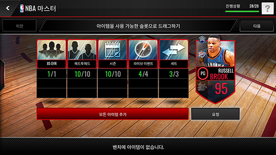 ÃÖ°íÀÇ ¶óÀξ÷À» À§ÇÑ ÃÖ°íÀÇ ¹æ¹ýÀº ÃÖ°íÀÇ ¼±¼ö¸¦ ¿µÀÔÇÏ´Â ±æÀÌ´Ù. ¸¶½ºÅÍ ¿þ½ºÆ®ºê·èÀ» Æ÷ÇÔÇÑ ¶óÀξ÷ º°(½º¸ôº¼, Åõ¿þÀÌ, ºò¸Ç, µðÆæ½Ãºê, ½´ÆÃ) ¸¶½ºÅÍ ¼±¼öµéÀº ¸ðµç À¯Àú°¡ ¿øÇÏ´Â ¼±¼öÀÌ´Ù. ÀÌ·¯ÇÑ ¼±¼ö¸¦ ¿µÀÔÇϱâ À§Çؼ´Â ¶óÀ̺ê À̺¥Æ®, Çìµå Åõ Çìµå, ½ÃÁð, ¼¼Æ® µî¿¡ ÀÌ¿ëµÇ´Â Èñ±ÍÇÏ°í ´Ù¾çÇÑ ¼öÁýǰµéÀ» ²ÙÁØÈ÷ ¸ð¾Æ¾ß ÇÑ´Ù. ¸¹Àº ³ë·ÂÀÌ ÇÊ¿äÇÏÁö¸¸ ±×¸¸ÅÀÇ °¡Ä¡¸¦ °®´Â ¶Ù¾î³ ¼±¼ö·Î ÃÖ°íÀÇ ¶óÀξ÷À» ¿Ï¼ºÇÏ´Â ³¡ÆÇ¿ÕÀÌ µÉ °ÍÀÌ´Ù. ¸¶½ºÅÍ ¼±¼ö¿¡´Â ¡®NBA ¶óÀÌºê ¸ð¹ÙÀÏ¡¯ÀÇ Ç¥Áö¸ðµ¨ÀÎ ¿þ½ºÆ®ºê·è(ºò¸Ç)À» Æ÷ÇÔÇØ, µå·¹ÀÌ¸Õµå ±×¸°(½º¸ôº¼), ÇÏ»ê ÈÀÌÆ®»çÀ̵å(µðÆæ½Ãºê), Á¦ÀÓ½º Çϵç(½´ÆÃ), Å©¸®½º Æú(Åõ¿þÀÌ)ÀÌ Æ÷ÁøµÇ¾î ÀÖ´Ù. °¢ Æ÷Áö¼ÇÀ» ´ëÇ¥ÇÏ¸ç ±×¿¡ ¾î¿ï¸®´Â ¶óÀξ÷À¸·Î ºÐ·ùµÈ ¼±¼öµéÀÌ´Ù. À̵éÀº 93 ÀÌ»óÀÇ ¸Å¿ì ³ôÀº Àüü ´É·ÂÄ¡¸¦ °¡Áö°í ÀÖ°í, ¶óÀξ÷ ¼±¼öµé¿¡°Ô Ãß°¡ ´É·ÂÄ¡¸¦ Áִ Ư¼ö´É·Â±îÁö ÀÖ´Ù. ±×Áß ¸¶½ºÅÍ ¿þ½ºÆ®ºê·èÀº ½ÇÁ¦·Îµµ ¿Ã ½ÃÁð Æò±Õ±â·Ï 31.6µæÁ¡ 10.7¸®¹Ù¿îµå 10.4¾î½Ã½ºÆ®·Î ¸ðµç ±â·ÏÀ» µÎ ÀÚ¸® ¼ö·Î ä¿ì¸ç ½ÃÁð Æ®¸®ÇôõºíÀ» ±â·ÏÇß°í, ´ÜÀÏ ½ÃÁð ÃÖ´Ù Æ®¸®Çôõºí 42°³·Î ½Å±â·ÏÀ» ¼ö¸³ÇÏ¸ç ±×ÀÇ º°¸íÀÎ ¡®The Beast¡¯Ã³·³ ±«¹° °°Àº ½ÃÁðÀ» º¸³½ NBA ³¡ÆÇ¿ÕÀ̶ó ÇÒ ¼ö ÀÖ´Ù. ÀÌ·¯ÇÑ ¸¶½ºÅÍ ¿þ½ºÆ®ºê·è(ÀÏ¸í ¡®¸¶ºê·è¡¯)Àº Ãß°¡ ´É·ÂÄ¡¸¦ Áִ Ư¼ö´É·Â»Ó¸¸ ¾Æ´Ï¶ó ¡®Å¬·¯Ä¡¡¯¶ó´Â ´É·ÂÀ» °®°í ÀÖ´Ù. Ŭ·¯Ä¡´Â ÇØ´ç ÄõÅÍ¿¡ ÀÏÁ¤ ½Ã°£ÀÌ µÇ¸é ¹ßµ¿Çϴµ¥, º¸Åë 3Á¡½¸ ¶óÀÎ ¿À¸¥ÂÊ 45µµ °¢µµ¿¡¼ »ç¿ëÇÒ ¼ö ÀÖ´Ù. À̶§ Á¤¸» ¿îÀÌ ³ª»Û ŸÀ̹ÖÀ¸·Î ½ÇÆÐÇÏ´Â °æ¿ì¸¦ Á¦¿ÜÇϰí´Â ¡®¹«Á¶°Ç¡¯ ½¸ÀÌ ¼º°øÇÏ´Â ¸¶¼ú °°Àº ±â¼úÀÌ´Ù. ±×·± ÀÌÀ¯·Î ÀÌ ±â¼úÀ» °¡Áø ¼±¼ö´Â ¸Å¿ì Àû´Ù. °æ±â ¸·ÆÇ Áß¿ä ½ÃÁ¡¿¡¼ 3Á¡ÀÌ º¸ÀåµÇ¸é ±²ÀåÈ÷ À¯¸®ÇÑ ÀÔÀå¿¡¼ °æ±â¸¦ ¿î¿µÇÒ ¼ö ÀÖ´Ù. ±×·¯ÇÑ °æ±â È帧Àº °ð ½Â¸®·Î À̾îÁø´Ù.