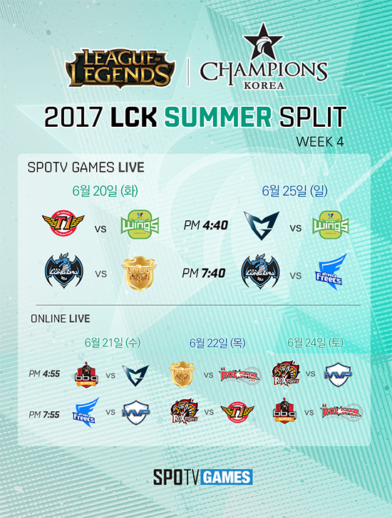 ½ºÆ÷Ƽºñ °ÔÀÓÁîÀÇ ¹æ¼Û Á¦ÀÛ ¹× »ç¾÷À» Àü´ãÇÏ´Â ¶ó¿ìµåÄ¿¹Â´ÏÄÉÀ̼ÇÁî´Â 20ÀÏ, ¶óÀ̾ù °ÔÀÓÁî¿Í Çѱ¹e½ºÆ÷Ã÷Çùȸ°¡ ÁÖÃÖÇϰí, ½ºÆ÷Ƽºñ °ÔÀÓÁî°¡ ÁÖ°ü ¹æ¼Û, Âü¿©ÇÏ´Â '2017 ¸®±× ¿Àºê ·¹Àüµå èÇǾ𽺠ÄÚ¸®¾Æ(ÀÌÇÏ 2017 LCK)¼¸Ó ½ºÇø´'ÀÇ 4ÁÖÂ÷ °æ±â¸¦ 20ÀÏ(È)°ú 25ÀÏ(ÀÏ) ¿ÀÈÄ 4½Ã 40ºÐºÎÅÍ ³Ø½¼ ¾Æ·¹³ª¿¡¼ »ýÁß°è·Î ÁøÇàÇÑ´Ù°í ¹àÇû´Ù. 20ÀÏ 16½Ã 40ºÐ¿¡ ÁøÇà ¿¹Á¤ÀÎ ¡®2017 LCK¡¯ ¼¸Ó ½ºÇø´¡¯ 4ÁÖÂ÷ 1°æ±â¿¡¼´Â Samsung GALAXY¿¡°Ô 1ÆÐ¸¦ ´çÇÑ µÚ ÄèÁ¶ÀÇ 5¿¬½ÂÀ» ´Þ¸®°í ÀÖ´Â SK telecom T1°ú ½Â°ÀüÀ» °æÇèÇÑ µÚ ¼¸Ó ½ºÇø´¿¡¼ ´Þ¶óÁø ¸ð½ÀÀ» º¸¿©ÁÖ°í ÀÖ´Â Jin Air Green Wings°¡ ´ë°áÀ» ÆîÄ¡°Ô µÈ´Ù. ¿¬½ÂÀ» ´Þ¸®¸ç 1À§ °æÀï¿¡ ¶Ù¾îµç SK telecom T1¿¡ ¸Â¼ Jin Air Green Wings°¡ ¾î¶² ¸ð½ÀÀ» º¸¿©ÁÙÁö ±â´ëµÈ´Ù. À̾îÁö´Â 19½Ã 40ºÐ °æ±â¿¡¼´Â ½ºÇÁ¸µ ½ºÇø´°ú´Â È®½ÇÇÏ°Ô ´Þ¶óÁø ¸ð½ÀÀ» º¸¿©ÁÖ°í ÀÖ´Â Longzhu Gaming°ú ÆÄ±«·Â ÀÖ´Â °æ±â·Î È·ÁÇÏ°Ô LCK¿¡ µ¥ºßÇßÁö¸¸ 4¿¬ÆÐÀÇ ´Ë¿¡ ºüÁö¸ç Ȥµ¶ÇÑ LCK µ¥ºß ½ºÇø´À» º¸³»°í ÀÖ´Â Ever 8 Winners°¡ ¸ÂºÙ°Ô µÈ´Ù. °·ÂÇÑ ±â¼¼·Î ¼¸Ó ½ºÇø´À» ¼øÇ×Çϰí ÀÖ´Â Longzhu GamingÀ» »ó´ë·Î ÇÏÀ§±Ç¿¡¼ Å»ÃâÇØ¾ß ÇÏ´Â Ever 8 Winners°¡ ½Â¸®¸¦ °ÅµÎ°í ºÐÀ§±â ¹ÝÀü¿¡ ¼º°øÇÏ°Ô µÉÁö À̸ñÀÌ ÁýÁߵȴÙ. ¿À´Â 25ÀÏ ÁøÇàµÇ´Â 16½Ã 40ºÐ °æ±â¿¡¼´Â »óÀ§±Ç¿¡¼ °æÀï ÁßÀÎ Samsung GALAXY¿Í Jin Air Green Wings°¡ ´ë°áÀ» ÆîÄ¡°Ô µÈ´Ù. Áö³ Ever 8 Winners¿ÍÀÇ °æ±â¿¡¼ ºÒ¸®ÇÔÀ» µÚÁý¾î³»´Â ±Ù¼º°ú ±â·®À» º¸¿©ÁØ Samsung GALAXY¿Í »óÀ§±Ç ÆÀ°úÀÇ ¿¬ÀüÀ̶ó´Â Çè³ÇÑ ÀÏÁ¤À» ¸¶ÁÖÇÏ°Ô µÈ Jin Air Green Wings. À̹ø ¼¸Ó ½ºÇø´¿¡¼ ÃÖ°íÀÇ ±â¼¼¸¦ º¸¿©ÁÖ°í ÀÖ´Â ¾ç ÆÀÀÇ ´ë°á¿¡ ÆÒµéÀÇ °ü½ÉÀÌ ¶ß°Ì´Ù. À̾îÁö´Â 19½Ã 40ºÐ °æ±â¿¡¼´Â ÁßÀ§±Ç ½Î¿òÀÇ ÆÇµµ¸¦ °¡¸¦ ¼ö ÀÖ´Â Longzhu Gaming°ú Afreeca FreecsÀÇ ´ë°áÀÌ ÆîÃÄÁø´Ù. Afreeca Freecs´Â 3°À̶ó ºÒ¸®´Â ÆÀµé°úÀÇ °æ±â´Â ÆÐÇßÁö¸¸ ±× ¿ÜÀÇ ÆÀµé¿¡°Ô´Â ½Â¸®¸¦ °ÅµÐ ¹Ù ÀÖÀ¸¸ç, Longzhu GamingÀº ¼Ö·Î ·©Å©¿¡¼ ÁÁÀº ±â·®À» º¸¿©ÁÖ°í ÀÖ´Â ¼±¼öµéÀÇ °í°øÇàÁøÀÌ ¾îµð±îÁö À̾îÁúÁö ÆÒµéÀÇ ±â´ë¸¦ ÇÑ ¸ö¿¡ ¹Þ°í ÀÖ´Ù. À̹ø °æ±â¿¡¼ ¾î¶² ÆÀÀÌ ½Â¸®¸¦ °ÅµÎ°í »óÀ§±Ç µµ¾àÀÇ ¹ßÆÇÀ» ¸¶·ÃÇÏ°Ô µÉÁö ±â´ëµÈ´Ù. '2017 LCK' ¼¸Ó ½ºÇø´ÀÇ 4ÁÖÂ÷ ½ºÆ÷Ƽºñ °ÔÀÓÁî ÁÖ°ü °æ±â´Â 20ÀÏ(È)°ú 25ÀÏ(ÀÏ) 17½Ã¿Í 20½Ã, ¼¿ï ¼Ãʱ¸¿¡ À§Ä¡ÇÑ ³Ø½¼ ¾Æ·¹³ª¿¡¼ ÁøÇàµÉ ¿¹Á¤À̸ç, ÇöÀå °ü¶÷À» Èñ¸ÁÇÏ´Â °æ¿ì ƼÄϸµÅ© ¿¹¸Åó(http://www.ticketlink.co.kr)¸¦ ÅëÇØ Àå´ç 4õ ¿ø(°ñµå¼®)°ú 2õ ¿ø(½Ç¹ö¼®), 1õ ¿ø(ºê·ÐÁî¼®)À¸·Î ¿¹¸Å°¡ °¡´ÉÇÏ´Ù. '2017 LCK' ¼¸Ó ½ºÇø´ÀÇ ½ºÆ÷Ƽºñ °ÔÀÓÁî ÁÖ°ü °æ±â(È¿äÀÏ, ÀÏ¿äÀÏ)´Â °ÔÀÓÀü¹® ä³Î ½ºÆ÷Ƽºñ °ÔÀÓÁîÀÇ IPTV¿Í ÄÉÀ̺íTV, ³×À̹ö(http://sports.news.naver.com/esports/index.nhn), ¾ÆÇÁ¸®Ä«TV(http://play.afreecatv.com/aflol02), īī¿ÀTV¿Í tvÆÌ(http://tvpot.daum.net/pot/spotvgames)À» ÅëÇØ¼ »ýÁß°è·Î ½ÃûÇÒ ¼ö ÀÖÀ¸¸ç, °æ±â Áß°è¿Í °ü·ÃÇÑ º¸´Ù ÀÚ¼¼ÇÑ »çÇ×Àº eSportsTV ȨÆäÀÌÁö(http://www.e-sportstv.net)¿Í SPOTV GAMES °ø½Ä SNS (ÆäÀ̽ººÏ – http://www.facebook.com/spotvgames, Æ®À§ÅÍ - https://twitter.com/spotv_games)¸¦ ÅëÇØ È®ÀÎÇÒ ¼ö ÀÖ´Ù. ÇÑÆí, Ÿ °æ±âÀå¿¡¼ ÁøÇàµÇ´Â °æ±â(¼ö¿äÀÏ, ¸ñ¿äÀÏ, Åä¿äÀÏ) ¿ª½Ã ¿Â¶óÀÎ Ç÷§Æû(³×À̹ö, ¾ÆÇÁ¸®Ä«TV, īī¿ÀTV, tvÆÌ)ÀÇ ½ºÆ÷Ƽºñ °ÔÀÓÁî ä³ÎÀ» ÅëÇØ »ýÁß°è·Î ½ÃûÀÌ °¡´ÉÇϸç, IPTV¿Í ÄÉÀ̺íTV¸¦ ÅëÇØ¼´Â ÀÍÀÏ ³ìÈÁ߰踦 ÅëÇØ ½ÃûÀÌ °¡´ÉÇÏ´Ù.