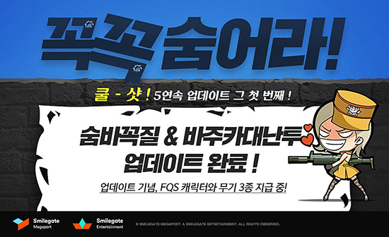 ½º¸¶ÀϰÔÀÌÆ® ¸Þ°¡Æ÷Æ®´Â Àڻ簡 ¼ºñ½ºÇϰí ÀÖ´Â ¸ð¹ÙÀÏ FPS ´ëÀÛ ¡®Åº: ³¡¾ø´Â ÀüÀå(ÀÌÇÏ Åº)¡¯¿¡ ¿©¸§ ¸ÂÀÌ Ä𠼦 5¿¬¼Ó ¾÷µ¥ÀÌÆ®ÀÇ Ã¹¹øÂ° Å׸¶ÀÎ ¡®²À²À ¼û¾î¶ó¡¯¸¦ Ãß°¡Çß°í 27ÀÏ(È) ¹àÇû´Ù. À̹ø ¾÷µ¥ÀÌÆ®·Î ¡®²À²À ¼û¾î¶ó¡¯ Å׸¶¿¡ °É¸Â´Â ½Å±Ô °ÔÀÓ¸ðµå ¡®¼û¹Ù²ÀÁú¡¯ÀÌ Ãß°¡µÆ´Ù. ¼û¹Ù²ÀÁúÀº À¯Àú°¡ ÀÚ½ÅÀÌ Á¶Á¾Çϴ ij¸¯Å͸¦ °ÔÀÓ ³» »ç¹°·Î ¹Ù²ã ¼ûÀ¸¸é, »ó´ë À¯ÀúµéÀÌ À̸¦ ã¾Æ³»´Â ¹æ½ÄÀÌ´Ù. ¿¹»óÄ¡ ¸øÇÑ ¹æ½ÄÀ¸·Î ¼û±âµµ, ã±âµµ ÇÒ ¼ö ÀÖ¾î À¯Àúµé°£ÀÇ ½É¸®ÀüÀÌ Ä¡¿ÇÏ°Ô Àü°³µÉ Àü¸ÁÀÌ´Ù. ¶ÇÇÑ, ´ë³Åõ ¸ðµå¿¡ ¹ÙÁÖÄ«Æ÷¸¦ µé°í ÀüÅõ¸¦ Ä¡¸¦ ¼ö ÀÖ´Â ¡®¹ÙÁÖÄ« ´ë³Åõ¡¯µµ »õ·Î Ãß°¡µÆ´Ù. ¹ÙÁÖÄ« ´ë³Åõ´Â ȲöÇÑ È·ÂÀüÀ» ÆîÄ¥ ¼ö ÀÖ¾î ¹«´õÀ§ÀÇ ½ºÆ®·¹½º¸¦ ´Ü¹ø¿¡ ³¯·Á¹ö¸± ¼ö ÀÖÀ» °ÍÀ¸·Î ¿¹»óµÈ´Ù. ÀÌ ¿Ü¿¡µµ ÀÏ¹Ý ¸ÅÄ¡¿¡ »ç¿ëµÉ ¼ö ÀÖ´Â ½Å±Ô ¸Ê 3Á¾ÀÌ Ãß°¡µÆ´Ù. ¶Ç ´Ù¾çÇÑ ½Å±Ô ¾ÆÀÌÅÛÀ» ȹµæÇÒ ¼ö ÀÖ´Â ¡®Á¦¿Õ»óÀÚ¡¯¿Í ½Å±Ô ¿©¼º ij¸¯ÅÍÀÎ PRS, ¹«±â ¾Ç¼¼¼¸®ÀÎ ¡®Á¦Ãµ´ë¼º¡¯ ½Ã¸®Áîµµ »õ·Î ¼±º¸¿©Á³´Ù. ½º¸¶ÀϰÔÀÌÆ®´Â Ä𠼦 5¿¬¼Ó ¾÷µ¥ÀÌÆ®¿Í ¼û¹Ù²ÀÁú ¸ðµå Ãß°¡¸¦ ±â³äÇØ ´Ù¾çÇÑ À̺¥Æ®µµ ¸¶·ÃÇß´Ù. ¿ì¼± ³»´Þ 20ÀϱîÁö À¯Àú°¡ °ÔÀÓ¿¡ Á¢¼Ó¸¸ ÇØµµ Æø½º ij¸¯Å͸¦ Æ÷ÇÔÇØ ¿µ¿õ¹«±â¸¦ ºñ·ÔÇØ °¢Á¾ µî±ÞÀÇ ¹«±â 3Á¾À» Á¦°øÇÑ´Ù. ¶ÇÇÑ ¼û¹Ù²ÀÁú ¸ðµå¸¦ Ç÷¹ÀÌÇÑ È½¼ö(ÃÑ 30ȸ)¿¡ µû¶ó ij½Ã¿Í °¢Á¾ ¾ÆÀÌÅÛÀ» Â÷µîÀûÀ¸·Î Áö±ÞÇÑ´Ù. ¸¶Áö¸·À¸·Î ½Å±Ô À¯ÀúµéÀ» À§Çؼ M4A1-Ultimate-Gold(3ÀÏ), AWM-A-Gold(3ÀÏ) µîÀÇ ¾ÆÀÌÅÛµµ ¸¶·ÃÇØµ×´Ù. ½º¸¶ÀϰÔÀÌÆ® ¸Þ°¡Æ÷Æ® ¿ìÀº¼º ÆÀÀåÀº ¡°À̹ø ¾÷µ¥ÀÌÆ®·Î ¼±º¸ÀÌ´Â ¼û¹Ù²ÀÁú°ú ¹ÙÁÖÄ« ´ë³Åõ´Â źÀÇ ´Ù¾çÇÑ Àç¹Ì Áß¿¡¼µµ µÎµå·¯Áö´Â °ÔÀÓ ¸ðµå¡±¶ó¸ç ¡°ÅºÀÇ ºòÀç¹Ì¸¦ ´À³¥ ¼ö ÀÖ´Â ¸¸Å ¸¹Àº À¯ÀúµéÀÌ µµÀüÇØ ÁÖ½Ã±æ ºÎŹ µå¸°´Ù¡±°í ¸»Çß´Ù. À̹ø ¾÷µ¥ÀÌÆ®¿Í °ÔÀÓÀÇ ¼¼ºÎÁ¤º¸¿¡ ´ëÇÑ º¸´Ù ÀÚ¼¼ÇÑ ³»¿ëÀº °ø½Ä Ä¿¹Â´ÏƼ(http://www.onstove.com/pages/TAHN/)¿¡¼ È®ÀÎÇÒ ¼ö ÀÖ´Ù.