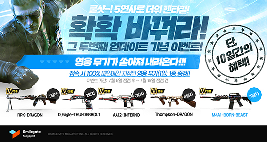 ½º¸¶ÀϰÔÀÌÆ®´Â ¿À´Â 19ÀϱîÁö À¯ÀúµéÀÌ Á¢¼ÓÇÒ ¶§ ¸¶´Ù ¿µ¿õ ¹«±â¸¦ Ãâ¼® º¸»óÀ¸·Î ¸ÅÀÏ Áö±ÞÇϰí ÀÖÀ¸¸ç, M4A1-BORN BEAS, M4A1-S BEAST µî ´Ù¾çÇÑ Àα⠿µ¿õ ¹«±â¸¦ 1°³¾¿ µ¹¾Æ°¡¸ç 1ÀÏ ±â°£Á¦·Î Áö±ÞÇÑ´Ù.