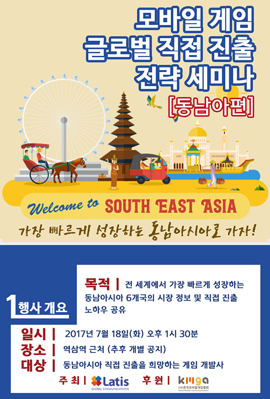 ¶óƼ½º´Â Àü ¼¼°è¿¡¼­ °¡Àå ºü¸¥ ¼Óµµ·Î ¼ºÀåÇϰí ÀÖ´Â ¸ð¹ÙÀÏ ½ÃÀåÀÎ µ¿³²¾Æ½Ã¾Æ 6°³±¹ÀÇ ½ÃÀå Á¤º¸¿Í Á÷Á¢ ÁøÃâ ³ëÇϿ츦 °øÀ¯ÇÏ´Â ½Ã°£À» ¸¶·ÃÇÑ´Ù. µ¿³²¾Æ½Ã¾Æ Á÷Á¢ ÁøÃâÀ» Èñ¸ÁÇÏ´Â °ÔÀÓ °³¹ß»ç¶ó¸é ´©±¸³ª Âü¿© °¡´ÉÇÑ Çà»ç·Î ±¹³» °ÔÀÓ¾÷°èÀÇ ÇØ¿Ü ÁøÃâ¿¡ Ȱ·Î¸¦ ¿­¾îÁÙ ±ÍÁßÇÑ ÀÚ¸®°¡ µÉ ¿¹Á¤ÀÌ´Ù.