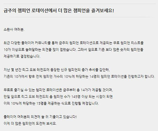 ¡®¸®±× ¿Àºê ·¹Àüµå(ÀÌÇÏ LoL)¡¯ÀÇ °³¹ß ¹× À¯Åë»ç ¶óÀ̾ù °ÔÀÓÁî°¡ ¿À´ÃºÎÅÍ ¸ÅÁÖ ¹«·á·Î Á¦°øµÇ´Â ¡®¸®±× ¿Àºê ·¹Àüµå(ÀÌÇÏ LoL)¡¯ èÇǾð ·ÎÅ×À̼ÇÀ» ±âÁ¸ 10°³¿¡¼ 14°³·Î ´Ã·È´Ù°í ¹àÇû´Ù. ´ëÇ¥ÀûÀÎ MOBA(Multiplayer Online Battle Arena) °ÔÀÓÀÎ LoLÀº 2009³â ù Ãâ½Ã ÀÌÈÄ·Î ²ÙÁØÈ÷ èÇǾðÀÌ Ãß°¡µÇ¸é¼ ÇöÀç ÃÑ Ã¨ÇǾðÀÇ ¼ö°¡ 140¿© °³¿¡ ´ÞÇÑ´Ù. ÀÌ·¸µí ´Ù¾çÇÑ Ã¨ÇǾ𠼱ÅÃÀÇ Æø ¼Ó¿¡¼ Ç÷¹À̾îµéÀÌ º¸À¯ÇÏÁö ¸øÇÑ Ã¨ÇǾðÀ» ½ÃµµÇØ º¼ ±âȸ¸¦ Á¦°øÇϰí, Àͼ÷ÇÏÁö ¾ÊÀº èÇǾðÀ» ¾Æ±º ¶Ç´Â Àû±ºÀ¸·Î »ó´ëÇÏ´Â ¹æ¹ýÀ» ¹è¿ï ¼ö ÀÖ°Ô Çϱâ À§ÇØ ¸¶·ÃµÈ Á¦µµ°¡ ¸ÅÁÖ ´Ù¾çÇÑ Ã¨ÇǾðÀ» ¹«·á·Î °æÇèÇÒ ¼ö ÀÖ°Ô Çϴ èÇǾð ·ÎÅ×À̼ÇÀÌ´Ù. ¹«¾ùº¸´Ù ´«±æÀ» ²ô´Â °ÍÀº ±âÁ¸ 10°³ÀÇ Ã¨ÇǾðÀ» ÁÖ¸¶´Ù ¹«·á·Î ·ÎÅ×ÀÌ¼Ç Á¦°øÇÏ´ø °Í¿¡¼ 14°³±îÁö ´Ã¸° ¶óÀ̾ù °ÔÀÓÁî Ãø °áÁ¤ÀÇ ÀÌÀ¯´Ù. Áö¼ÓÀûÀÎ ¾÷µ¥ÀÌÆ®¸¦ ÅëÇØ °¥¼ö·Ï ´Ùä·Î¿öÁö°í ÀÖ´Â LoL èÇǾð°ú °ü·ÃÇØ Ç÷¹À̾îµéÀÇ Áö¼ÓÀûÀ¸·Î Å« °ü½É°ú ¹Ù¶÷ÀÇ ¸ñ¼Ò¸®°¡ ÀÖ¾ú±â¿¡ ÀÌ¿Í °°ÀÌ º¯ÈÇÏ°Ô µÆ´Ù´Â °Í. ¶Ç ±ÝÀϺÎÅÍ º¯ÈµÈ ¹«·á ·ÎÅ×ÀÌ¼Ç Ã¨ÇǾðÀÇ ¼ýÀÚ ¶ÇÇÑ ÃÑ Ã¨ÇǾð ¼ýÀÚÀÇ 10%¸¦ ±âÁØÇÑ °ÍÀÎ ¹Ù, ÇâÈÄ¿¡µµ ½Å±Ô èÇǾðÀÌ Áö¼ÓÀûÀ¸·Î LoL ÀüÀå¿¡ ÇÕ·ùÇÏ¿© ÃÑ Ã¨ÇǾð¼ö°¡ 145°³ ÀÌ»ó µÇ´Â ½ÃÁ¡¿¡´Â ¹«·á ·ÎÅ×ÀÌ¼Ç Ã¨ÇǾðÀ» 15°³±îÁö Á¦°øÇÒ °ÍÀÌ¶ó µ¡ºÙ¿´´Ù. ÇÑÆí LoL èÇǾð ·ÎÅ×À̼ÇÀÌ Áõ°¡µÇ´Â °Í ¿Ü¿¡ ·é ¹× Ư¼º ½Ã½ºÅÛµµ °³ÆíÀ» ¾ÕµÎ°í ÀÖ´Ù. °ÔÀÓÀ» ÁøÇàÇÏ¸é¼ ¾ò´Â Á¡¼öÀÎ IP¸¦ ÀÌ¿ëÇØ¼ ±¸¸ÅÇØ¾ß Çß´ø ·éÀÌ ¹«·á·Î Á¦°øµÉ ¿¹Á¤À̸ç, ·é ¹× Ư¼º ü°è°¡ ´õ¿í °£¼ÒÈµÇ¾î ½Å±Ô Ç÷¹À̾îµéµµ ½±°Ô Á÷°üÀûÀ¸·Î ÀÌÇØÇÒ ¼ö ÀÖÀ» °ÍÀ¸·Î ±â´ëµÇ´Â µî ½Å±Ô ¹× ±âÁ¸ Ç÷¹ÀÌ¾î ¸ðµÎ¸¦ ¹è·ÁÇÏ´Â ¶óÀ̾ù °ÔÀÓÁîÀÇ Çຸ°¡ À̾îÁ®°¡°í ÀÖ´Ù.