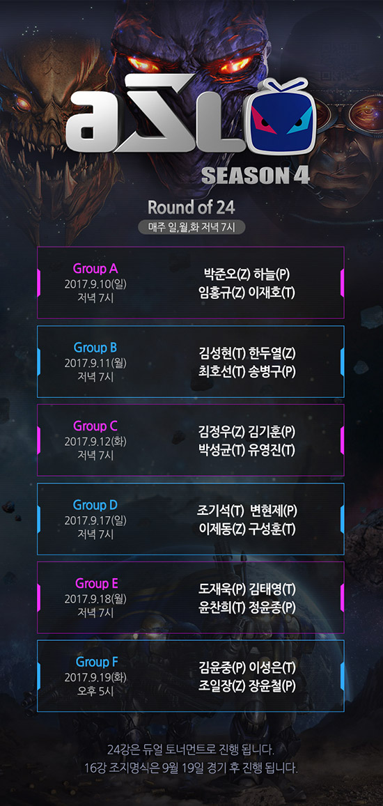 ÃÑ»ó±Ý 1¾ï¿øÀ» ÇâÇÑ ´ë°áÀÇ Ã¹ ¸·ÀÌ ¿À¸¥´Ù. ù °ü¹®ÀÎ 24°ºÎÅÍ ¡®¾ËÆÄ°í¡¯ ±è¼ºÇö, ¡®ÃÑ»ç·É°ü¡¯ ¼Ûº´±¸, ¡®ºÒ»çÁ¶¡¯ ±èÁ¤¿ì µî ÀïÀïÇÑ ¼±¼öµéÀÌ ÃâÀüÇÑ´Ù. ¾ÆÇÁ¸®Ä«TV´Â ¿À´Â 9¿ù 10ÀÏ(ÀÏ)ºÎÅÍ ¼¿ï ´ëÄ¡µ¿ ÇÁ¸¯¾÷ ½ºÆ©µð¿À¿¡¼ ¡®¾ÆÇÁ¸®Ä«TV ½ºÅ¸¸®±× ½ÃÁð4(ÀÌÇÏ ASL ½ÃÁð4)¡¯ 24° 1ÁÖÂ÷ °æ±â¸¦ ÁøÇàÇÑ´Ù°í 8ÀÏ ¹àÇû´Ù. ASL ½ÃÁð4´Â Àü¼¼°è¿¡¼ ÃÖÃÊ·Î ½ºÅ¸Å©·¡ÇÁÆ®: ¸®¸¶½ºÅÍ·Î ÁøÇàµÇ´Â ù ½ÃÁðÀÎ ¸¸Å ±× ¾î´À ¶§ º¸´Ù È·ÁÇÑ ´ëÁøÀ¸·Î ÆÒµé°ú ¸¸³´Ù. 10ÀÏ(ÀÏ) ¿ÀÈÄ 7½ÃºÎÅÍ ½ÃÀÛÇÏ´Â 24° °³¸·ÀüºÎÅÍ ¿ª´ë±Þ ¸ÅÄ¡°¡ ÆîÃÄÁø´Ù. AÁ¶¿¡¼´Â ¹ÚÁØ¿À(Baxter), ÇÏ´Ã(Sky), ÀÓÈ«±Ô(Larva), ÀÌÀçÈ£(Light)°¡ ÃâÀüÇØ 16° ÁøÃâÀ» ÇâÇÑ µµÀü¿¡ ³ª¼±´Ù. À̾î 11ÀÏ(¿ù) ¿ÀÈÄ 7½ÃºÎÅÍ ¿¸®´Â BÁ¶¿¡´Â ±è¼ºÇö(Last), Çѵο(Where), ÃÖÈ£¼±(sSak), ¼Ûº´±¸(Stork)ÀÌ, 12ÀÏ(È) ¿ÀÈÄ 7½ÃºÎÅÍ ¿¸®´Â CÁ¶¿¡´Â ±èÁ¤¿ì(effort), ±è±âÈÆ(Lazy), ¹Ú¼º±Õ(Mind), À¯¿µÁø(Rush)ÀÌ 16°Çà Æ¼ÄÏÀ» À§ÇÑ Ç÷Àü¿¡ ³ª¼±´Ù. ¿°º¸¼ºÀº ¿î¿µ Á¤Ã¥ À§¹ÝÀ¸·Î ÀÌ¿ë Á¤Áö Á¶Ä¡¸¦ ¹Þ¾Æ ´ëȸ¿¡ Âü°¡ÇÒ ¼ö ¾ø°Ô µÆ´Ù. ´ë½Å ¼¿ï ¿¹¼± 2Á¶ ÁØ¿ì½ÂÀÚ ¹ÚÁØ¿À°¡ AÁ¶¿¡ ÇÕ·ùÇß´Ù. ASL ½ÃÁð4ÀÇ 24°ÀüÀº 6°³Á¶·Î ³ª´µ¾î 4ÀÎ 1Á¶ µà¾ó Åä³Ê¸ÕÆ®·Î ÁøÇàµÇ¸ç °¢ Á¶¿¡¼´Â 2¸í¾¿ 16° ÁøÃâÀÚ°¡ ³ª¿Â´Ù. 24°À¸·Î 16°¿¡ ÁøÃâÇÒ 12¸í°ú ½ÃµåÀÚÀÎ ÀÌ¿µÈ£(Flash), ÀÌ¿µÇÑ(Shine), ±èÅÿë(Bisu), ±è¹Îö(Soulkey)ÀÌ ÇÕ·ùÇÏ¿© º»¼± 16°ÀüÀÌ ÆîÃÄÁø´Ù. ƯÈ÷ À̹ø ½ÃÁð¿¡´Â »õ·Î¿î ¸ÊÀÌ Ãß°¡µÈ´Ù. ¸ÕÀú ¼Å¶ºê·¹ÀÌÄ¿, ºí·ç½ºÅè, ¾Æ¿ô»çÀÌ´õSE µî ¼ÓĪ 'Àß ³ª°¡´Â' ¸Ê Á¦ÀÛÀÚÀÎ ±èÀÀ¼°¡ Á¦ÀÛÇÑ ½Å ¸Ê '°ñµå·¯½Ã'¿Í ASL ¸Ê °ø¸ðÀüÀÇ 1À§ ÀÛǰÀÎ 'Å©·Î½ÌÇʵå'°¡ »ç¿ëµÈ´Ù. ¿À´Â 10ÀϺÎÅÍ ¿¸®´Â ASL ½ÃÁð4¿¡ ÇöÀå °ü¶÷°´ Áß Ãß÷À» ÅëÇØ ¡®ASL ¸¶¿ì½ºÆÐµå¡¯¿Í ¡®½ºÅ¸Å©·¡ÇÁÆ® ¸®¸¶½ºÅÍ ¹îÁö¡¯¸¦ Á¦°øÇϸç, ¾ÆÇÁ¸®Ä«TV °ÔÀÓ&e½ºÆ÷Ã÷ ÆäÀ̽ººÏ(https://www.facebook.com/afreecatvgame)¿¡¼µµ ´Ù¾çÇÑ À̺¥Æ®¸¦ ÁøÇàµÈ´Ù. ASL ½ÃÁð4 24°Àº ¿À´Â 10ÀÏ(ÀÏ) °³¸·ÀüÀ» ½ÃÀÛÀ¸·Î 19ÀÏ(È)±îÁö ¸ÅÁÖ ÀÏ, ¿ù, È¿äÀÏ ¿ÀÈÄ 7½Ã ¼¿ï ´ëÄ¡µ¿ ¾ÆÇÁ¸®Ä«TV ÇÁ¸¯¾÷ ½ºÆ©µð¿À¿¡¼ »ýÁß°èµÈ´Ù. ¶ÇÇÑ ¿À´Â 19ÀÏ ¸¶Áö¸· 24° °æ±â°¡ ³¡³ µÚ, 16° Á¶Áö¸í½ÄÀÌ ¿¬´Þ¾Æ ¿¸°´Ù. º¸´Ù ÀÚ¼¼ÇÑ »çÇ×Àº ASL °ø½Ä ȨÆäÀÌÁö(http://afreecatv.com/afstar1)¿¡¼ È®ÀÎÇÒ ¼ö ÀÖ´Ù.