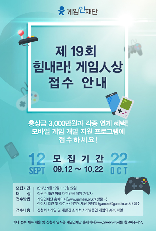 Çѹα¹ °ÔÀÓ »ê¾÷ ¹ßÀüÀ» À§ÇØ ÈûÀ» º¸Å¿ °³¹ß»ç Áö¿ø ÇÁ·Î±×·¥ÀÌ´Ù. À̹ø 19ȸ 'Èû³»¶ó! °ÔÀÓìÑ»ó'Àº 9¿ù 12ÀϺÎÅÍ 10¿ù 22ÀϱîÁö 40¿©Àϰ£ Á¢¼öÇϸç, ½É»ç¸¦ °ÅÃÄ 11¿ù Áß ÃÖÁ¾ ¼ö»óÀÛÀ» ¼ö¿©ÇÑ´Ù. Âü°¡ ÀÚ°ÝÀº 50ÀÎ ÀÌÇÏ·Î ±¸¼ºµÈ ´ëÇѹα¹ °ÔÀÓ °³¹ß»çÀ̸ç, ±¹³» ÆÛºí¸®½Ì °è¾àÀÌ µÇ¾î ÀÖÁö ¾ÊÀº °ÔÀÓ À̾î¾ß ÇÑ´Ù. Âü°¡ ¹æ¹ýÀº ½º¸¶Æ®Æù¿¡¼ Å×½ºÆ® ÇÒ ¼ö ÀÖ´Â ºôµåÀÇ °ÔÀÓÀ» Âü°¡ ½Åû¼, °ÔÀÓ ¹× °³¹ß»ç ¼Ò°³¼¿Í ÇÔ²² °ÔÀÓÀÎÀç´Ü °ø½Ä À̸ÞÀÏ( gamein@gamein.or.kr )À» ÅëÇØ Á¢¼öÇÏ¸é µÈ´Ù. ´ë»óÀÛ¿¡´Â »ó±Ý 2õ¸¸¿ø°ú °ÔÀÓ °³¹ß ¹× Ãâ½Ã¸¦ À§ÇÑ ±â¼ú ¹× °í°´ Áö¿ø, ¹ý¹« ¹× À繫 »ó´ã, È«º¸ Ȱµ¿ Áö¿ø µî ´Ù¾çÇÑ ÇýÅÃÀÌ Á¦°ø µÇ¸ç, ´ë»ó Èĺ¸ÀÛÀΠž¸®½ºÆ® ¼±Á¤ÀÛµé ¿ª½Ã °¢ 200¸¸¿øÀÇ »ó±ÝÀÌ Áö¿ø µÈ´Ù. À̿ܿ¡µµ °ÔÀÓ °³¹ß»ç¸¦ ÀÀ¿øÇϱâ À§ÇØ ¡®Èû³»¶ó¸é¡¯ ÇÁ·ÎÁ§Æ®¸¦ ¸¶·ÃÇØ ž¸®½ºÆ® ¼±Á¤»ç ¹× Âü°¡»ç µéÀ» ´ë»óÀ¸·Î Áï¼® ¶ó¸éÁ¶¸®±â ¼¼Æ® ÀÏü ȤÀº ÄŶó¸é µîÀ» ¼±»çÇϸç, À̿ܿ¡µµ ±Û·Î¹ú ½ÃÀå ÁøÃâ¿¡ ´ëÇÑ ³ôÀº °ü½ÉÀ» °í·ÁÇØ Ãß°¡ÀûÀÎ Áö¿ø ¹æ¾Èµµ Á¶¸¸°£ °ø°³µÉ ¿¹Á¤ÀÌ´Ù. Á¦ 19ȸ 'Èû³»¶ó! °ÔÀÓìÑ»ó'¿¡ ´ëÇÑ ÀÚ¼¼ÇÑ Á¢¼ö ¹æ¹ý ¾È³»¿Í ³»¿ëÀº °ÔÀÓÀÎÀç´Ü ȨÆäÀÌÁö( www.gamein.or.kr )¿Í °ø½Ä ÆäÀ̽ººÏ ÆäÀÌÁö( https://www.facebook.com/gamein.or.kr )¿¡¼ È®ÀÎÇÒ ¼ö ÀÖ´Ù.