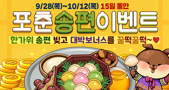 ¸ÕÀú µÎ °ÔÀÓÀº 28ÀϺÎÅÍ 10¿ù 12ÀϱîÁö ¸ÅÀÏ °ÔÀÓ¿¡¼­ ÁÖ¾îÁö´Â ¹Ì¼Ç 3°³¸¦ ¿Ï·áÇϸé, ¼ÛÆíÀç·á¿Í ÇÔ²² º¸³Ê½º¸¦ Áö±ÞÇÏ´Â ¡®Æ÷Ãá¼ÛÆí¡¯ À̺¥Æ®¸¦ ¿ÀÇÂÇÑ´Ù. ¼ÛÆí Àç·á´Â 5°³¸¦ ¸ð¾Æ ÇϳªÀÇ ¼ÛÆíÀ¸·Î ºúÀ¸¸é ´ë¹Ú º¸³Ê½º ¾ÆÀÌÅÛµµ Ãß°¡ ÁõÁ¤ÇÑ´Ù.