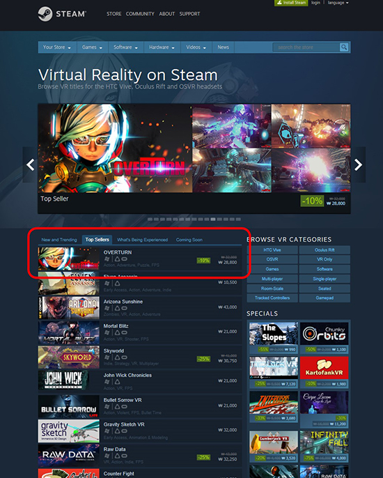¿ÍÀÌÁ¦ÀÌ¿¥°ÔÀÓÁî°¡ ÆÛºí¸®½ÌÇÑ(½ºÆ©µð¿ÀHG/¿øÀ̸ֽº °øµ¿°³¹ß) VR°ÔÀÓ ¡®¿À¹öÅÏ(Overturn)¡¯ÀÌ Ãâ½Ã Á÷ÈÄ ½ºÆÀ(Steam) VRÂ÷Æ® Åé ¼¿·¯(Top Seller) 1À§¸¦ ´Þ¼ºÇѵ¥ ÀÌ¾î ±¹³» VR°ÔÀÓ Áß ÃÖÃÊ·Î ¡®½ºÆÀVR ÄÝ·ºÅÍºí¡¯¿¡ ¼±Á¤µÆ´Ù. ¡®½ºÆÀVR ÄÝ·ºÅÍºí¡¯Àº ½ºÆÀÀÌ ¼±Á¤ÇÑ ¾çÁúÀÇ ÄÜÅÙÃ÷¸¦ À¯Àú°¡ ÀÏÁ¤½Ã°£ ÀÌ»ó Ç÷¹ÀÌ ÇÒ °æ¿ì, À¯Àú¸¸ÀÇ °¡»ó °ø°£¿¡ ÇØ´ç ÄÜÅÙÃ÷ÀÇ ÇÇ±Ô¾î µîÀ» ȹµæ ¹× ¼öÁýÇØ ³ª°¥ ¼ö ÀÖ´Â ¶Ç ÇϳªÀÇ Áñ±æ °Å¸®´Ù. ¿©±â¿¡´Â ÇöÀç±îÁö ¿À¹öÅÏÀ» Æ÷ÇÔÇÏ¿© ¡®·Î¿ì µ¥ÀÌÅÍ(Raw Data)¡¯, ¡®¾Æ¸®Á¶³ª ¼±»þÀÎ(Arizona Sunshine)¡¯, ¡®À⠽ùķ¹ÀÌÅÍ(Job Simulator)¡¯ µî°ú °°Àº ÈÁ¦ÀÇ °ÔÀÓµéÀÌ ¾à 30¿©°³ Á¤µµ ¼±Á¤ µÈ ¹Ù ÀÖ´Ù. ¿ÍÀÌÁ¦ÀÌ¿¥°ÔÀÓÁî °ü°èÀÚ´Â ¡°¿À¹öÅÏÀ» ½ÃÀÛÀ¸·Î Á¦2, Á¦3ÀÇ ¿À¹öÅϰú °°Àº ÈÁ¦ÀÛµéÀÌ ³ª¿Ã ¼ö ÀÖµµ·Ï °æÀï·Â ÀÖ´Â ÄÜÅÙÃ÷µéÀ» Áö¼ÓÀûÀ¸·Î ¹ß±¼, ÆÛºí¸®½ÌÇÏ¿© ±Û·Î¹ú¿¡¼ ±¹³» °ÔÀÓ °æÀï·ÂÀ» Á¦°íÇϵµ·Ï ÃÖ¼±À» ´ÙÇÒ ¿¹Á¤ÀÌ´Ù.¡±¶ó°í ¹àÇû´Ù. ÇÑÆí, ¡®¿À¹öÅÏ(Overturn)¡¯Àº ¡®HTC ¹ÙÀ̺ꡯ¿Í ¡®¿Àŧ·¯½º ¸®ÇÁÆ®¡¯¸¦ ÅëÇØ Ç÷¹ÀÌÇÒ ¼ö ÀÖÀ¸¸ç ½ºÆÀ°ú °°Àº ¿ÀÇ ¸¶ÄÏÀº ¹°·Ð, Àá½Ç»õ³»¿Í °Ç´ëÀÔ±¸¸¦ ºñ·ÔÇÑ ¿ÍÀÌÁ¦ÀÌ¿¥°ÔÀÓÁîÀÇ VR Ä«Æä¿¡¼µµ Áñ±æ ¼ö ÀÖ´Ù.