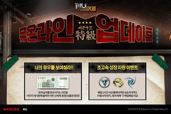 À¥Á¨ÀÇ ´ëÇ¥ PC MMORPG ¡®¹Â ¿Â¶óÀΡ¯ÀÌ ´ë±Ô¸ð ¾÷µ¥ÀÌÆ®¸¦ ¾ÕµÎ°í »çÀü À̺¥Æ®¸¦ ½ÃÀÛÇÑ´Ù. À¥Á¨Àº ¿À´Ã(10¿ù 24ÀÏ), ¡®¹Â ¿Â¶óÀΡ¯ÀÇ Æ¯º° À̺¥Æ®ÆäÀÌÁö(http://event.muonline.co.kr/season13/home/event)¸¦ ¿°í ¡®Season13¡¯ ¾÷µ¥ÀÌÆ®ÀÇ ³»¿ëÀ» °øÁöÇÏ´Â ÇÑÆí, »çÀü À̺¥Æ®¸¦ ½ÃÀÛÇß´Ù. ¸ÕÀú, À¥Á¨Àº À̹ø ¾÷µ¥ÀÌÆ®¸¦ °ÅÃÄ »õ·Î¿î ¼Ó¼º »ç³ÉÅÍÀÎ ¡®¾îµÒÀÇ ´Ë¡¯À» °ø°³ÇÑ´Ù. 800·¹º§ ÀÌ»óÀÇ Ä³¸¯ÅͺÎÅÍ ÀÔÀå °¡´ÉÇÑ ¡®¾îµÒÀÇ ´Ë¡¯Àº ºÒ, ¹Ù¶÷, ¹°, ¶¥ µîÀ¸·Î ±¸¼ºµÇ¾î ÀÖÀ¸¸ç, °¢ Áö¿ª¿¡ Ãâ¸ôÇÏ´Â ¡®½º¿úÇÁ¿£Æ®¡¯, ¡®¿ìµçºñ½ºÆ®¡¯ µîÀÇ ¸ó½ºÅ͸¦ »ç³ÉÇØ º¸¼®·ù ¹× ¿¢¼¿·±Æ® Àåºñ µîÀÇ ¾ÆÀÌÅÛÀ» ȹµæÇÒ ¼ö ÀÖ´Ù. À̿ܿ¡µµ À¥Á¨Àº ÇÑÃþ ´õ °·ÂÇØÁø ¡®¸¶½ºÅ͸® 4Â÷ ¹æ¾î±¸¡¯¸¦ °ø°³Çϰí, ¹Â ´ë·ú ÃÖ°ÀÇ ¹«±âÀÎ 'Ȧ¸®¿£Á© ¹«±â' ¾÷µ¥ÀÌÆ® µîÀ» ÁøÇàÇØ ȸ¿øµéÀÇ ¸¸Á·µµ¸¦ ³ôÀÏ °èȹÀÌ´Ù. ÀÌ¿Í ÇÔ²² À¥Á¨Àº ¿À´Ã(10¿ù 24ÀÏ)ºÎÅÍ 11¿ù 9ÀϱîÁö ´ë±Ô¸ð ¾÷µ¥ÀÌÆ®¸¦ ±â³äÇØ '³ÊÀÇ ¹Â¸¦ º¸¿©Áà!' À̺¥Æ®¸¦ ÁøÇàÇÑ´Ù. °ÔÀÓȸ¿øµéÀº '¹Â ¿Â¶óÀÎ' ȨÆäÀÌÁö ³» À̹ÌÁö °Ô½ÃÆÇ¿¡ 16³â µ¿¾È °ÔÀÓ¿¡ ´ëÇÑ ¿©·¯ Ãß¾ïÀÌ ´ã±ä »çÁøÀ̳ª, ÀÏ»ó ¼Ó¿¡¼ °ÔÀÓ ¶Ç´Â ij¸¯ÅÍÀÇ ³¯°³¸¦ ¿¬»ó½ÃŰ´Â »çÁøÀ» µî·ÏÇÏ¸é µÈ´Ù. À¥Á¨Àº »çÁøÀ» µî·ÏÇØ °¡Àå ¸¹Àº ÃßõÀ» ¹ÞÀº 100¸íÀÇ È¸¿øµé¿¡°Ô '½Å¼¼°è »óǰ±Ç 3¸¸¿ø'À» ¼±¹°ÇÑ´Ù. ¶Ç, ÇØ´ç À̺¥Æ®¿¡ Âü¿©ÇÑ È¸¿ø Àü¿ø¿¡°Ô´Â '»ó½ÂÀÇ ºÎÀû¥±(7ÀÏ)¡¯°ú ¡®°ø¼Ó ½ºÅ©·Ñ(7ÀÏ)¡¯À» Áö±ÞÇϰí, ´ñ±ÛÀ» ÀÛ¼ºÇÑ 10¸íÀ» ÃßÃ·ÇØ ¡®°ÔÀÓ Ä³½Ã 5¸¸¿ø¡¯À» Á¦°øÇÑ´Ù. ¶ÇÇÑ À¥Á¨Àº 10¿ù 31ÀϱîÁö '¹Â ¿Â¶óÀÎ'¿¡ 1½Ã°£ ÀÌ»ó Á¢¼ÓÇÒ °æ¿ì '»ó½ÂÀÇ ºÎÀû¥±(1ÀÏ)¡¯, ¡®¸¶¹ý»çÀÇ ¹ÝÁö(1ÀÏ)¡¯, ¡®[±Í¼Ó]ºûÀÇÃູ »ó±Þ(3°³)¡¯À¸·Î ±¸¼ºµÈ Ãʰí¼Ó ¼ºÀå ÆÐŰÁö ¾ÆÀÌÅÛÀ» Áö±ÞÇÑ´Ù. º¸»ó ¾ÆÀÌÅÛÀº À̺¥Æ® ±â°£µ¿¾È ÇÏ·ç¿¡ Çѹø °ø½Ä ȨÆäÀÌÁö¿¡¼ ¼ö·ÉÇÒ ¼ö ÀÖ´Ù. À¥Á¨ÀÇ ´ëÇ¥ PC MMORPG ¡®¹Â ¿Â¶óÀΡ¯ÀÇ ¡®½ÃÁð13 ¾÷µ¥ÀÌÆ®¡¯ ¹× ±â³ä À̺¥Æ®¿¡ ´ëÇÑ º¸´Ù ÀÚ¼¼ÇÑ Á¤º¸´Â °ø½Ä ȨÆäÀÌÁö(http://www.muonline.co.kr)¿¡¼ È®ÀÎÇÒ ¼ö ÀÖ´Ù.