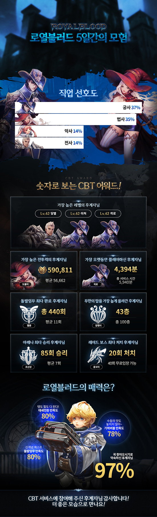 °ÔÀÓºôÀÌ ÀÚ»ç Ç÷¡±×½Ê ¡®·Î¿ºí·¯µå(Royal Blood)¡¯ÀÇ ±¹³» CBT ¼º°ú°¡ ´ã±ä ÀÎÆ÷±×·¡ÇÈÀ» 25ÀÏ, °ø°³Çß´Ù. °ÔÀÓºôÀÌ 2³â ³Ñ´Â ±â°£ µ¿¾È ¾ß½ÉÂ÷°Ô ÁغñÇÑ ±â´ëÀÛÀ¸·Î ½Çü°¡ óÀ½ °ø°³µÈ CBT¿´´ø ¸¸Å ¸¹Àº °ü½ÉÀ» ¹ÞÀ¸¸ç ¼ºÈ²¸®¿¡ Á¾·áµÇ¾ú´Ù. ƯÈ÷ CBT ±â°£ Áß ÀÚü ¼³¹® Á¶»ç¿¡¼µµ 97%¿¡ ÇØ´çÇÏ´Â À¯Àú°¡ Á¤½Ä Ãâ½Ã ÈÄ °ÔÀÓÀ» Ç÷¹ÀÌÇÏ°Ú´Ù°í ´äÇØ ´«±æÀ» ²ø¾ú´Ù. À̹ø Å×½ºÆ®¿¡´Â MMORPG·Î ´Þ±ÅÁø ±¹³» ½ÃÀåÀÇ ºÐÀ§±â¸¦ Áõ¸íÇÏµí ¸¹Àº À¯ÀúµéÀÌ Âü¿©ÇßÀ¸¸ç, ¿ì¼öÇÑ ±×·¡ÇȰú °ÔÀÓ¼º¿¡ È£ÆòÇÑ °ÍÀ¸·Î ¾Ë·ÁÁ³´Ù. °ÔÀÓºôÀº CBT ±â°£ Áß À¯ÀúµéÀÌ ´Þ¼ºÇÑ ÁÖ¿ä ¼º°ú¸¦ ´ãÀº ÀÎÆ÷±×·¡ÇÈÀ» ÅëÇØ À¯Àúµé°ú ¼ÒÅë¿¡ ³ª¼¹´Ù. À̹ø¿¡ °ø°³ÇÑ ÀÎÆ÷±×·¡ÇÈ¿¡ µû¸£¸é À¯ÀúµéÀÌ ¼±È£ÇÏ´Â Á÷¾÷Àº ±Ã»ç°¡ 37%·Î °¡Àå ³ô¾Ò°í ¹ý»ç°¡ 35%·Î ±× µÚ¸¦ À̾ú´Ù. 5ÀÏÀ̶ó´Â ªÀº ±â°£ Áß ÃÖ°í 62·¹º§±îÁö ´Þ¼ºÇÑ À¯Àú´Â ´Ð³×ÀÓ ¡®´éº°¡¯, ¡®¾ÆÃÄ¡¯, ¡®È÷·Î¡¯ 3¸íÀ¸·Î ³ªÅ¸³µ´Ù. °¡Àå ³ôÀº ÀüÅõ·ÂÀ» ´Þ¼ºÇÑ À¯Àú´Â ¡®µµÇÃÀÌ¡¯·Î 590,811¿¡ À̸£´Â ³ôÀº ÀüÅõ·ÂÀ» Áö´Ñ ij¸¯ÅÍ·Î ¼ºÀå½ÃÄ×´Ù. ƯÈ÷ ¡®·Î¿ºí·¯µå¡¯ÀÇ ÇÙ½É Â÷º°È ÄÜÅÙÃ÷ÀÎ µ¹¹ß ÀÓ¹«¸¦ °¡Àå ¸¹ÀÌ ¿Ï·áÇÑ À¯Àú´Â ¡®Çï·»¡¯À¸·Î ÃÑ 440ȸÀÇ µ¹¹ßÀÓ¹«¸¦ ¼öÇàÇß´Ù. À¯ÀúµéÀÇ Æò±Õ µ¹¹ßÀÓ¹« Âü¿© ¼ö°¡ 11ȸÀÎ °ÍÀ» °¨¾ÈÇÏ¸é ¾ÐµµÀûÀ¸·Î ³ôÀº ¼öÄ¡´Ù. À̿ܿ¡µµ ¡®¹«ÇÑÀÇ Å¾¡¯°ú ¡®¾Æ·¹³ª¡¯ µî ´Ù¾çÇÑ ¡®·Î¿ºí·¯µå¡¯ÀÇ ÄÜÅÙÃ÷¸¦ °¡Àå ¸¹ÀÌ Áñ±ä ´ëÇ¥ À¯ÀúµéÀ» ÀÎÆ÷±×·¡ÇÈÀ» ÅëÇØ ¼Ò°³Çß´Ù. ¡®·Î¿ºí·¯µå¡¯´Â °ÔÀÓºôÀÌ Ã¹ ¼±À» º¸ÀÌ´Â ¸ð¹ÙÀÏ MMORPG·Î 100¸í ÀÌ»óÀÇ ´ë±Ô¸ð °³¹ßÁø°ú ¿ª·®ÀÖ´Â ÇÙ½É ¸â¹öµéÀ» ÅõÀÔÇØ 2³â ³Ñ°Ô °³¹ßÇØ ¿Â ¾ß½ÉÀÛÀÌ´Ù. ±¹³»¸¦ ³Ñ¾î ¼¼°è ÃÖÃÊ·Î ¡®Àü ¼¼°è ½ÃÀå¿¡¼ ÅëÇÒ ¸ð¹ÙÀÏ MMORPG¡¯ ¹èÃâÀ» ¸ñÇ¥·Î Çϰí ÀÖÀ¸¸ç 'À¯³ªÀÌÆ® LA 2016', 'À¯³ªÀÌÆ® ¼¿ï 2017', ¡®À¯³ªÀÌÆ® À¯·´ 2017¡¯ µî ±¹³»¡¤¿Ü¿¡¼ ÁÙ°ð ÁÖ¸ñ¹Þ¾Æ ¿Â ¸ð¹ÙÀϰÔÀÓ ºí·Ï¹ö½ºÅÍ´Ù. ÀÌ °ÔÀÓÀº ´ë±Ô¸ð °³¹ß ÀηÂÀÌ ÅõÀÔµÈ °ÔÀÓ´ä°Ô ¸ð¹ÙÀÏ È¯°æ¿¡¼ ±¸Çö °¡´ÉÇÑ ÃÖ°í ¼öÁØÀÇ ±×·¡ÇÈÀ» ±â¹ÝÀ¸·Î ÇÑ ±¤È°ÇÑ ¿ÀÇ Çʵ带 ÀÚ¶ûÇÑ´Ù. Çѱ¹ ¸ð¹ÙÀÏ MMORPG ÃÖÃÊ·Î ¡®À̺¥Æ® µå¸®ºì ¹æ½Ä¡¯ÀÌ Àü¸é Àû¿ëµÈ ¡®µ¹¹ß ÀÓ¹«¡¯ ÄÜÅÙÃ÷¸¦ ÅëÇØ MMORPG º»¿¬ÀÇ Àç¹Ì¸¦ Á¦°øÇϸç, 100:100 ±Ô¸ðÀÇ ¡®RVR(Áø¿µÀü) ÀüÅõ¡¯, ¡®Å¼¼ Àüȯ ½Ã½ºÅÛ¡¯ µîÀ¸·Î °ÔÀÓ¼ºÀ» ±Ø´ëÈÇß´Ù. °ÔÀÓºôÀº À̹ø CBT À¯ÀúµéÀÇ ÀǰßÀ» Åä´ë·Î ¸·¹ÙÁö °³¹ß °úÁ¤¿¡ ¹Ý¿µ, ±â´ë¿¡ ºÎÀÀÇÏ´Â ¿Ï¼ºµµ ³ôÀº °ÔÀÓÀ¸·Î ¼±º¸ÀÏ ¼ö ÀÖµµ·Ï ¹ÚÂ÷¸¦ °¡ÇÒ °èȹÀÌ´Ù.