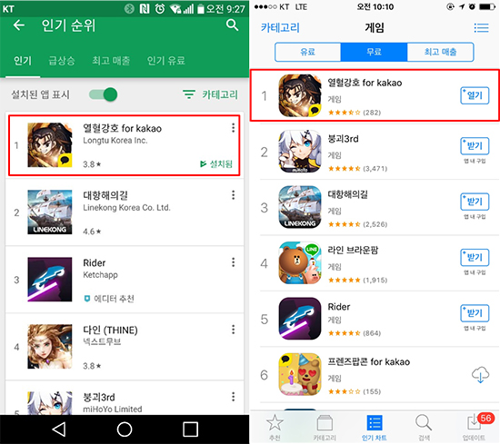 ¼³¸í_Áö³ 24ÀÏ Ãâ½ÃµÈ ¿Ç÷°È£ for kakao°¡ 26ÀÏ ¿ÀÀü, ±¸±Û Ç÷¹ÀÌ ½ºÅä¾î Àαâ 1À§ (ÁÂ), ¾ÖÇà ¾Û½ºÅä¾î Àαâ 1À§(¿ì)¸¦ ±â·ÏÁßÀÌ´Ù. '¿Ç÷°È£ for kakao'´Â Áö³ 24ÀÏ ±¸±Û Ç÷¹ÀÌ¿Í ¾ÖÇà ¾Û½ºÅä¾î¸¦ ÅëÇØ Á¤½Ä Ãâ½ÃµÆ´Ù. »çÀü¿¹¾à¿¡¸¸ 120¸¸ ¸íÀÌ ³Ñ´Â ÀÌ¿ëÀÚ°¡ Âü¿©Çß°í, Ãâ½Ã ÇÏ·ç Àü ½ÃÀÛÇÑ »çÀü ´Ù¿î·Îµå¿¡¼µµ 8½Ã°£ ¸¸¿¡ ¾ÖÇà ¾Û½ºÅä¾î Àαâ 1À§¸¦ ´Þ¼º ÇÏ´Â µî ±â´ëÀÛ ´Ù¿î ¸é¸ð¸¦ º¸¿©Áֱ⵵ Çß´Ù. ȸ»çÃøÀº ¡°¡®¿Ç÷°È£ for kakao¡¯°¡ 24ÀÏ Á¤½Ä Ãâ½Ã µÈÁö 30ºÐµµ ¾ÈµÅ¼ À¯Àú À¯ÀÔÀÌ Å©°Ô ´Ã¸é¼ °ÔÀÓ¿¡ Á¢¼ÓÇÏ·Á´Â ´ë±âÀÚ°¡ ¹ß»ý, ´ë±â¿À» ÃÖ¼ÒÈ Çϱâ À§ÇØ ¼¹ö¸¦ Ãß°¡·Î ¿ÀÇÂÇß´Ù¡±¸ç, ¡°Ãâ½Ã ´ç½Ã 2°³ÀÇ ¼¹ö·Î ½ÃÀÛÇßÁö¸¸ ÇöÀç´Â 11°³ ¼¹ö¸¦ ¿î¿µÁßÀÌ¸ç ¼¹ö Ãß°¡¸¦ Áö¼ÓÇÒ °èȹ¡±À̶ó°í ¼³¸íÇß´Ù. ÀÌ °°Àº Àαâ´Â °ËÁõµÈ °ÔÀÓ¼º°ú ¸¸È ¡®¿Ç÷°È£¡¯ IP ÆÄ¿ö¿¡ ±âÀÎÇÑ´Ù. '¿Ç÷°È£ for kakao'´Â ´©Àû ÆÇ¸ÅºÎ¼ö 600¸¸ºÎ ±â·ÏÀÇ ÀÎ±â¸¸È '¿Ç÷°È£'¿¡¼ ½ÃµµµÇ´Â ÃÖÃÊÀÇ ¸ð¹ÙÀÏ MMORPGÀÌ´Ù. Ç® 3D·Î ±¸ÇöµÈ ±×·¡ÇȰú ¿øÀÛÀÇ ¹¦¹Ì¸¦ »ì¸° Á¤ÆÄ•»çÆÄ°£ ¼¼·ÂÀü, º¸½ºÀü, ÀüÀå µî ¹ÚÁø°¨ ³ÑÄ¡´Â ÀüÅõ¿Í ´Ùä·Î¿î ÀÇ»ó, Å» °Í, ¹®ÆÄ½Ã½ºÅÛ, °áÈ¥½Ã½ºÅÛ µî MMORPG °ÔÀÓ º»¿¬ÀÇ Àç¹Ì¸¦ ´ã°í ÀÖ´Ù. °ÔÀÓÀ» Ç÷¹ÀÌ ÇØ º» À¯Àúµéµµ ¡°Çâ¼ö¸¦ ÀÚ±ØÇÑ´Ù¡±, ¡°¹«Çù MMORPG·Î Ư»öÀÌ Àִµ¥´Ù ÄÜÅÙÃ÷°¡ dz¼ºÇÏ´Ù¡±, ¡°±Í¿±°í ±ôÂïÇÑ ½ºÅ¸ÀÏÀÇ 5µî½Å SD ij¸¯ÅÍ¡±¿¡µµ ¸¸Á·½º·´´Ù´Â ¹ÝÀÀÀÌ´Ù. ÀÌÈ«ÀÇ ·îÅõÄÚ¸®¾Æ °ÔÀÓ»ç¾÷º»ºÎÀåÀº ¡°¸¹Àº ºÐµéÀÇ ±â´ë¿Í ¼º¿ø ¼Ó¿¡ Ãâ½ÃµÈ <¿Ç÷°È£ for kakako>°¡ ÃÊ¹Ý ¿¹»óÀ» ¶Ù¾î³Ñ´Â ¼ºÀûÀ» ±â·ÏÇØ ³»ºÎÀûÀ¸·Îµµ ¸Å¿ì °í¹«ÀûÀÎ »óȲ¡±À̶ó¸ç, ¡°ÄèÀûÇÑ È¯°æ¿¡¼ °ÔÀÓÀ» Áñ±æ ¼ö ÀÖµµ·Ï ¾ÈÁ¤ÀûÀÎ ¼ºñ½º¿¡ ÃÖ¼±À» ´ÙÇϰڴ١±°í ÀüÇß´Ù. ÇÑÆí, '¿Ç÷°È£ for kakao' Á¤½Ä Ãâ½Ã ±â³ä À̺¥Æ®°¡ ÁøÇàÁßÀÌ´Ù. ¿ì¼±, ·±Äª ±â³äÀ¸·Î °ÔÀÓ ¼³Ä¡ ÈÄ 50·¹º§À» ´Þ¼ºÇÏ´Â ÀÌ¿ëÀÚ °¡¿îµ¥ Ãß÷À» ÅëÇØ ¡®»þ³Ú¹é¡¯, ¡®°¶·°½Ã ³ëÆ®8¡¯, ¡®¾ÆÀÌÆùX¡¯ µîÀ» Áö±ÞÇÑ´Ù. ¶Ç, Á¤ÆÄ VS »çÆÄ°£ ¼¼·ÂÀüÀ» ÁøÇàÇϰí ÇØ´ç À̺¥Æ®¿¡ Âü¿©ÇÑ ÀÌ¿ëÀÚÁß Ãß÷À» ÅëÇØ ¡®LG 55ÀÎÄ¡ TV¡¯¿Í ¡®100¸¸¿ø »ó´çÀÇ È¸½Äºñ¡¯¸¦ Áö¿øÇÑ´Ù. ¶Ç, °ø½Ä Ä«Æä¸¦ ÅëÇØ ¿ÀÇ ÃàÇÏ ±ÛÀ» ³²±â´Â ³²±â´Â ÀÌ¿ëÀÚ¿¡°Ô´Â Ãß÷À» ÅëÇØ ¡®»þ¿À¹Ì Àüµ¿ űº¸µå2¡¯¸¦ ÁõÁ¤ÇÑ´Ù. '¿Ç÷°È£ for kakao'´Â ±¸±Û Ç÷¹ÀÌ ½ºÅä¾î¿Í ¾ÖÇà ¾Û ½ºÅä¾î¸¦ ÅëÇØ ´Ù¿î·Îµå ¹ÞÀ» ¼ö ÀÖÀ¸¸ç, °ÔÀÓ°ú À̺¥Æ® µî¿¡ ´ëÇÑ ÀÚ¼¼ÇÑ ³»¿ëÀº '¿Ç÷°È£ for kakao' °ø½Ä Ä«Æä(http://cafe.naver.com/longtuyulgang)¸¦ ÅëÇØ È®ÀÎÇÒ ¼ö ÀÖ´Ù.