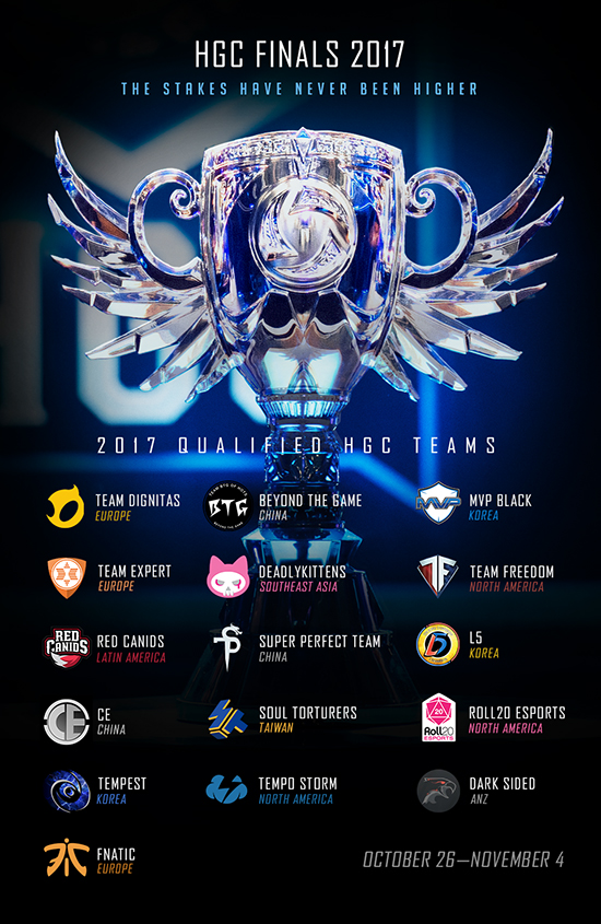 2017 HGCÀÇ È­·ÁÇÑ Çdz¯·¹¸¦ Àå½ÄÇÒ HGC ÆÄÀ̳ÎÀº Çѱ¹(3ÆÀ), ºÏ¹Ì(3ÆÀ), À¯·´(3ÆÀ), Áß±¹(3ÆÀ), ³²¹Ì(1ÆÀ), ¿À¼¼¾Æ´Ï¾Æ(1ÆÀ), ´ë¸¸(1ÆÀ), µ¿³²¾Æ(1ÆÀ) µî Àü ¼¼°è °¢ Áö¿ªÀ» ´ëÇ¥ÇÏ´Â 16°³ ÃÖ°­ ÆÀµéÀÌ ¸ð¿© ÃÑ »ó±Ý 1¹é¸¸ ´Þ·¯¸¦ ³õ°í °Ýµ¹ÇÑ´Ù.