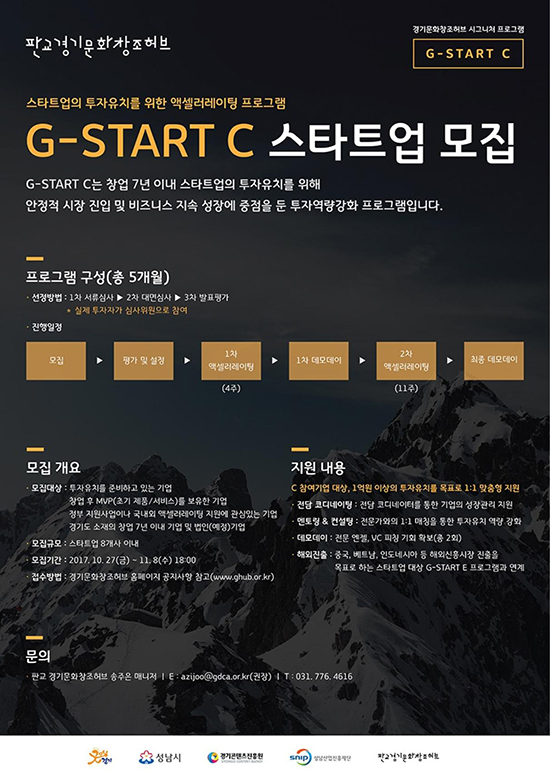 ½ºÅ¸Æ®¾÷ À°¼º ½Ã¼³ ¡®ÆÇ±³ °æ±â¹®ÈâÁ¶Çãºê¡¯¸¦ ÅëÇØ ÁøÇàÇÏ´Â ¡®G-START C¡¯ ÇÁ·Î±×·¥Àº »ç¾÷ ¾ÆÀÌÅÛ°ú ºñÁî´Ï½º ¸ðµ¨À» ¹ßÀü½ÃÄÑ ÅõÀÚÀ¯Ä¡ °¡´É¼ºÀ» ³ôÀÌ´Â µ¥ ÃÊÁ¡À» ¸ÂÃè´Ù. ¶ÇÇÑ Àü´ã ÄÚµð³×ÀÌÅÍ ¹× Àü¹®°¡ÀÇ 1:1 ¸ÂÃã °ü¸®·Î Âü¿©±â¾÷ÀÇ ¼º°øÀûÀÎ ½ÃÀåÁøÀÔ°ú ºñÁî´Ï½ºÀÇ ¼ºÀåÀ» À§ÇÑ ¾×¼¿·¯·¹ÀÌÆÃÀ» ÁøÇàÇÑ´Ù.