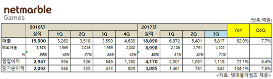 Áö³ÇØ ¿¬°£ ¸ÅÃâ 1Á¶5000¾ï¿øÀ» ±â·ÏÇÑ ³Ý¸¶ºíÀÌ 3ºÐ±â ´©Àû ¸ÅÃâ 1Á¶8000¾ï¿øÀ» ´Þ¼ºÇØ ¿¬°£ ¸ÅÃâ 2Á¶¿ø ½Ã´ë¸¦ ´« ¾Õ¿¡ µ×´Ù. 7ÀÏ ³Ý¸¶ºí°ÔÀÓÁî(ÀÌÇÏ ³Ý¸¶ºí)´Â Áö³ 3ºÐ±â(7~9¿ù) ¿¬°á±âÁØÀ¸·Î ¸ÅÃâ 5,817¾ï¿ø, ¿µ¾÷ÀÌÀÍ 1,118¾ï¿ø, ´ç±â¼øÀÌÀÍ 842¾ï¿øÀ» ±â·ÏÇß´Ù°í ¹àÇû´Ù. ÀÌ´Â Àü³â °°Àº ±â°£º¸´Ù °¢°¢ 62.0%, 73.1%, 104.1% Áõ°¡ÇÑ ¼öÄ¡¸ç, Áö³ 2ºÐ±â º¸´Ùµµ °¢°¢ 7.7%, 6.4%, 7.8% ´Ã¾î³ ¼öÄ¡´Ù. Áö³ 3ºÐ±â ÇØ¿Ü ¸ÅÃâÀº 4,102¾ï¿ø(Àüü ¸ÅÃâ ´ëºñ 71%)À¸·Î ºÐ±â ±âÁØ »ç»ó ÃÖ°íÄ¡¸¦ °æ½ÅÇß´Ù. ÀÌ´Â Áö³ 6¿ù°ú 8¿ù °¢°¢ ¾Æ½Ã¾Æ(11°³±¹), ÀϺ»¿¡¼ Ãâ½ÃÇÑ ¡®·¹º¼·ç¼Ç¡¯ÀÌ ÇöÁö¿¡¼ ³ôÀº Àα⸦ ±â·ÏÇ߱⠶§¹®ÀÌ´Ù. ¶Ç, ºÏ¹Ì ÀÚȸ»ç Ä«¹ã(Kabam)ÀÇ ¡®¸¶ºí ¿Ã½ºÅ¸ ¹èƲ(MARVEL Contest of Champions)¡¯ÀÌ Áö³ 7¿ù ¹Ì±¹ ¾Û½ºÅä¾î ¸ÅÃâ 1À§¸¦ ±â·ÏÇÏ´Â µî ÁÖ¿ä ÇØ¿Ü Ãâ½ÃÀÛÀÌ ³ôÀº ¼º°ú¸¦ °Åµ×´Ù. ³Ý¸¶ºí ±Ç¿µ½Ä ´ëÇ¥´Â ¡°·¹º¼·ç¼ÇÀº ¼¼°è °ÔÀÓ½ÃÀå 2À§ ±Ô¸ðÀÎ ÀϺ»À» ºñ·ÔÇØ ¾Æ½Ã¾Æ 11°³±¹¿¡¼ Ãâ½Ã Á÷ÈĺÎÅÍ Áö±Ý±îÁö ³ôÀº Àα⸦ ´©¸®°í ÀÖÀ¸¸ç, Ä«¹ã°ú Àë½ÃƼ µî ºÏ¹Ì ÀÚȸ»çÀÇ ÁÖ¿äÀÛÀÌ °ßÁ¶ÇÑ ¸ÅÃâÀ» ¿Ã¸®°í ÀÖ¾î ÇØ¿Ü ¸ÅÃâÀÌ Å« ÆøÀ¸·Î Áõ°¡Çß´Ù¡±¸ç ¡°4ºÐ±â¿¡´Â ·¹º¼·ç¼ÇÀ» ºÏ¹Ì, À¯·´ µî 54°³±¹¿¡ Ãâ½ÃÇϰí, ±¹³»¿¡´Â ·¹º¼·ç¼ÇÀ» ÀÌÀ» ´ëÀÛ ¸ð¹ÙÀÏ MMORPG ¡®Å×¶óM¡¯À» ³»³õÀ» ¿¹Á¤ÀÌ¾î¼ ±â´ë°¨ÀÌ ³ô´Ù¡±°í ¸»Çß´Ù. ÇÑÆí, ³Ý¸¶ºíÀº ¿À´Â 11¿ù 15ÀÏ ·¹º¼·ç¼ÇÀ» ºÏ¹Ì, À¯·´, ¿À¼¼¾Æ´Ï¾Æ, Áßµ¿ Áö¿ªÀÇ 54°³±¹¿¡ Ãâ½ÃÇÑ´Ù. ±¹³»¿¡´Â ¿À´Â 11¿ù 21ÀÏ¿¡´Â ¸ð¹ÙÀÏ ½ºÅ丮 ¼öÁýÇü RPG ¡®ÆäÀÌÆ®/±×·£µå ¿À´õ(Fate/Grand Order)¡¯¸¦ Ãâ½ÃÇϰí, 11¿ù 28ÀÏ¿¡´Â ´ëÀÛ ¸ð¹ÙÀÏ MMORPG ¡®Å×¶óM¡¯À» ¼±º¸ÀÏ °èȹÀÌ´Ù.